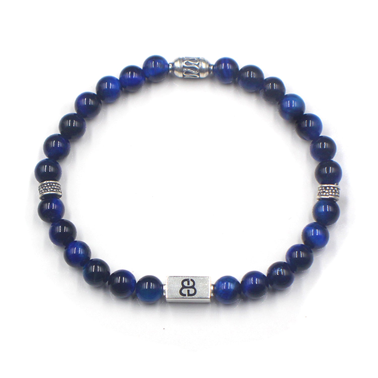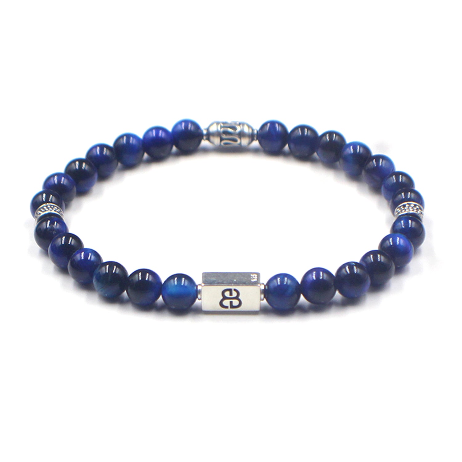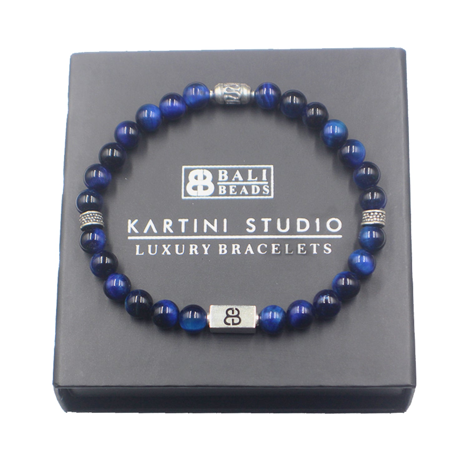 This bracelet features 6mm blue tiger's eye beads accented with three handmade sterling silver beads and a sterling silver "Bali Beads" logo bead.