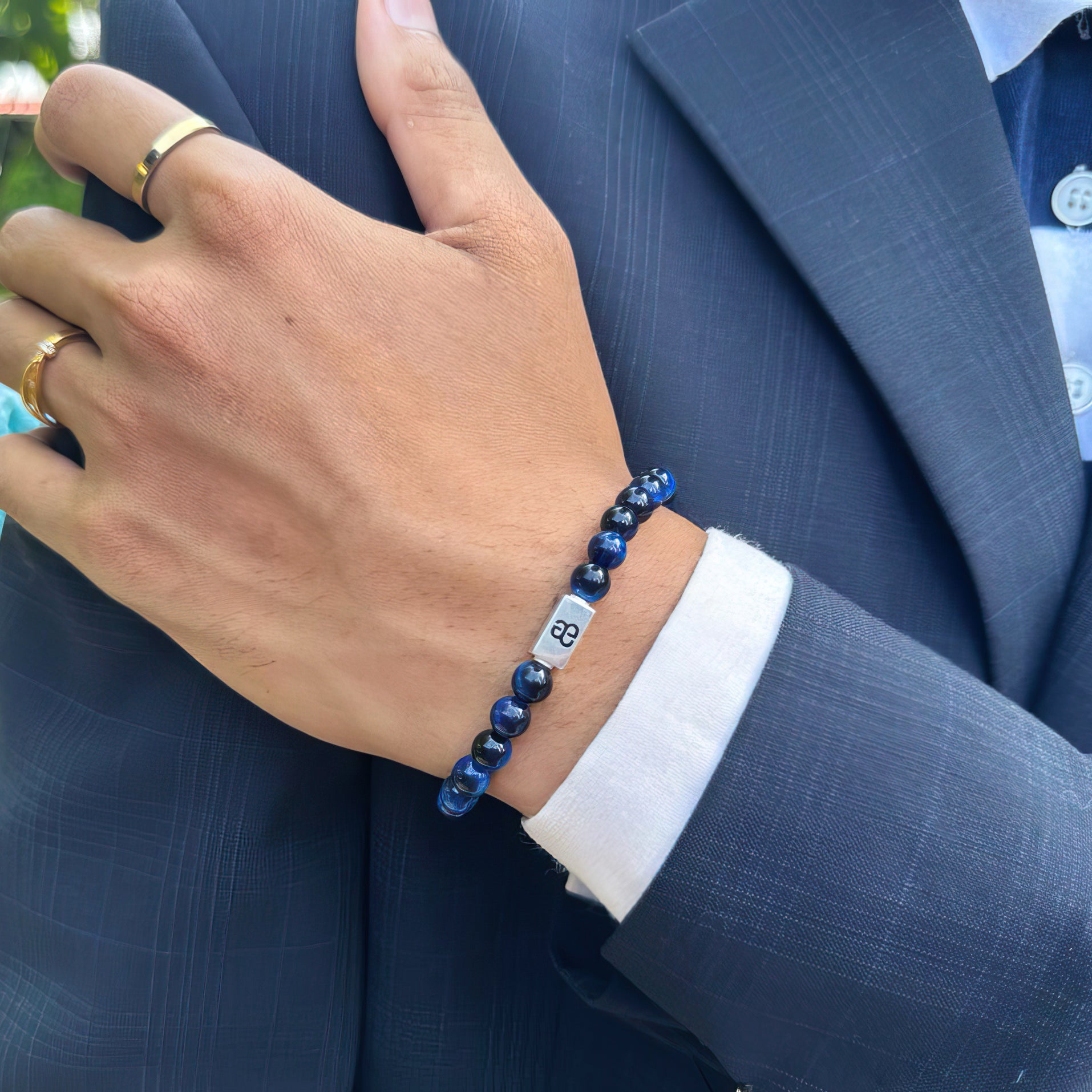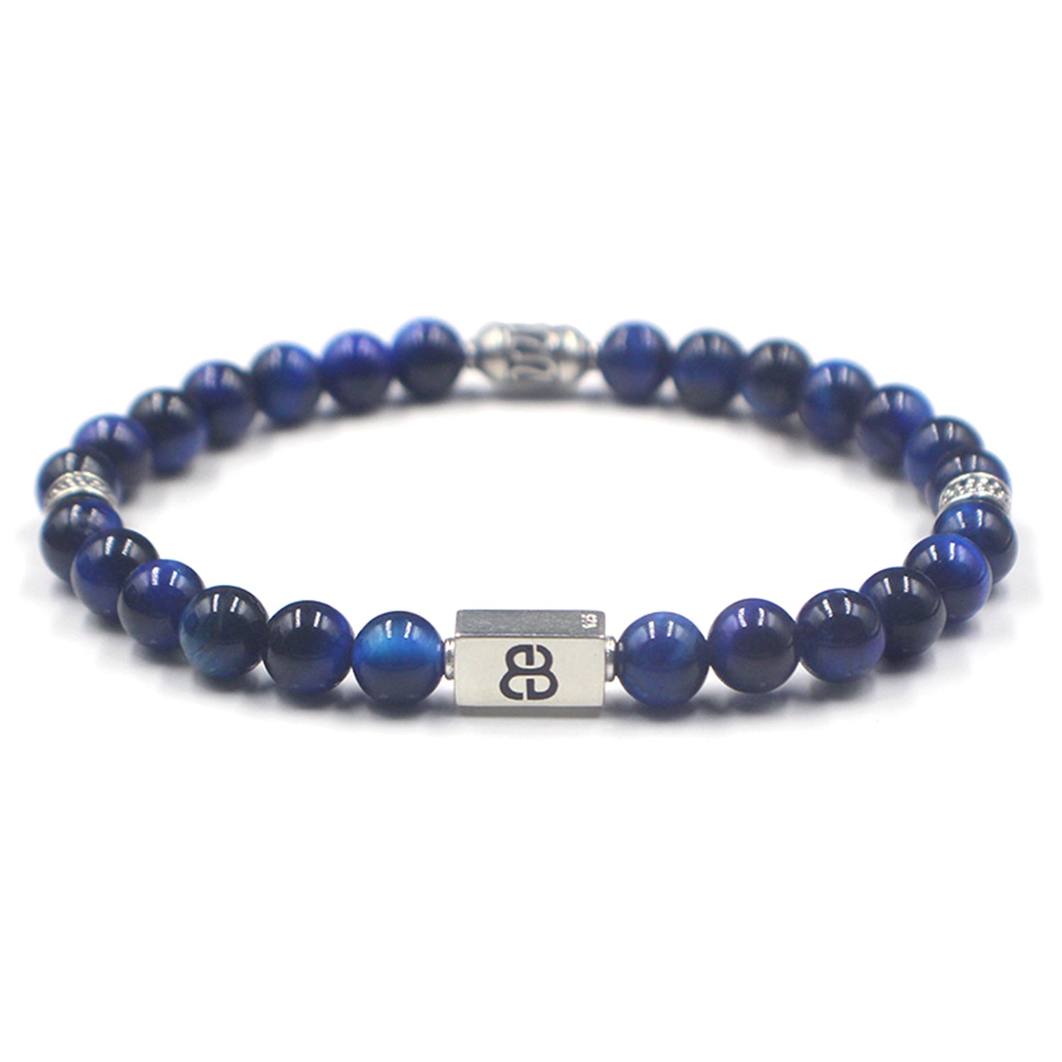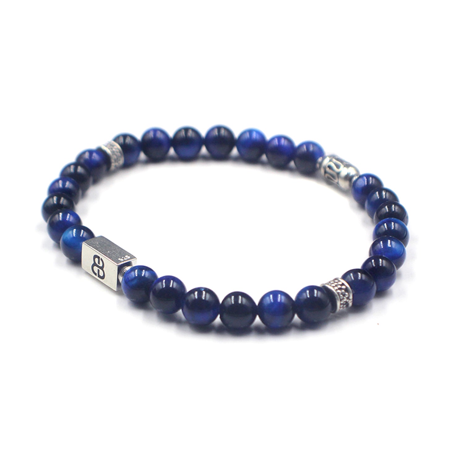 This bracelet features 6mm blue tiger's eye beads accented with three handmade sterling silver beads and a sterling silver "Bali Beads" logo bead.