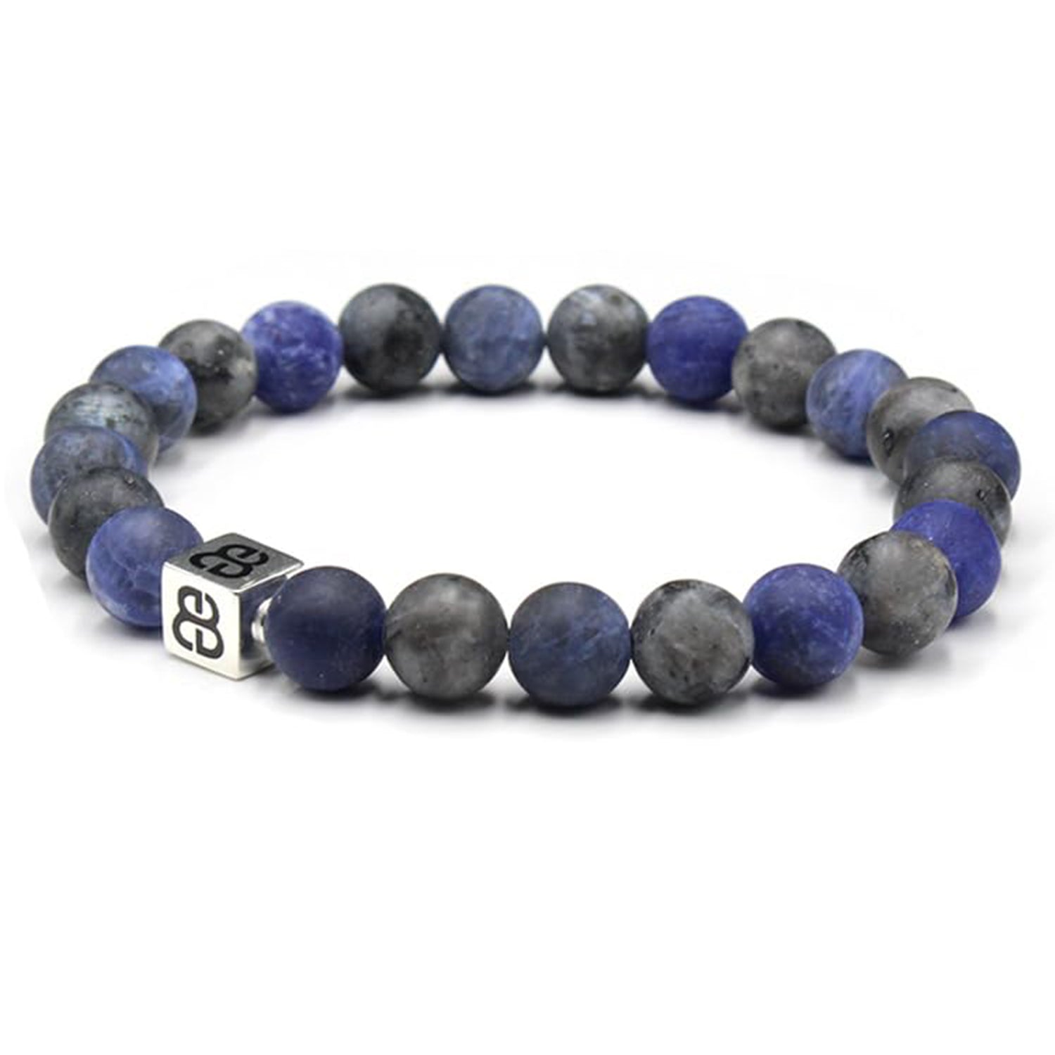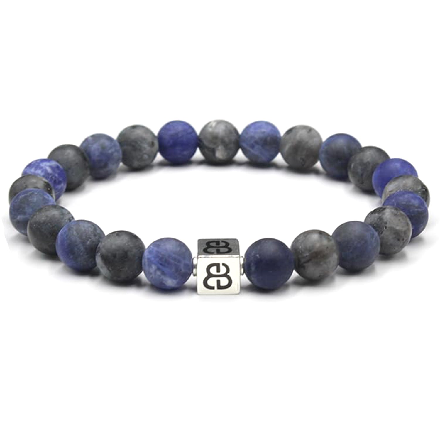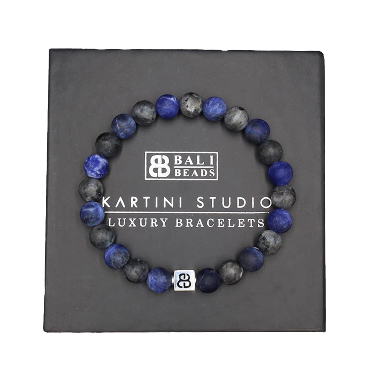This bracelet features 8mm matte sodalite beads and 8mm matte labradorite beads accented with a 8mm x 8mm solid sterling silver "Bali Beads" logo bead.