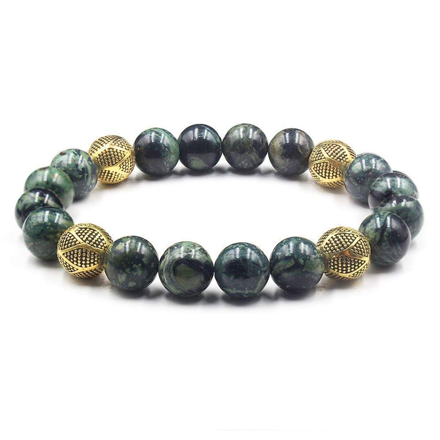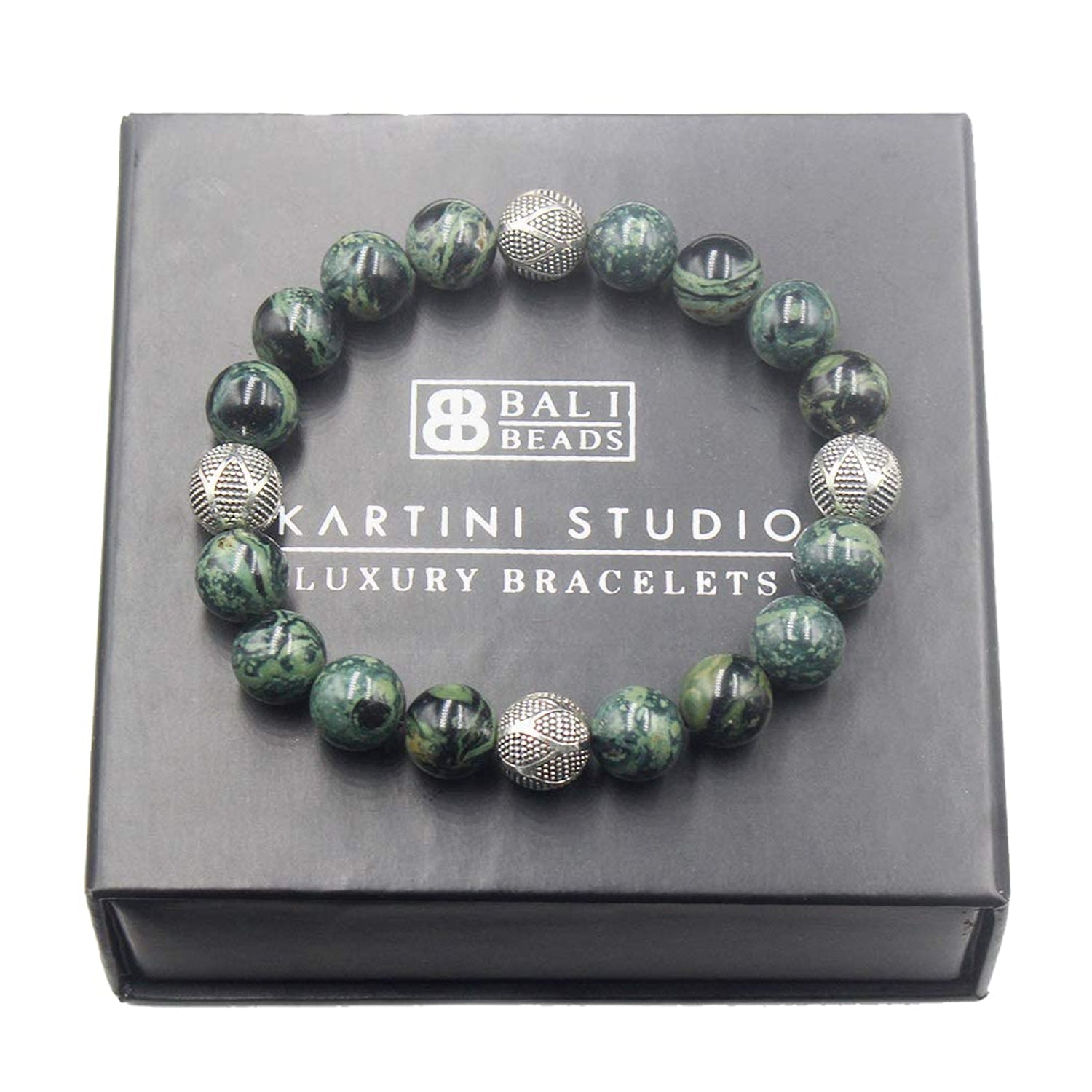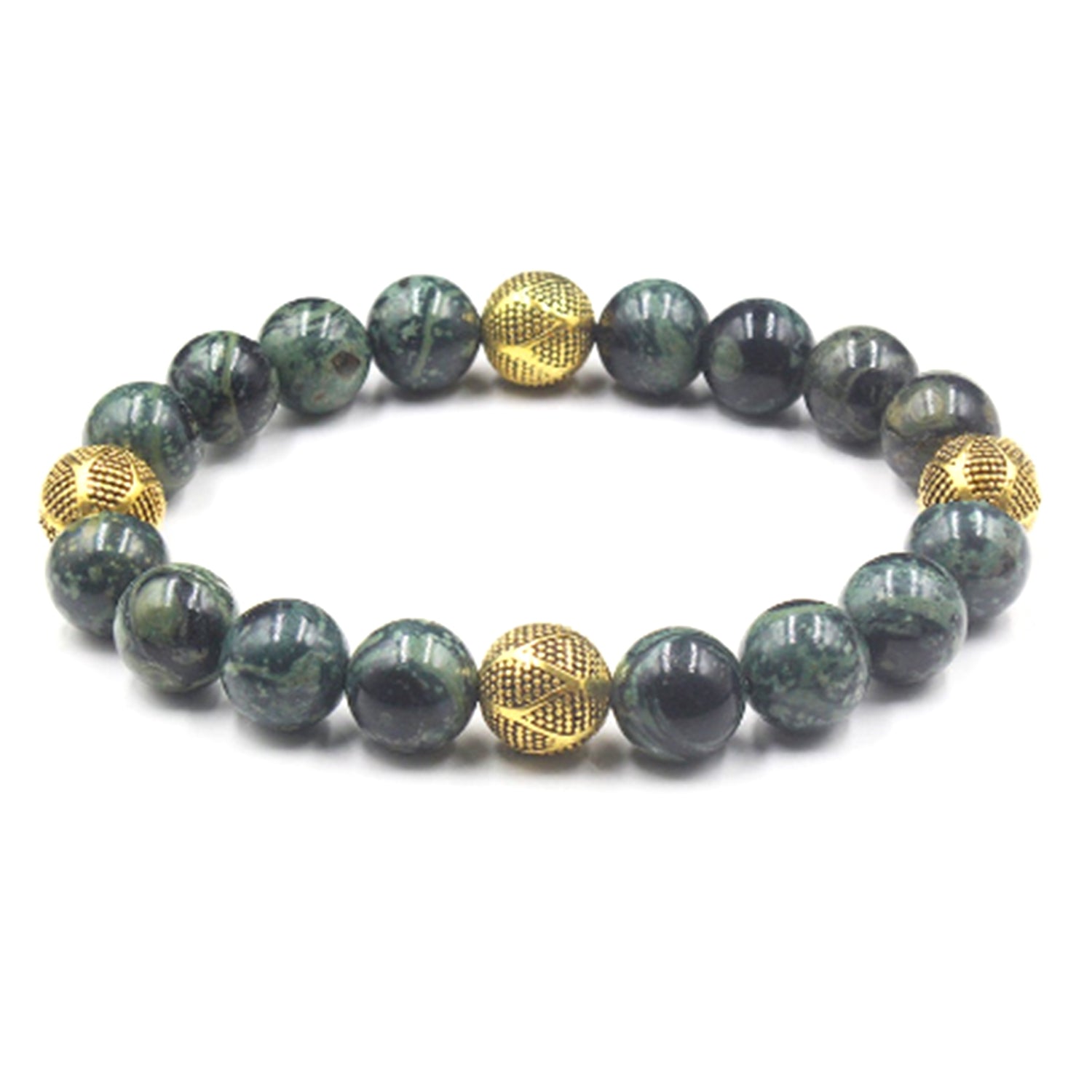 This bracelet features 10mm nephrite jade beads accented with four 10mm 22 karat gold plated sterling silver Bali beads.