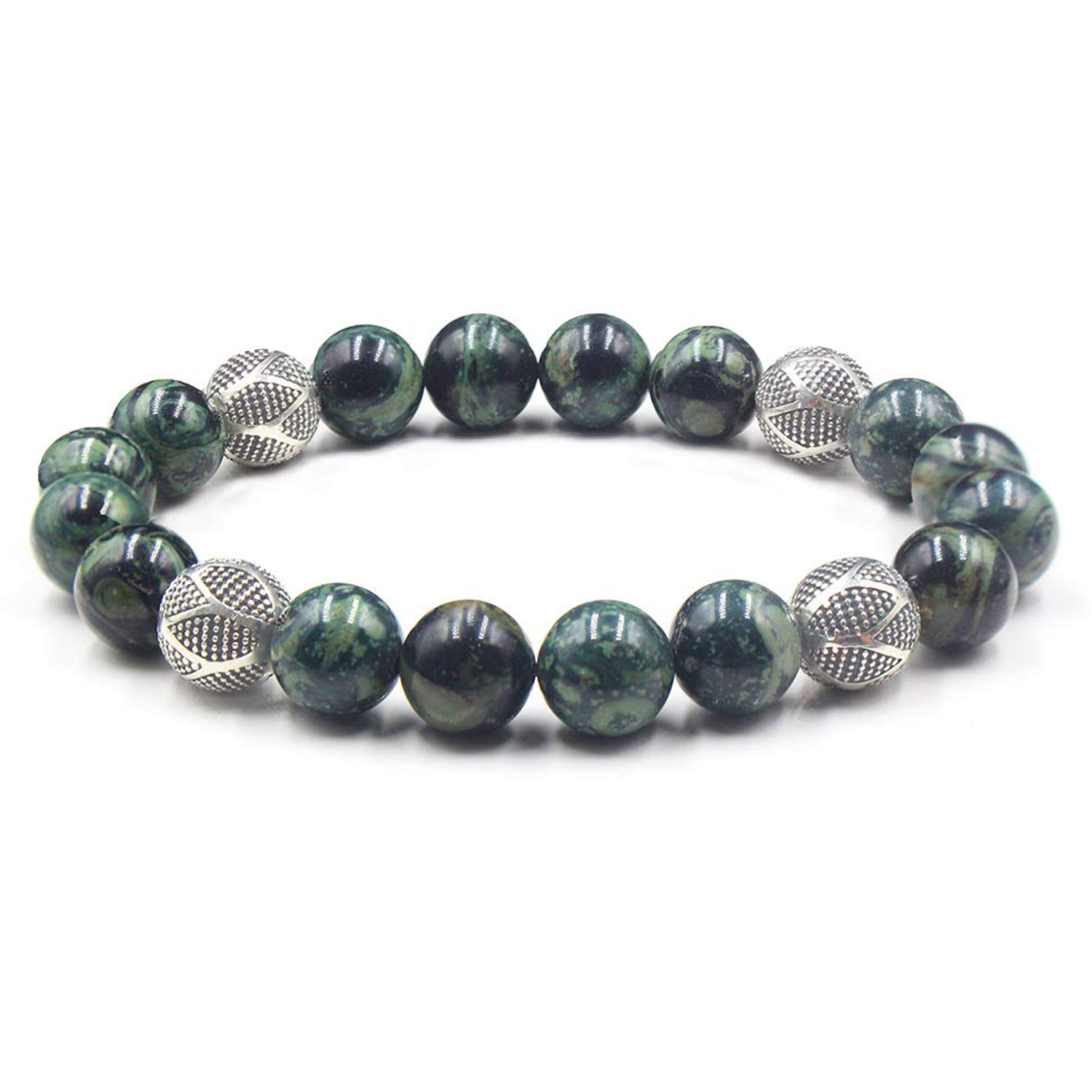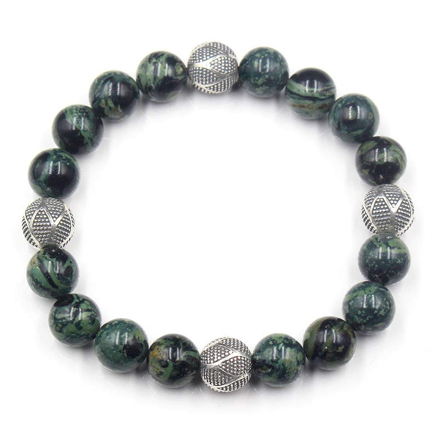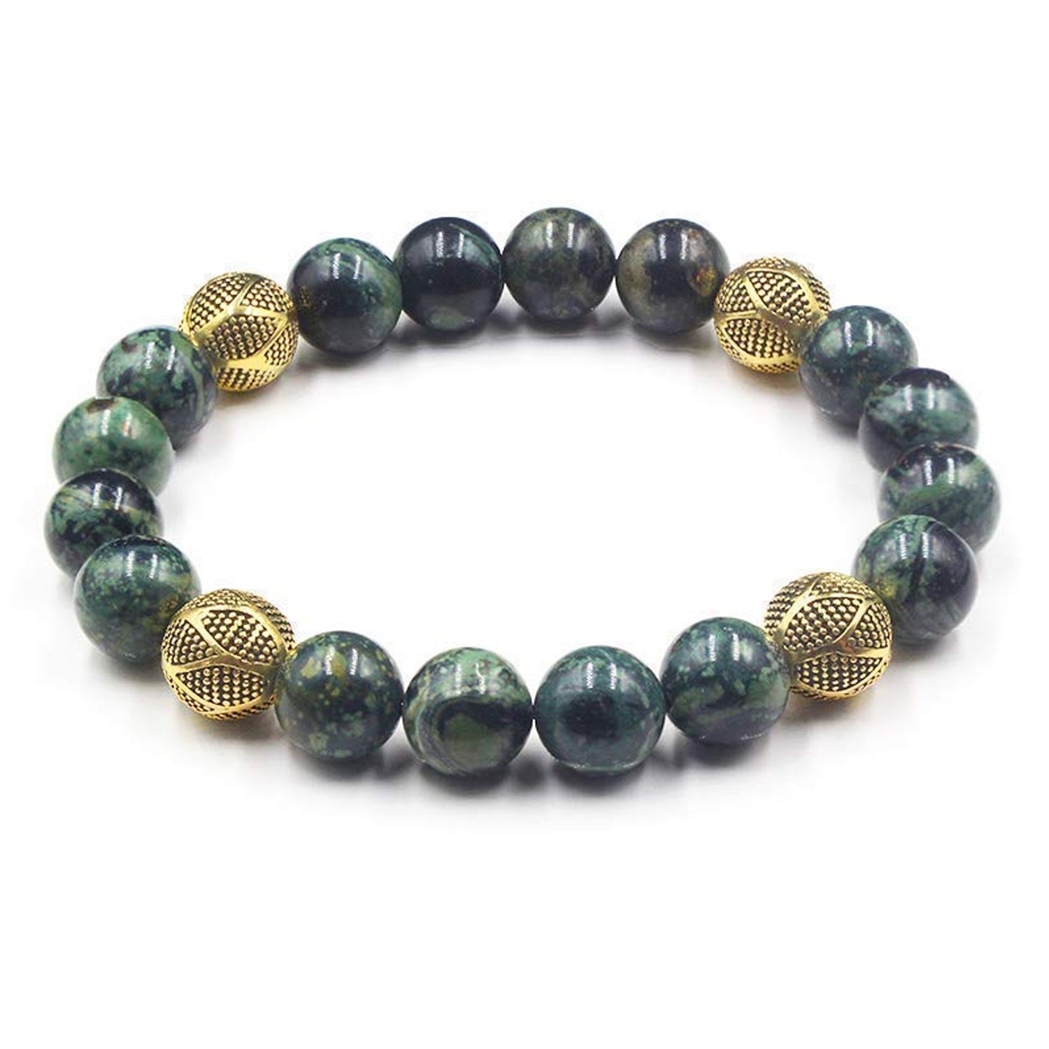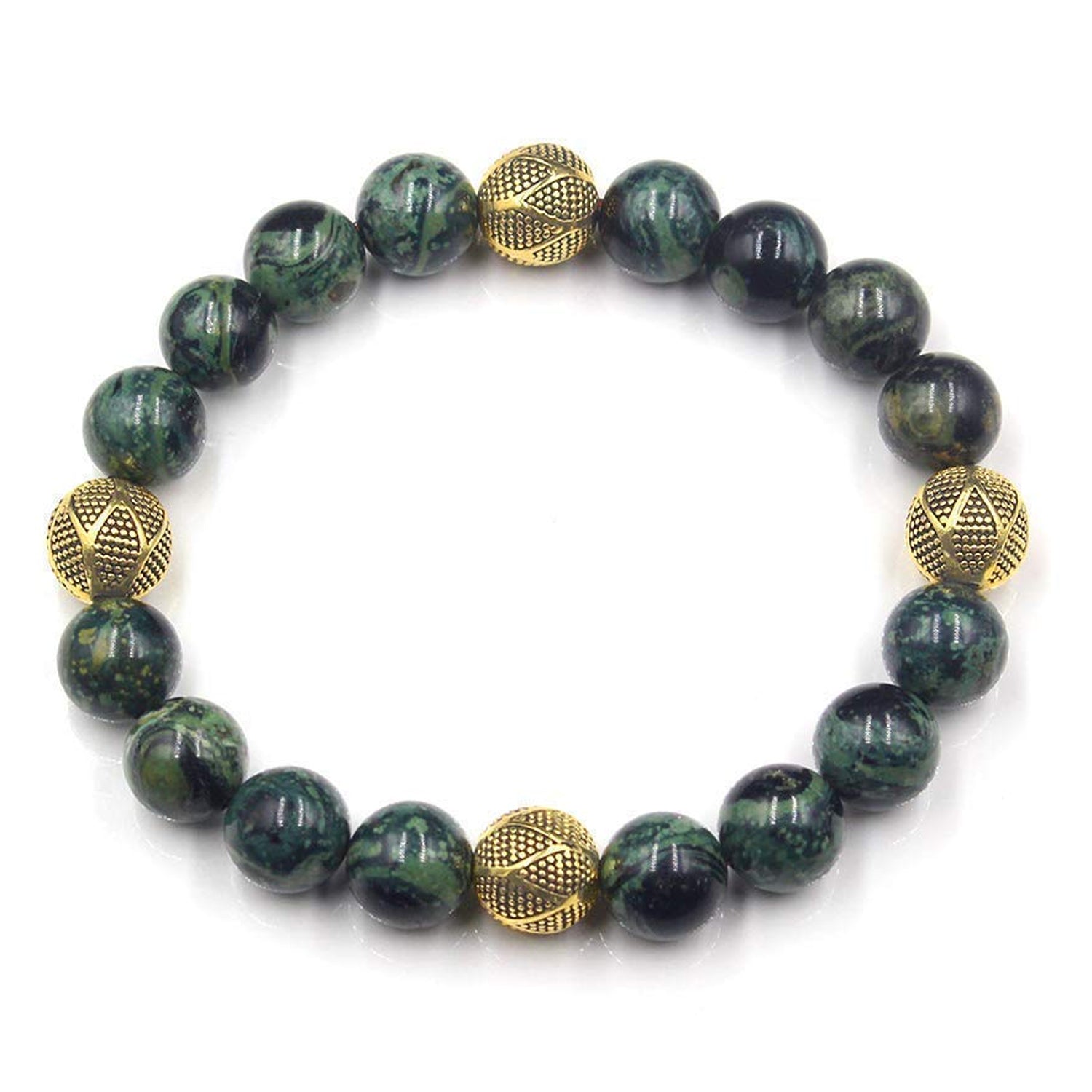 This bracelet features 10mm nephrite jade beads accented with four 10mm 22 karat gold plated sterling silver Bali beads.