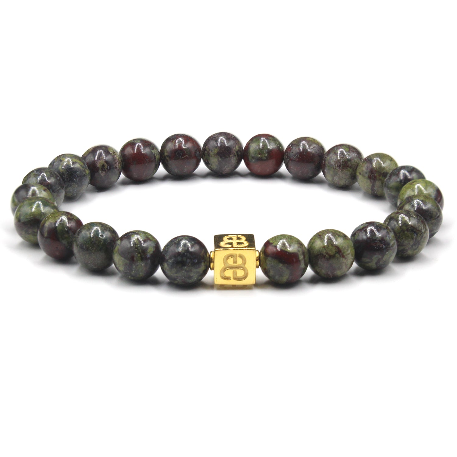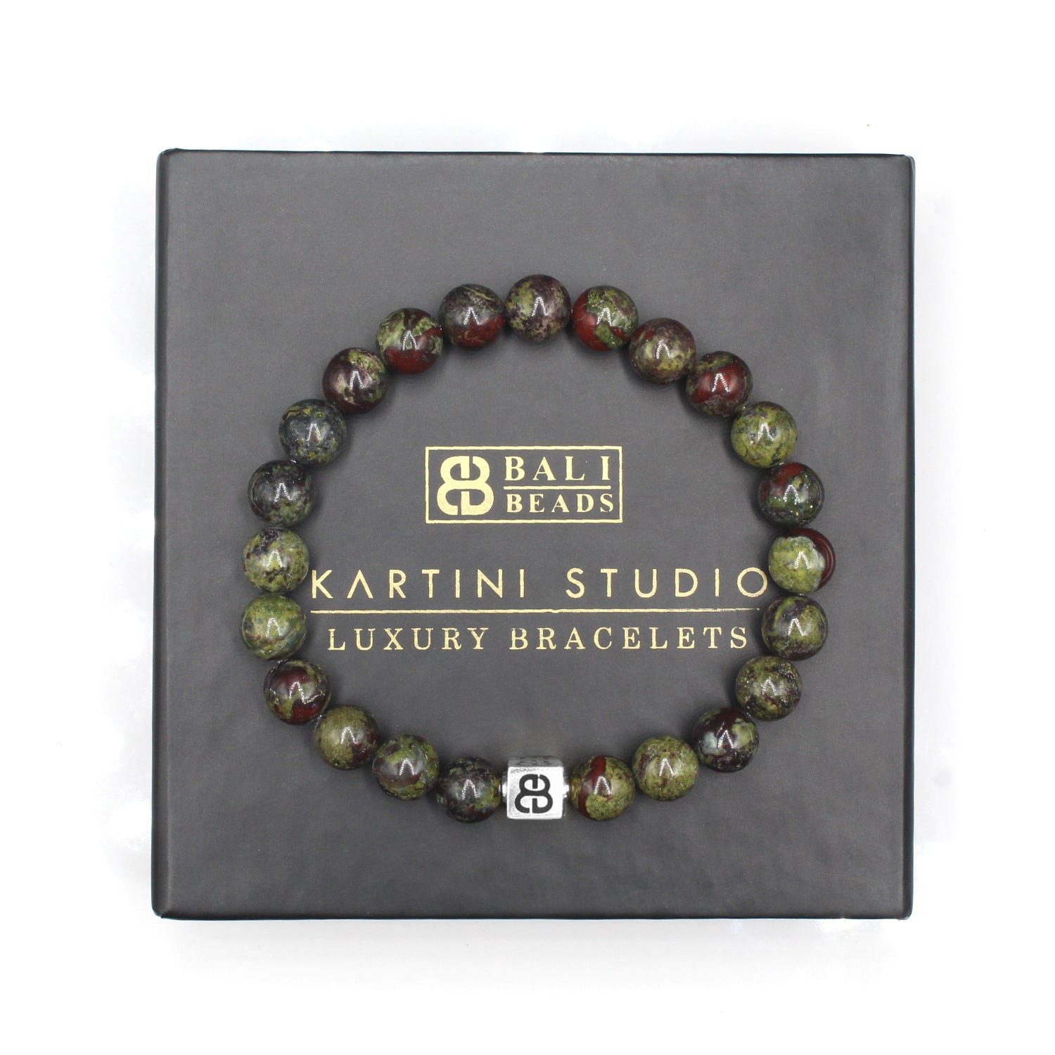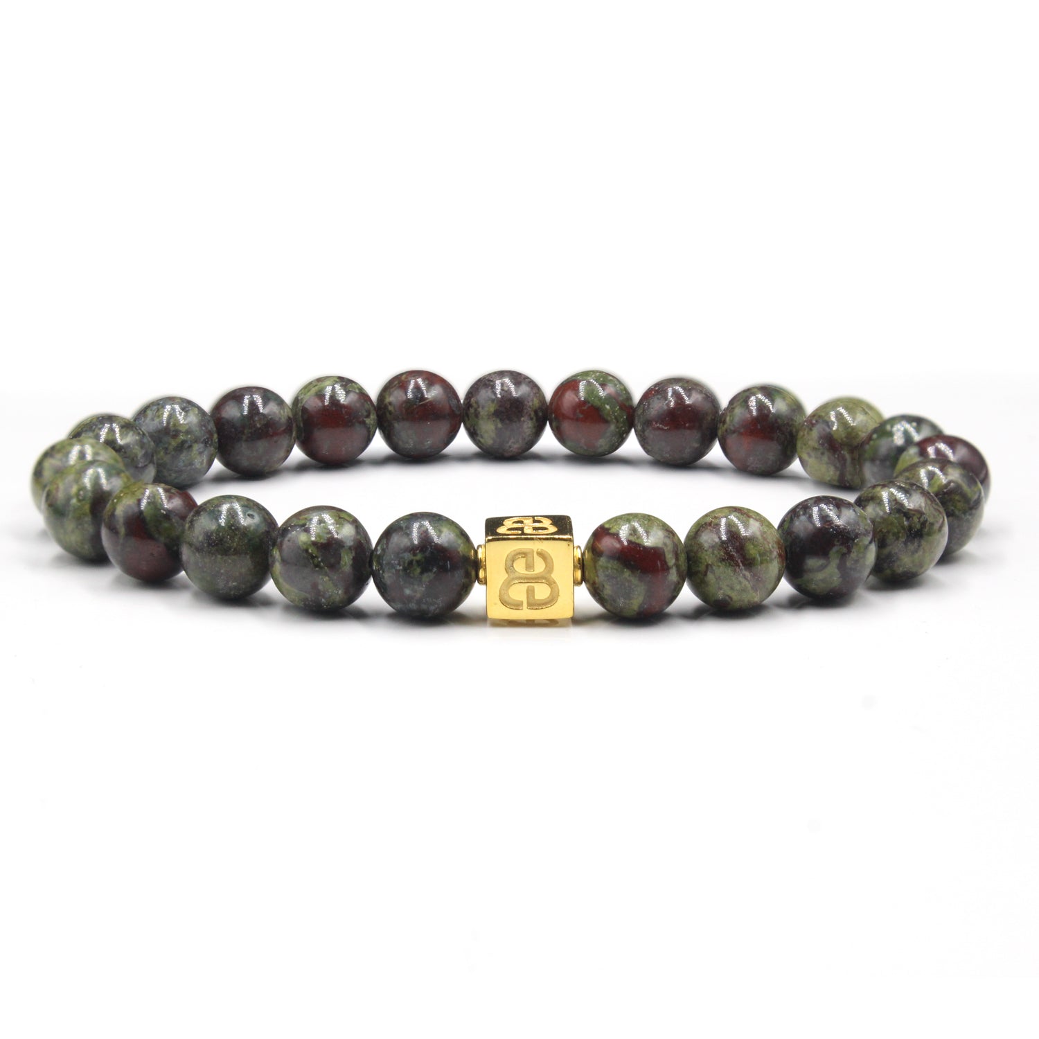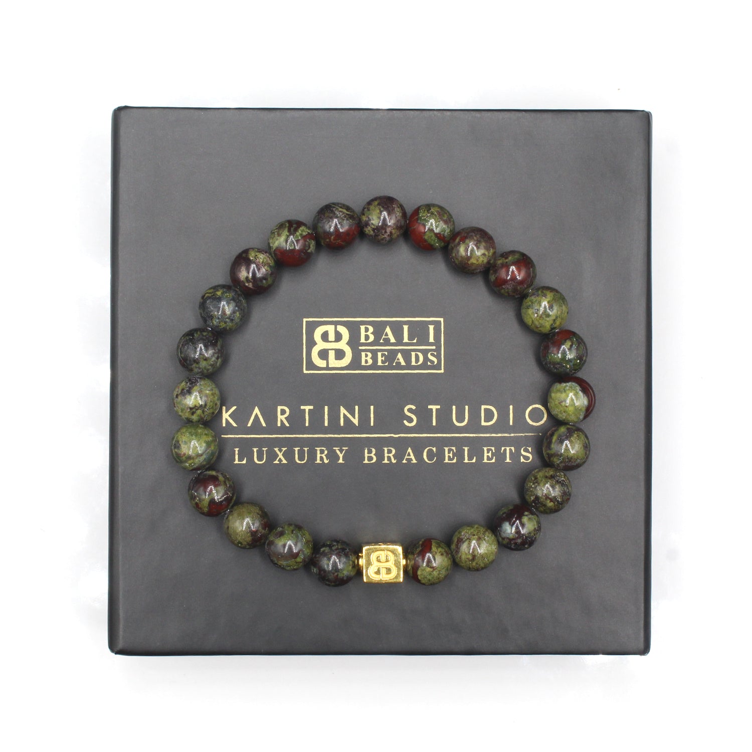 This bracelet features 8mm dragon blood stone beads accented with a 8mm x 8mm 22 karat gold vermeil "Bali Beads" logo bead.