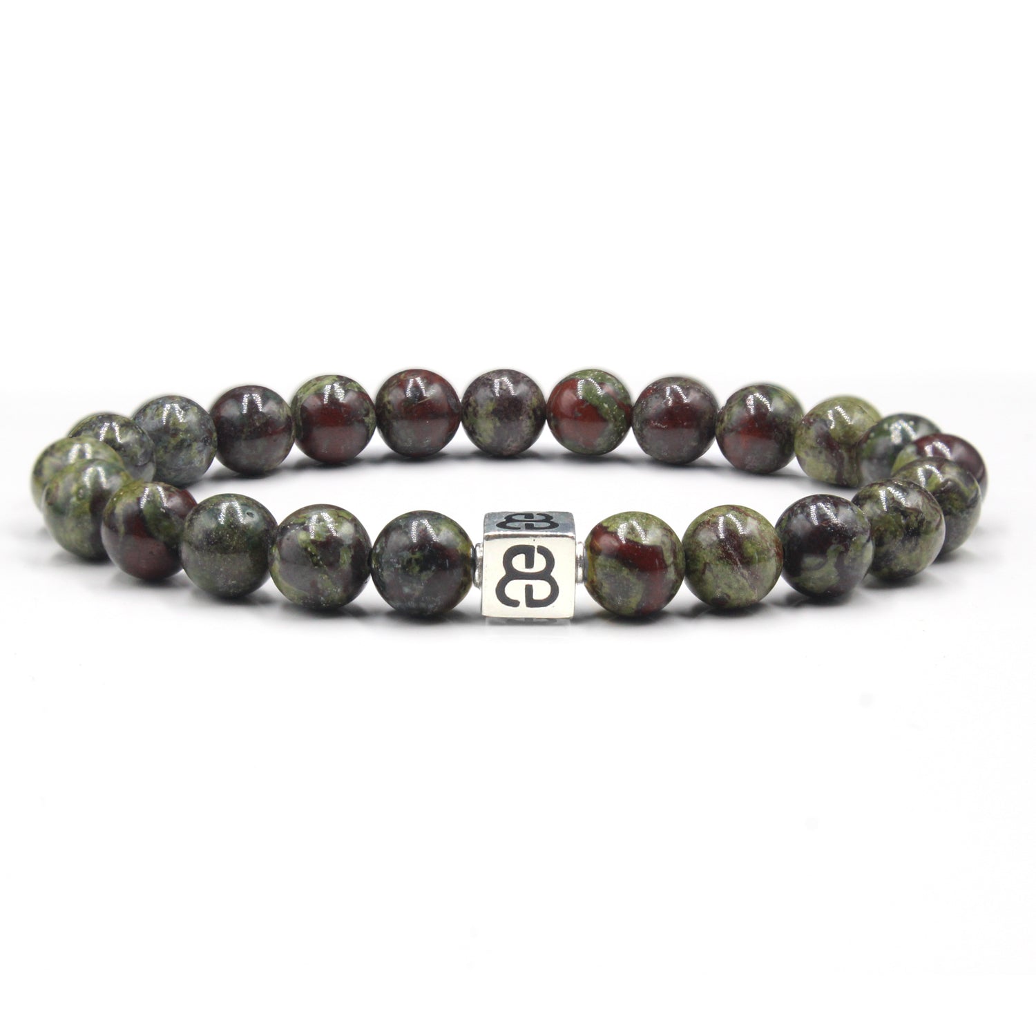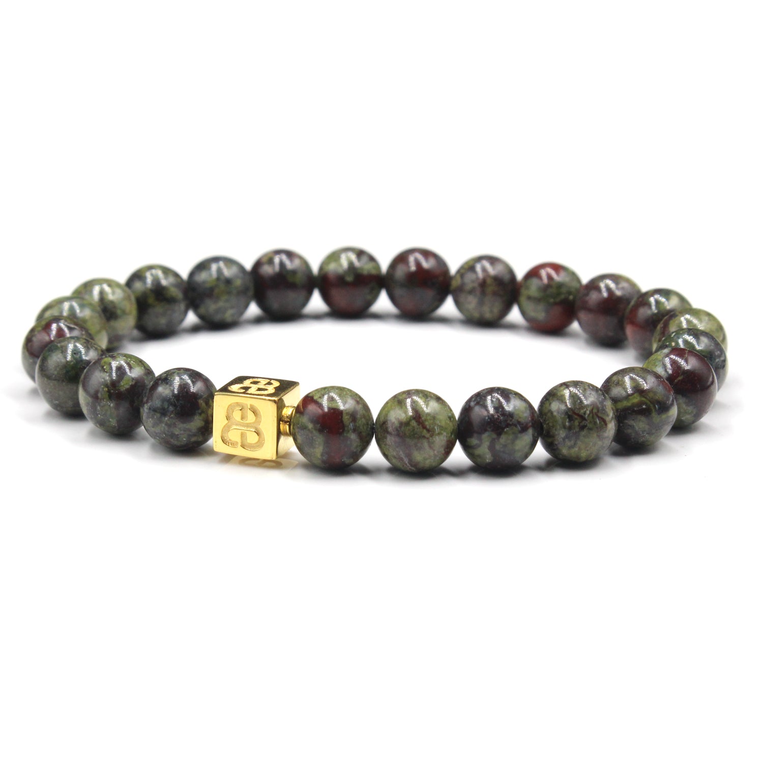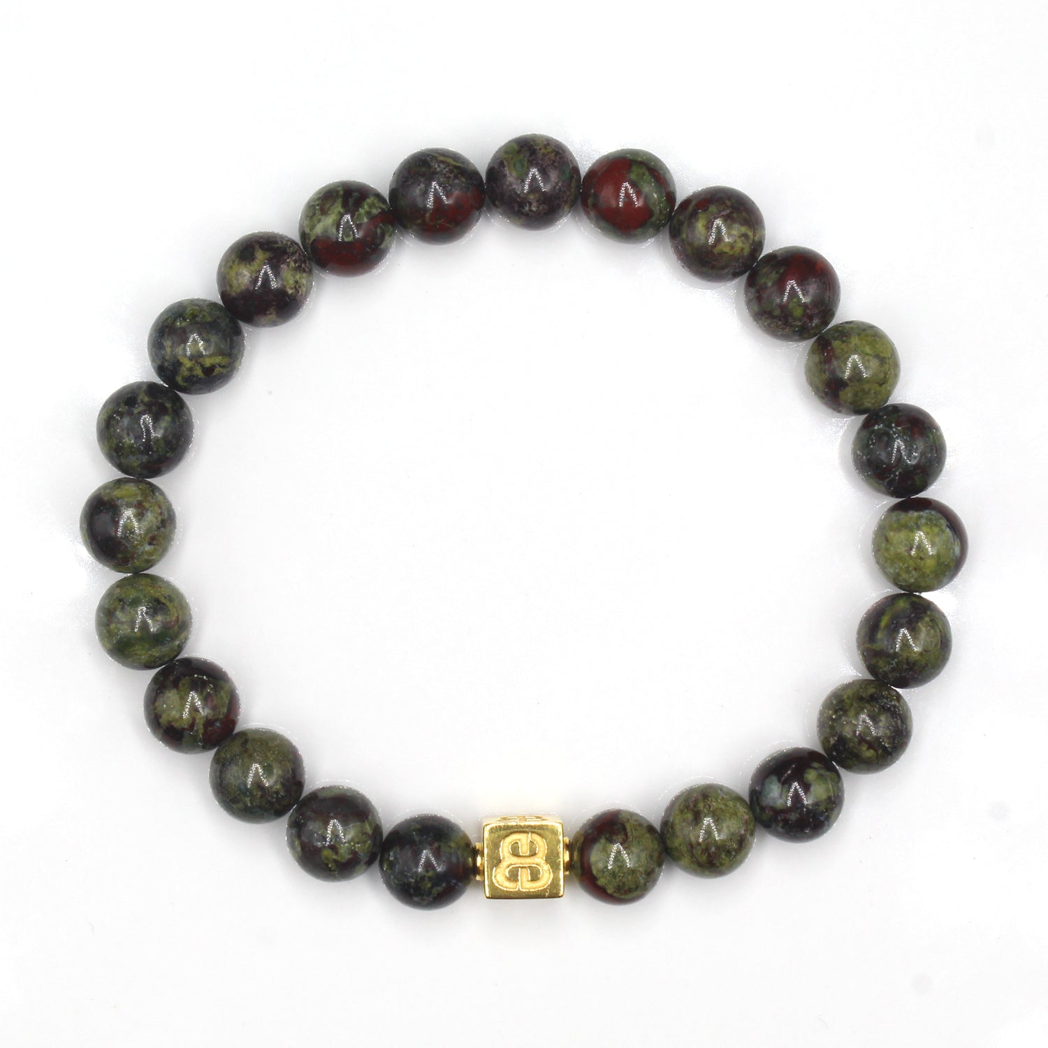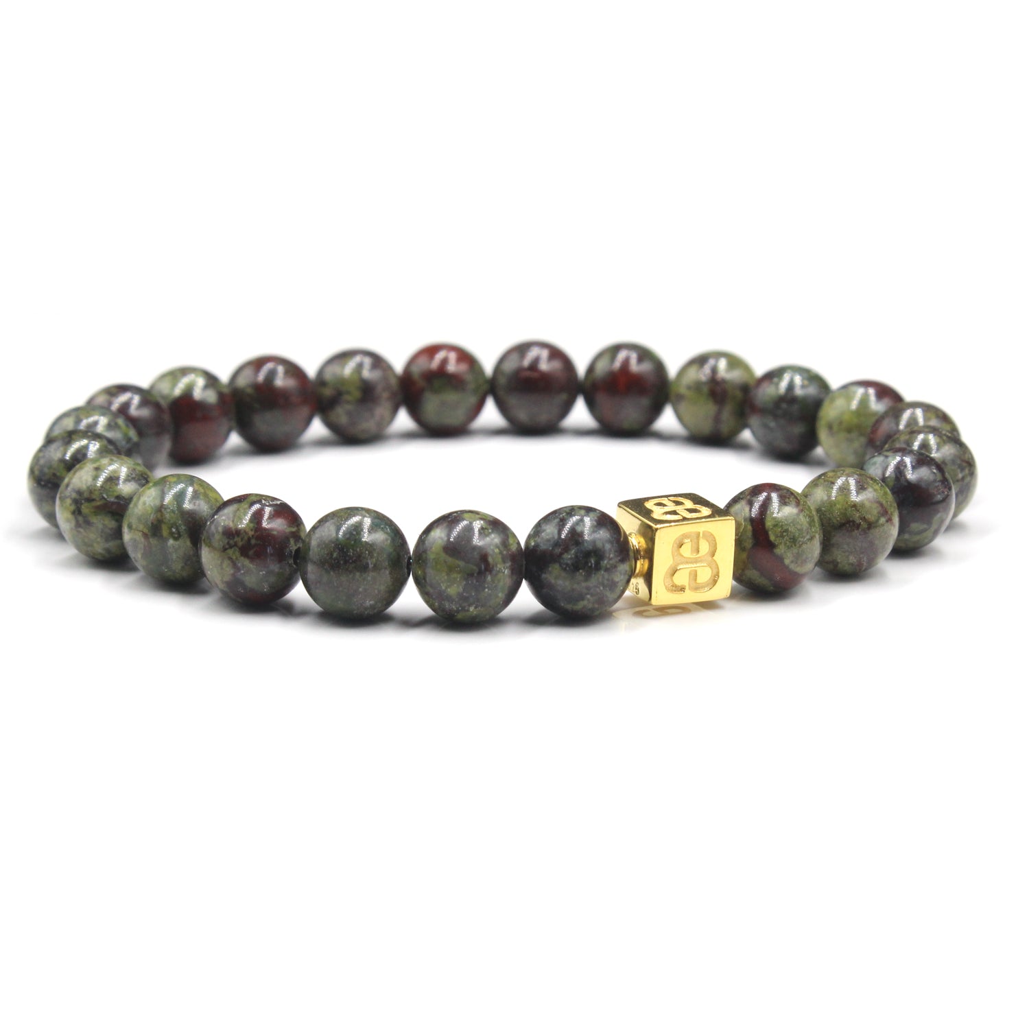 This bracelet features 8mm dragon blood stone beads accented with a 8mm x 8mm 22 karat gold vermeil "Bali Beads" logo bead.