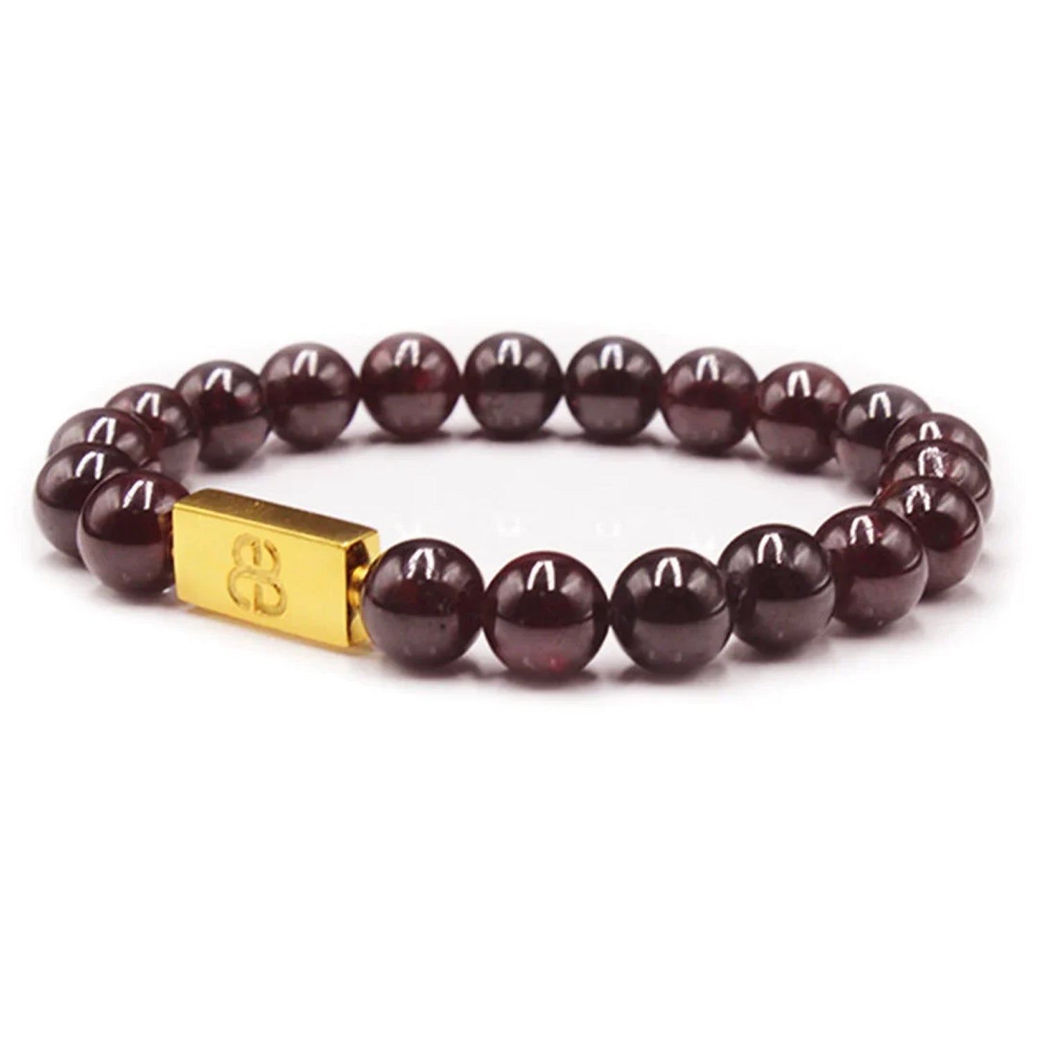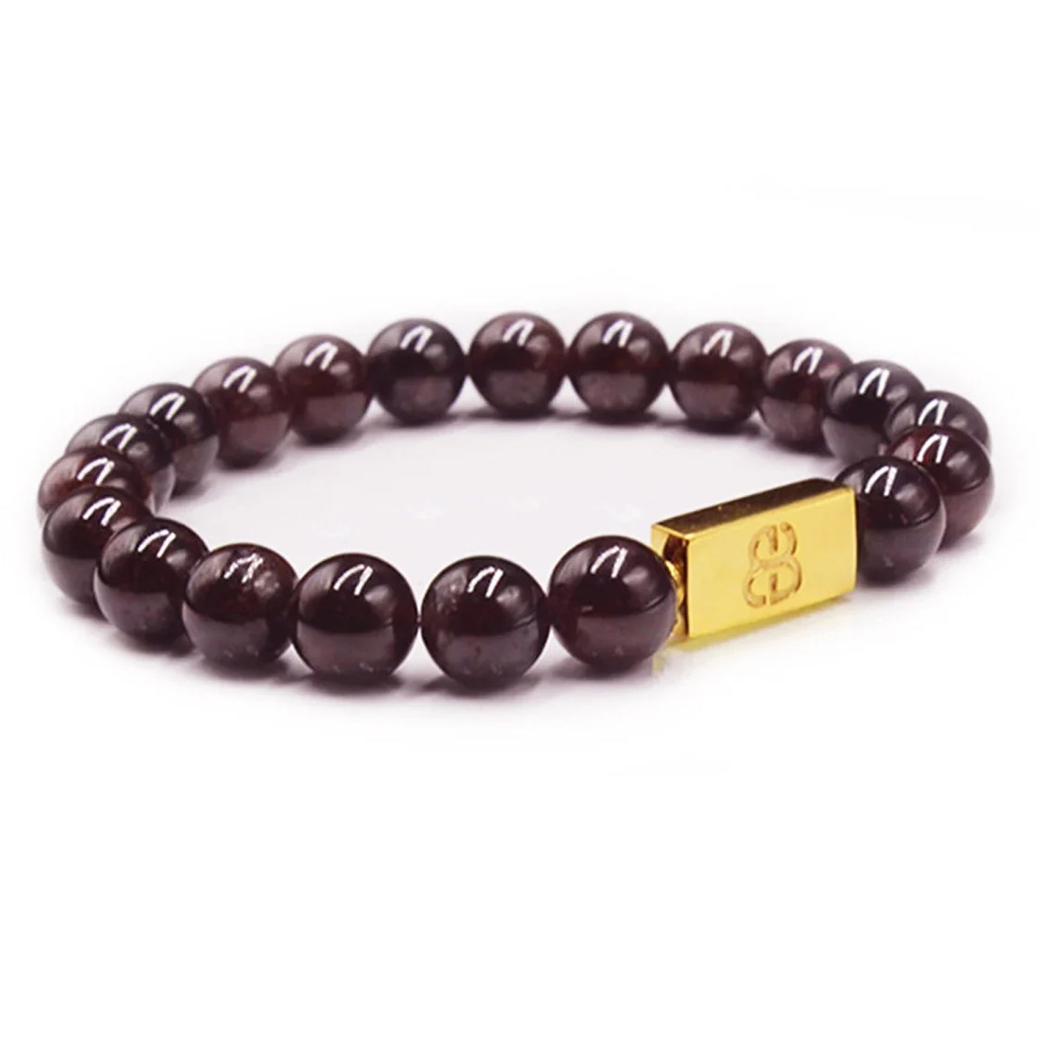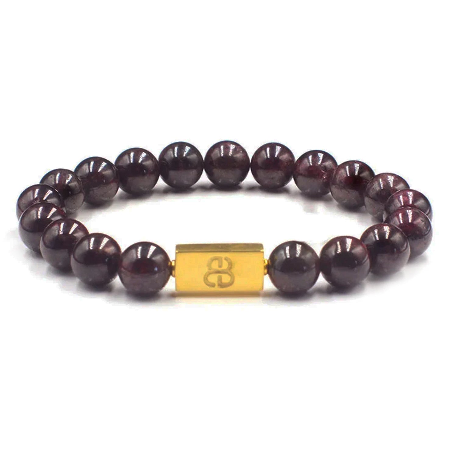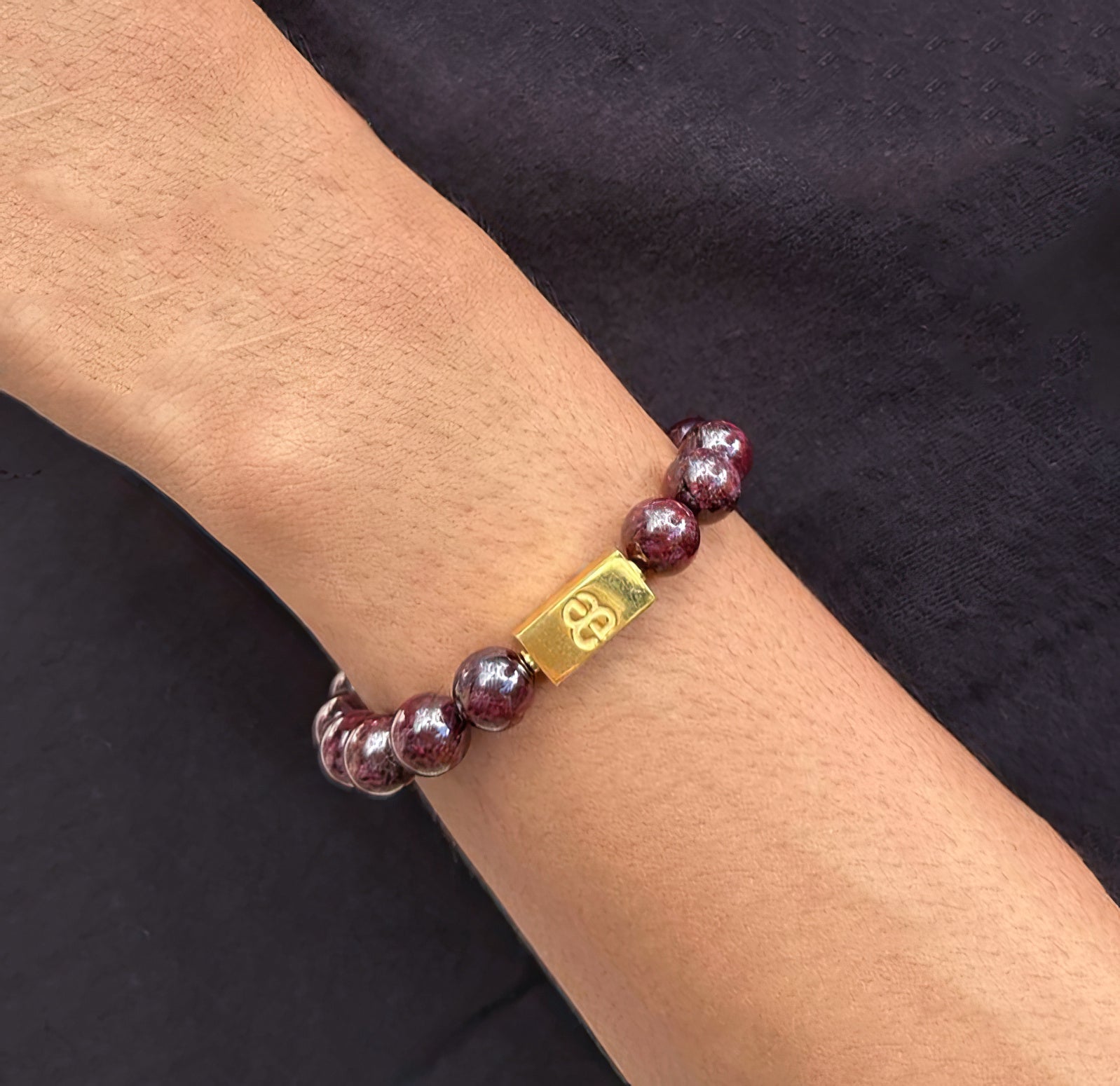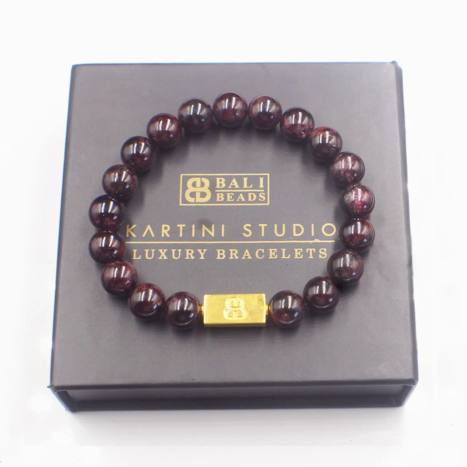 This bracelet features 10mm garnet stone beads accented with a 16mm x 8mm 22 karat gold plated sterling silver " Bali Beads" logo bead.