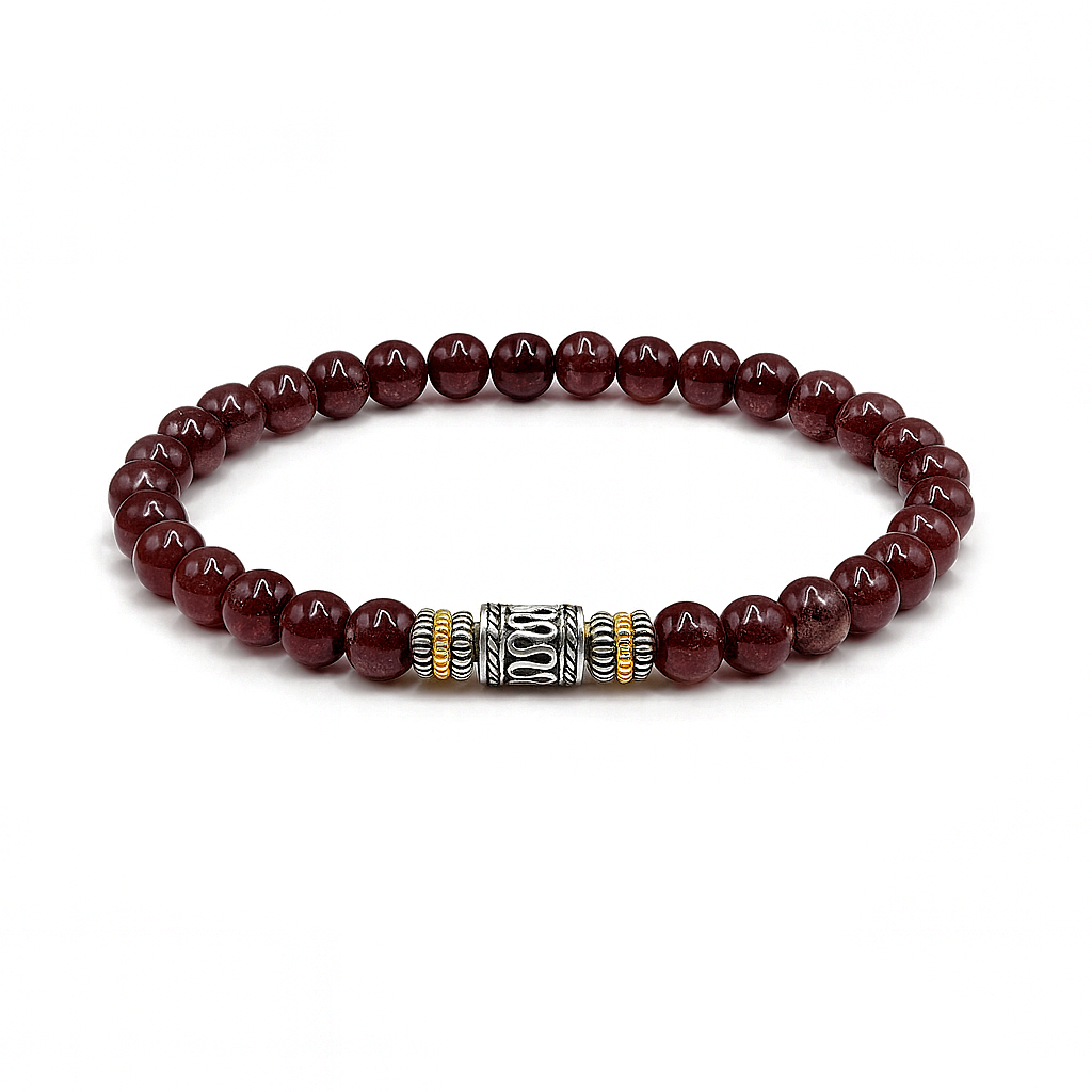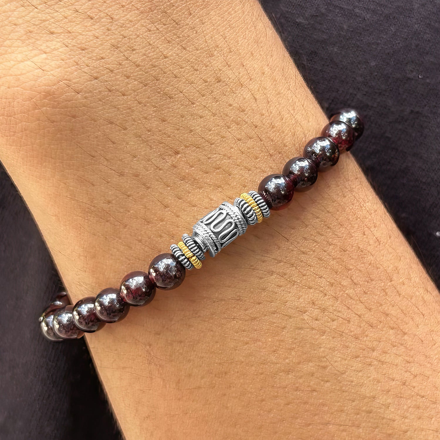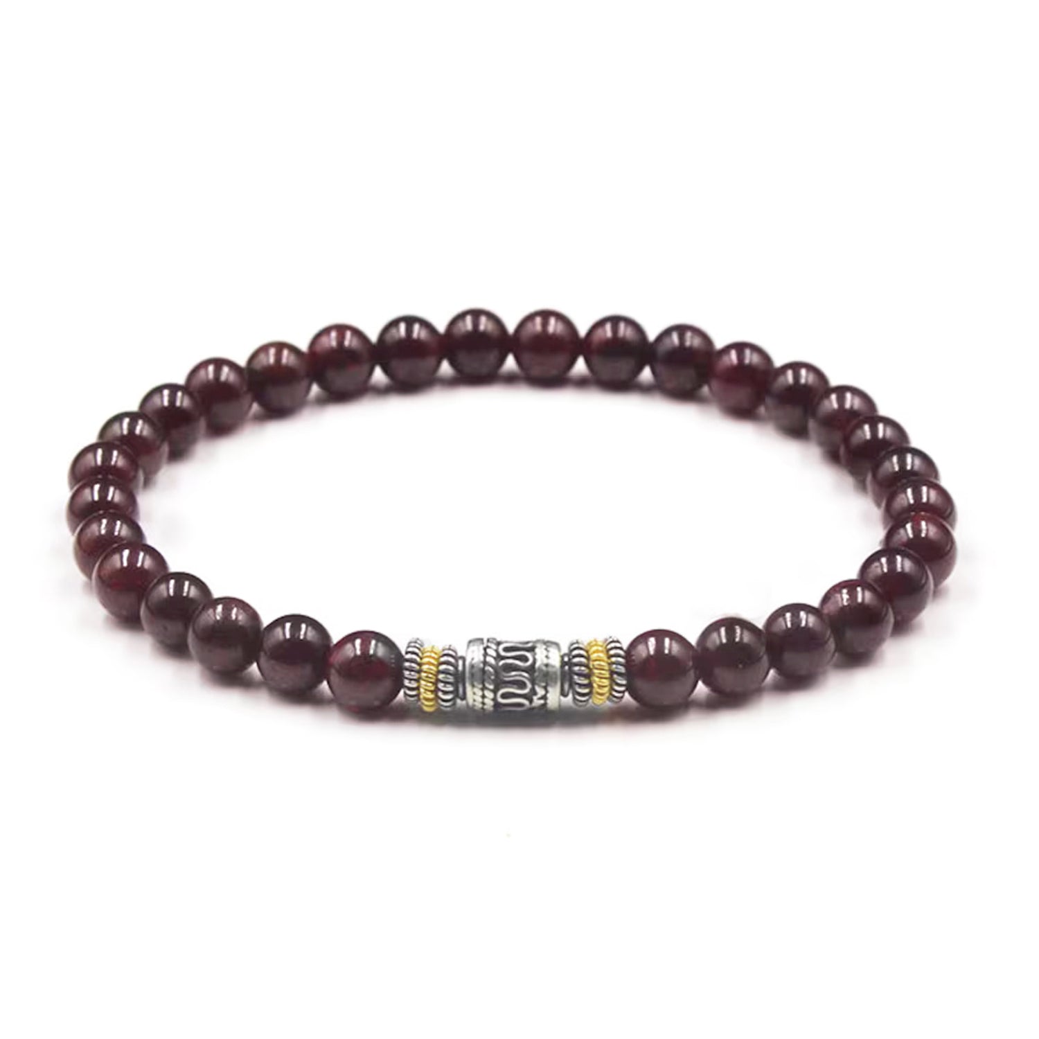 This bracelet features 6mm garnet stone beads accented with a 6mm x 9mm sterling silver bead and sterling silver/gold spacers.