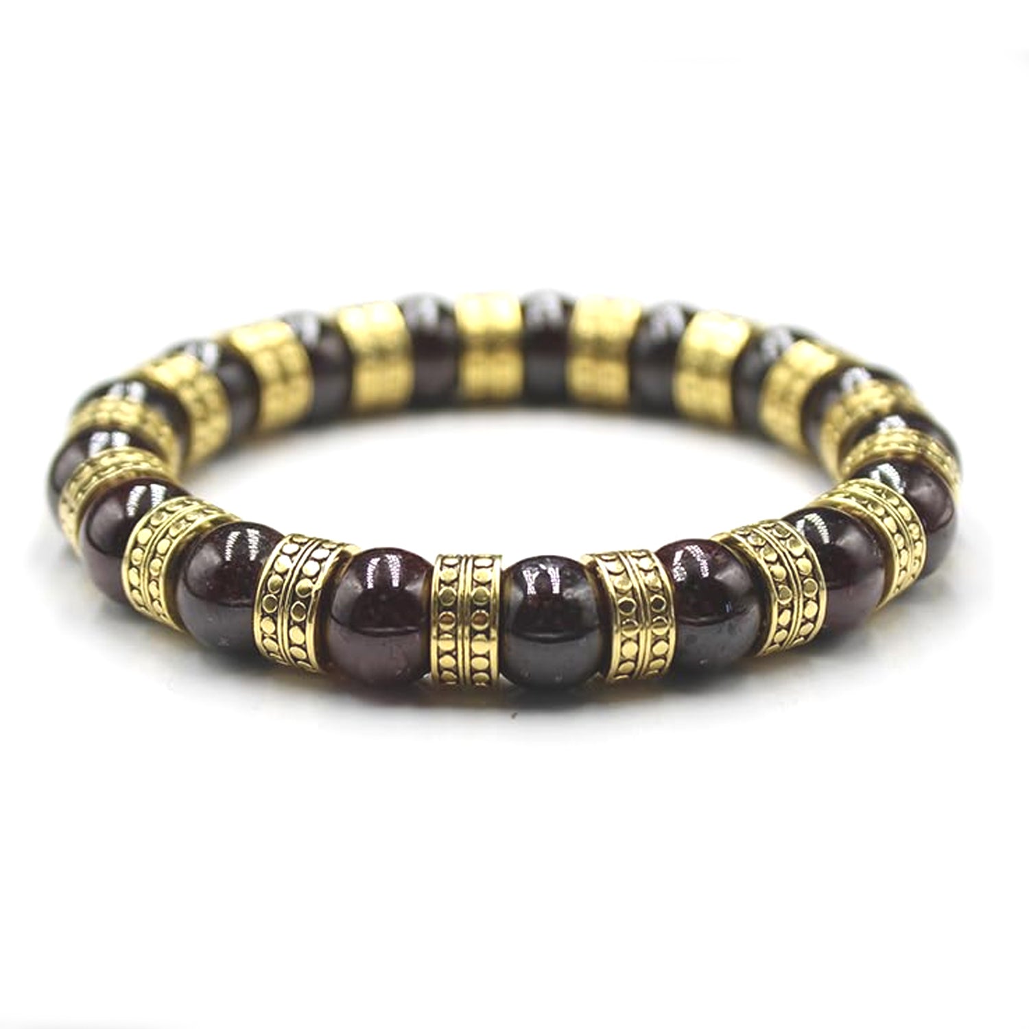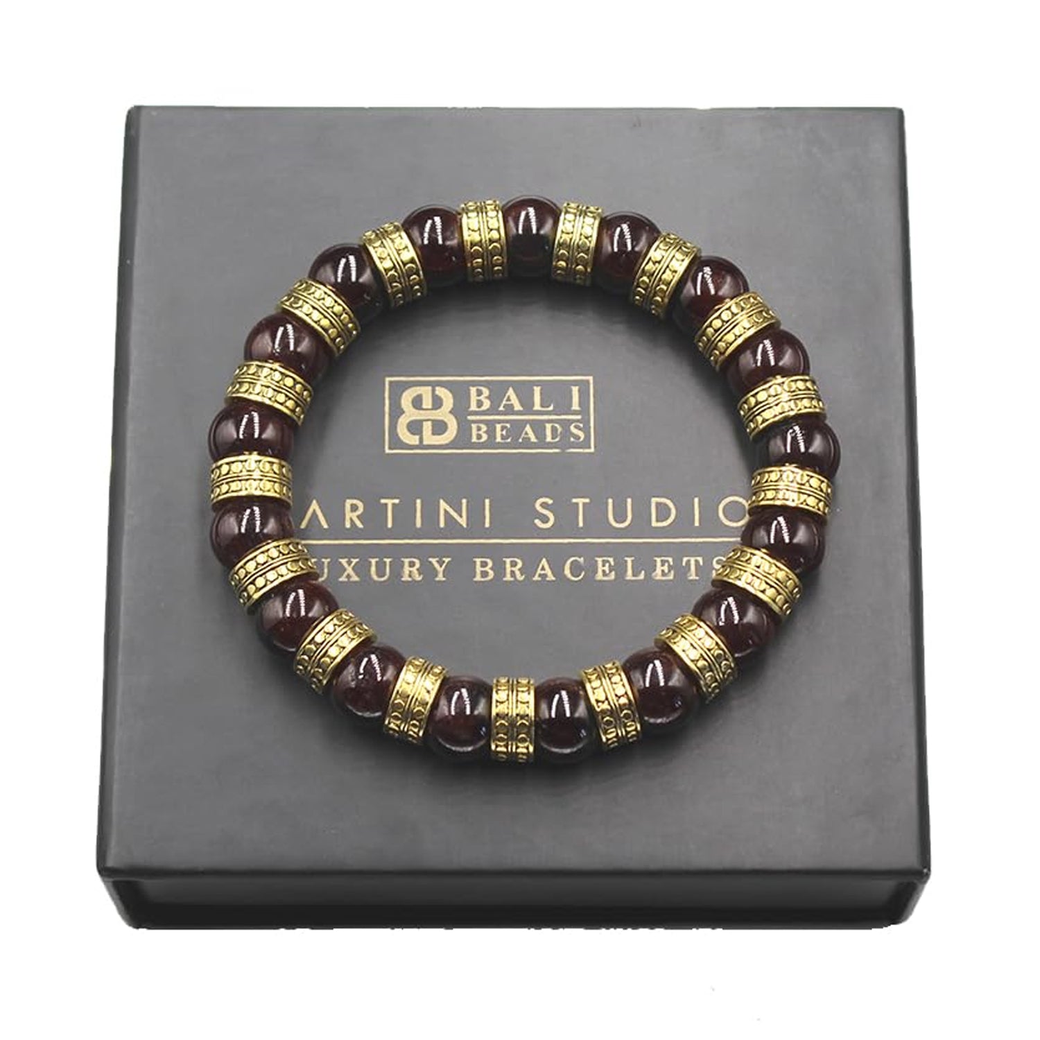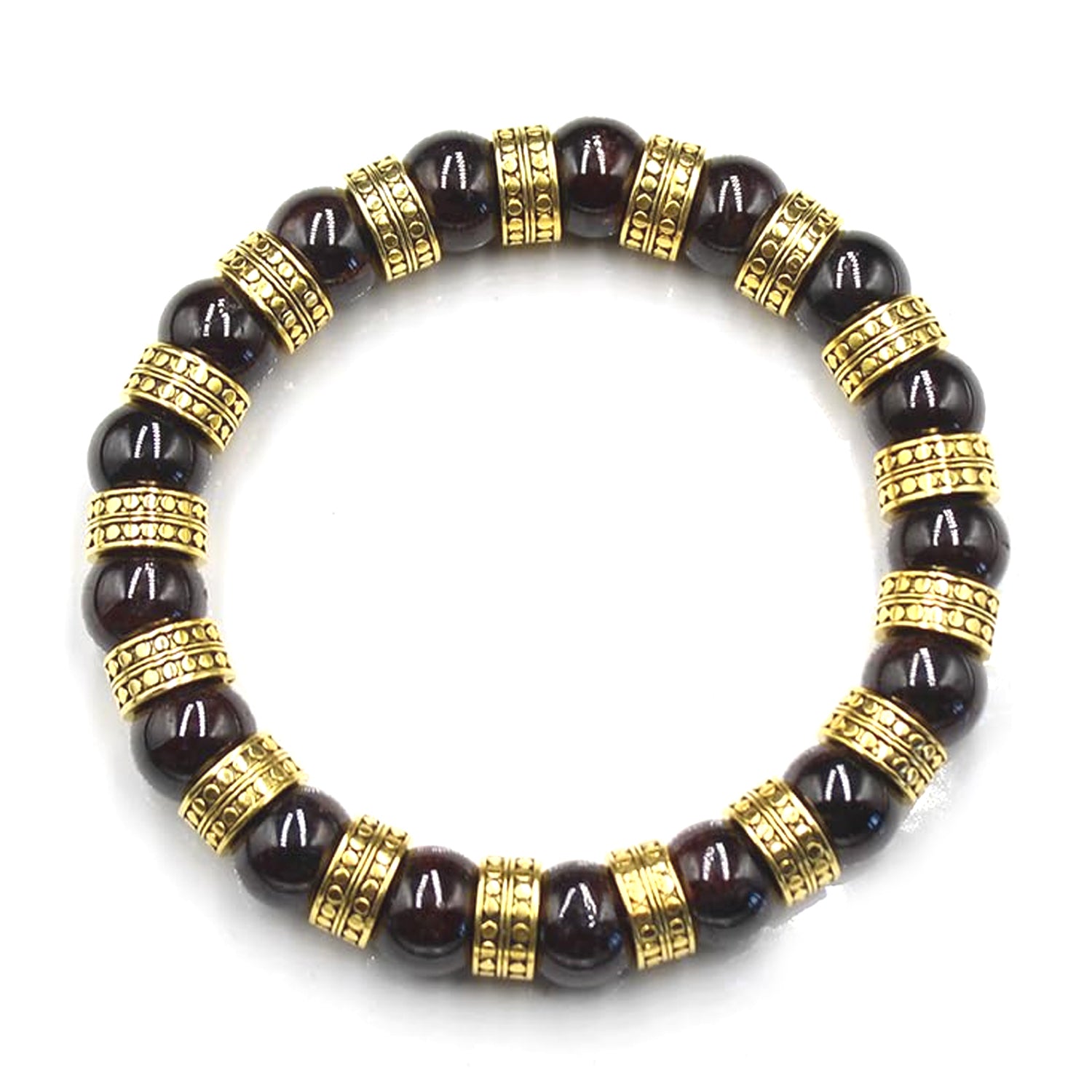 This bracelet features 10mm garnet stone beads accented with handmade 22 karat gold plated sterling silver dots beads.