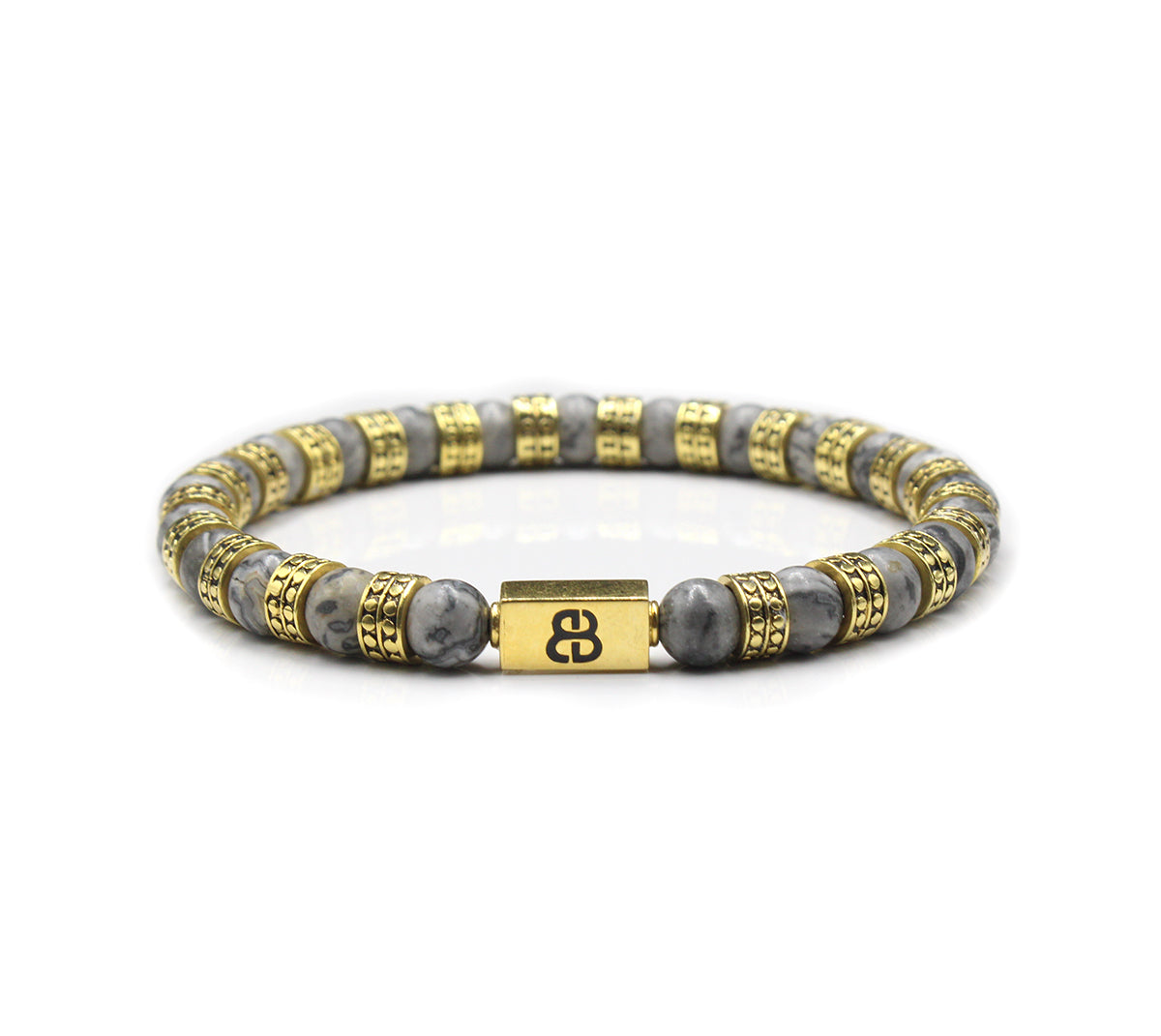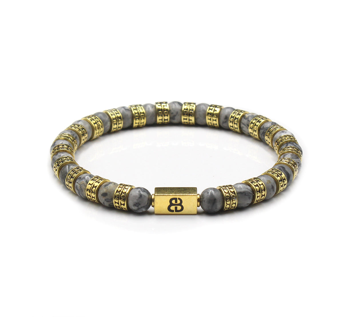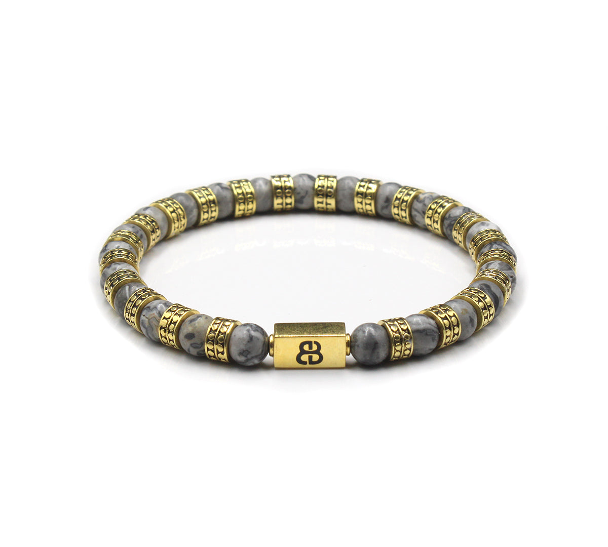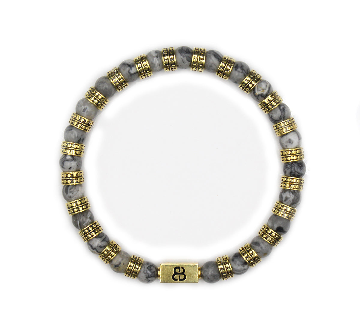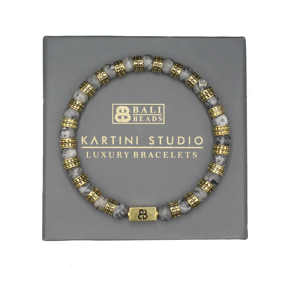 This bracelet features 6mm grey jasper stone beads with a handmade 22 karat gold plated sterling silver beads and a "Bali Beads" logo bead.