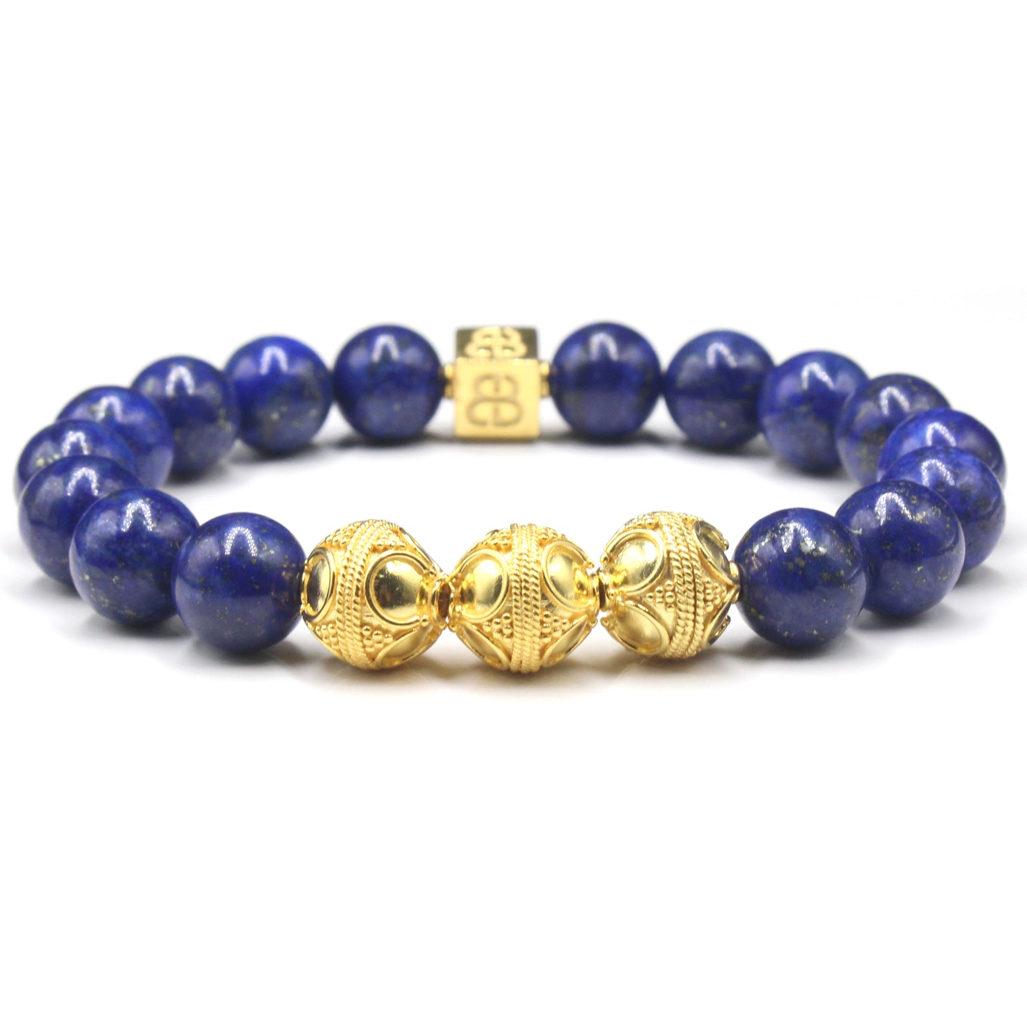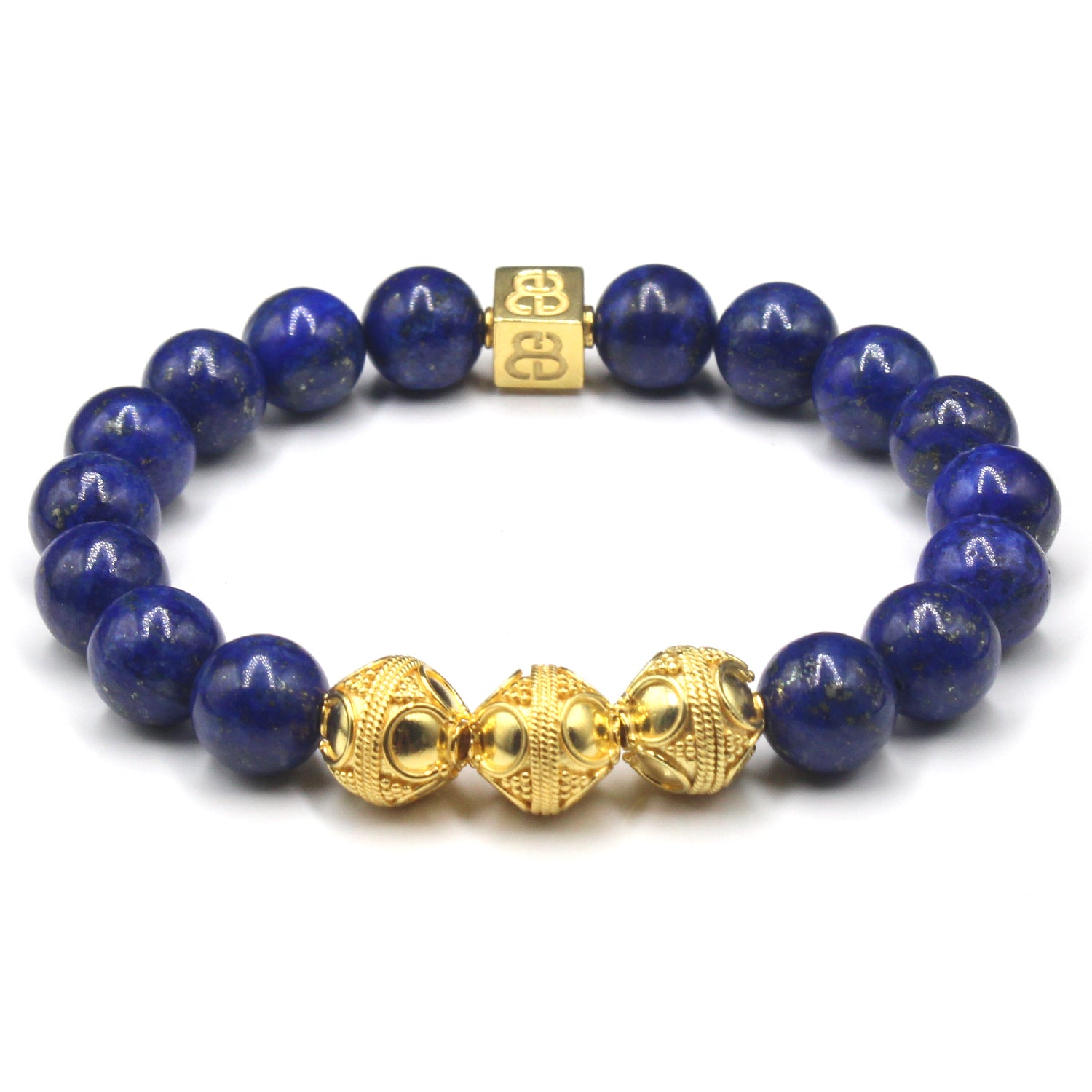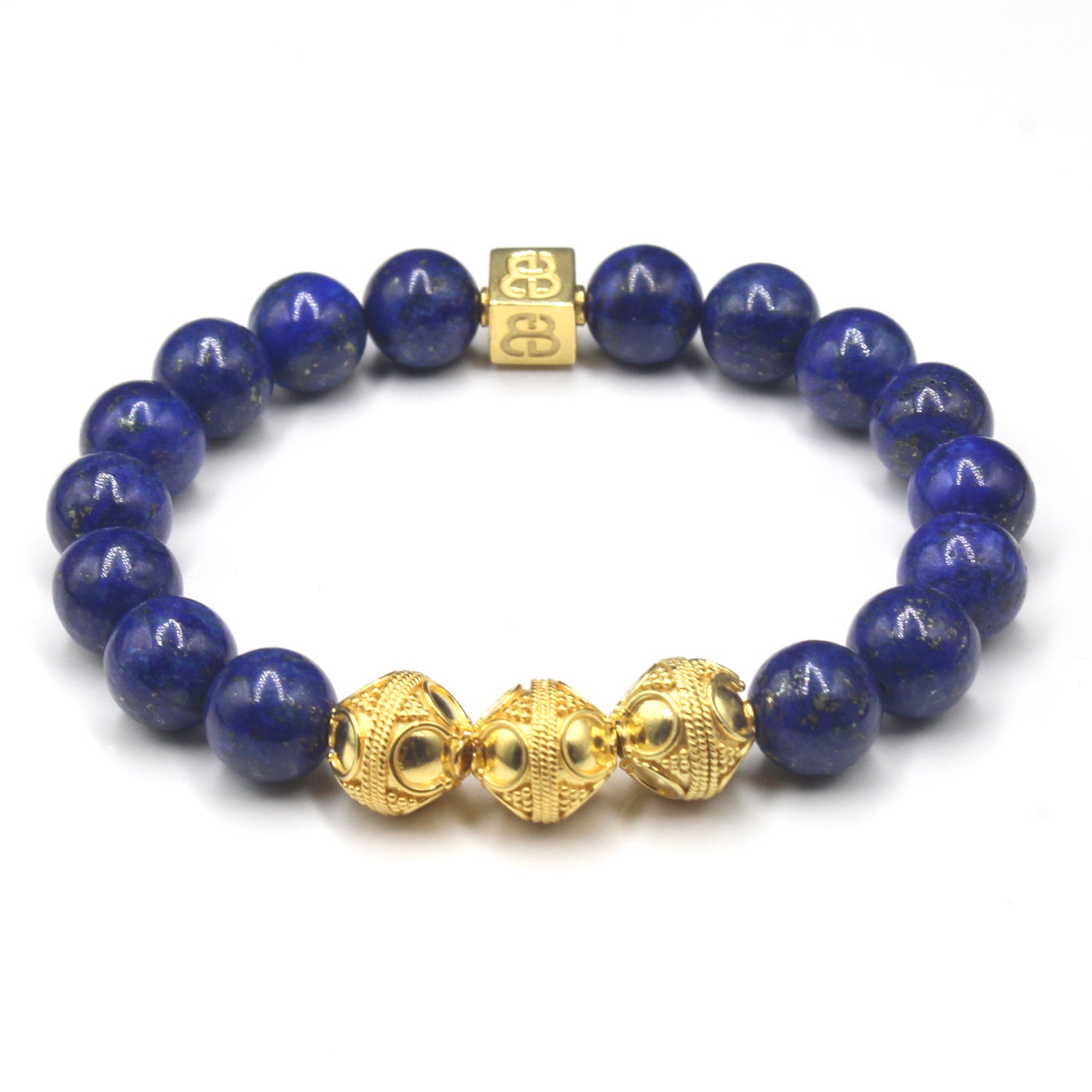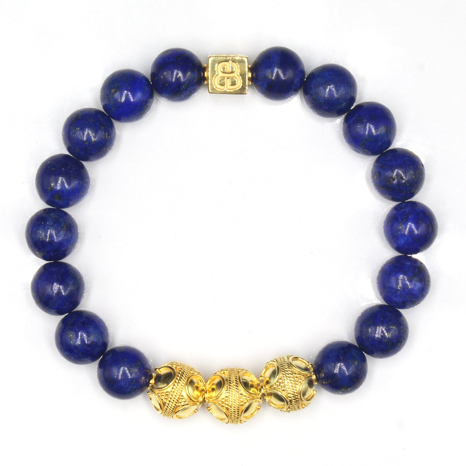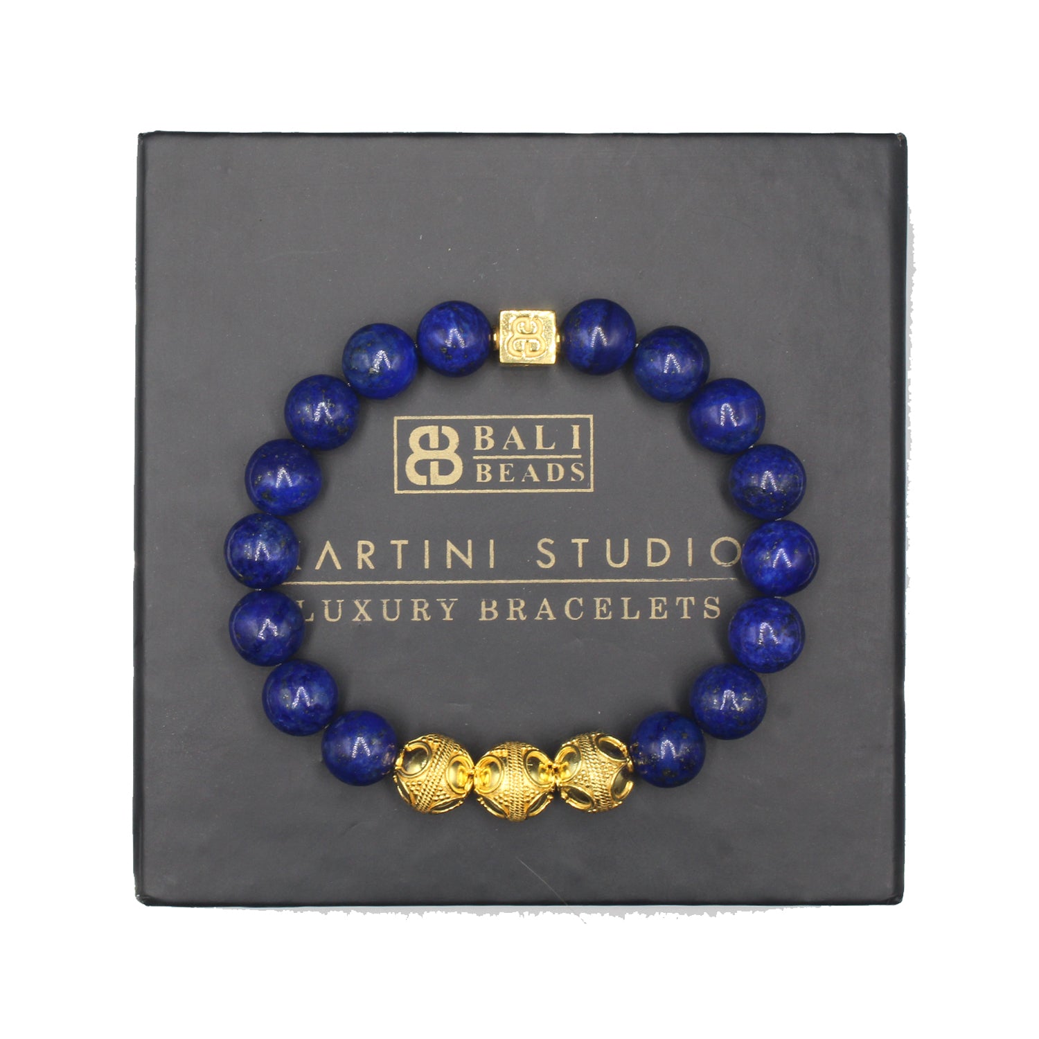 This bracelet features 10mm blue lapis lazuli beads beads accented with three handmade 10mm solid sterling silver Bali beads and a 8mm x 8mm solid sterling silver "Bali Beads" logo anchor bead.