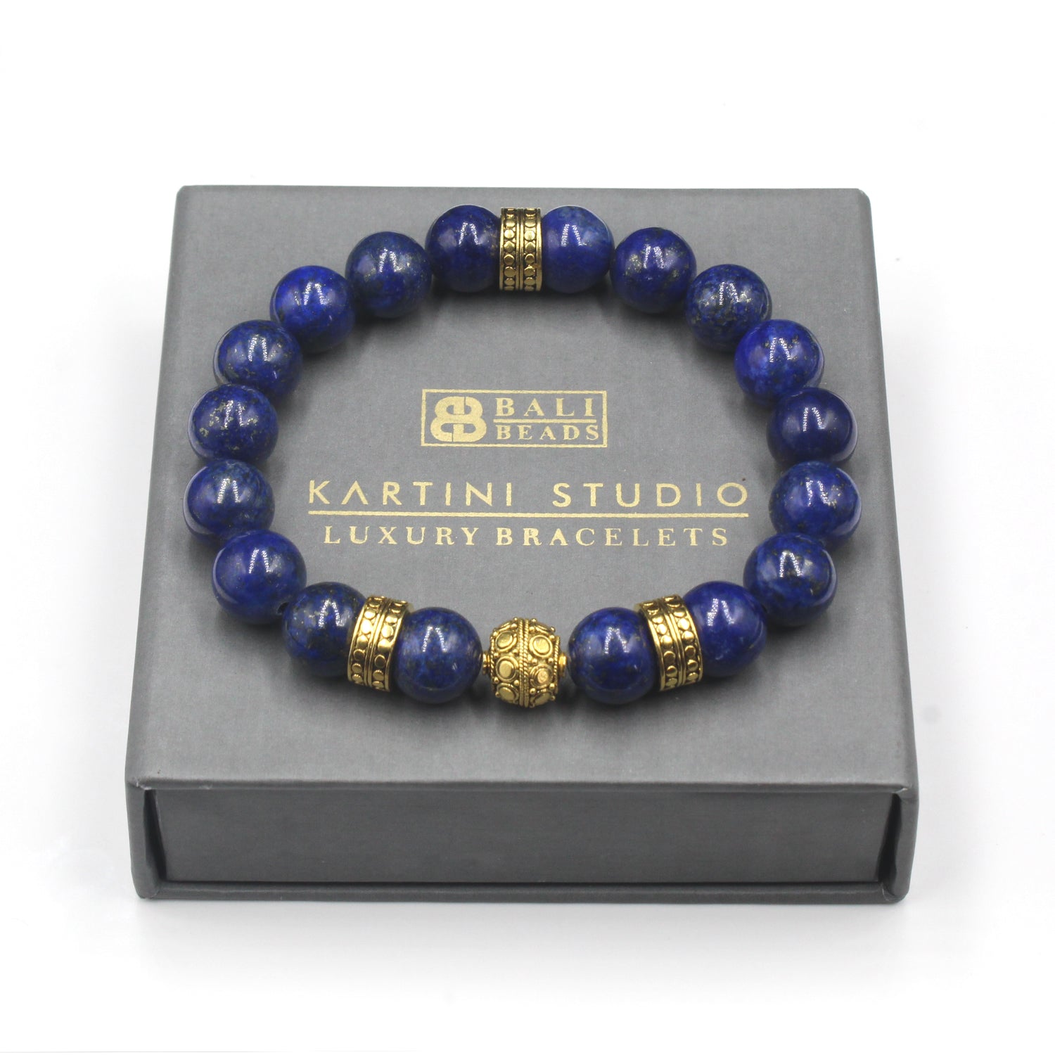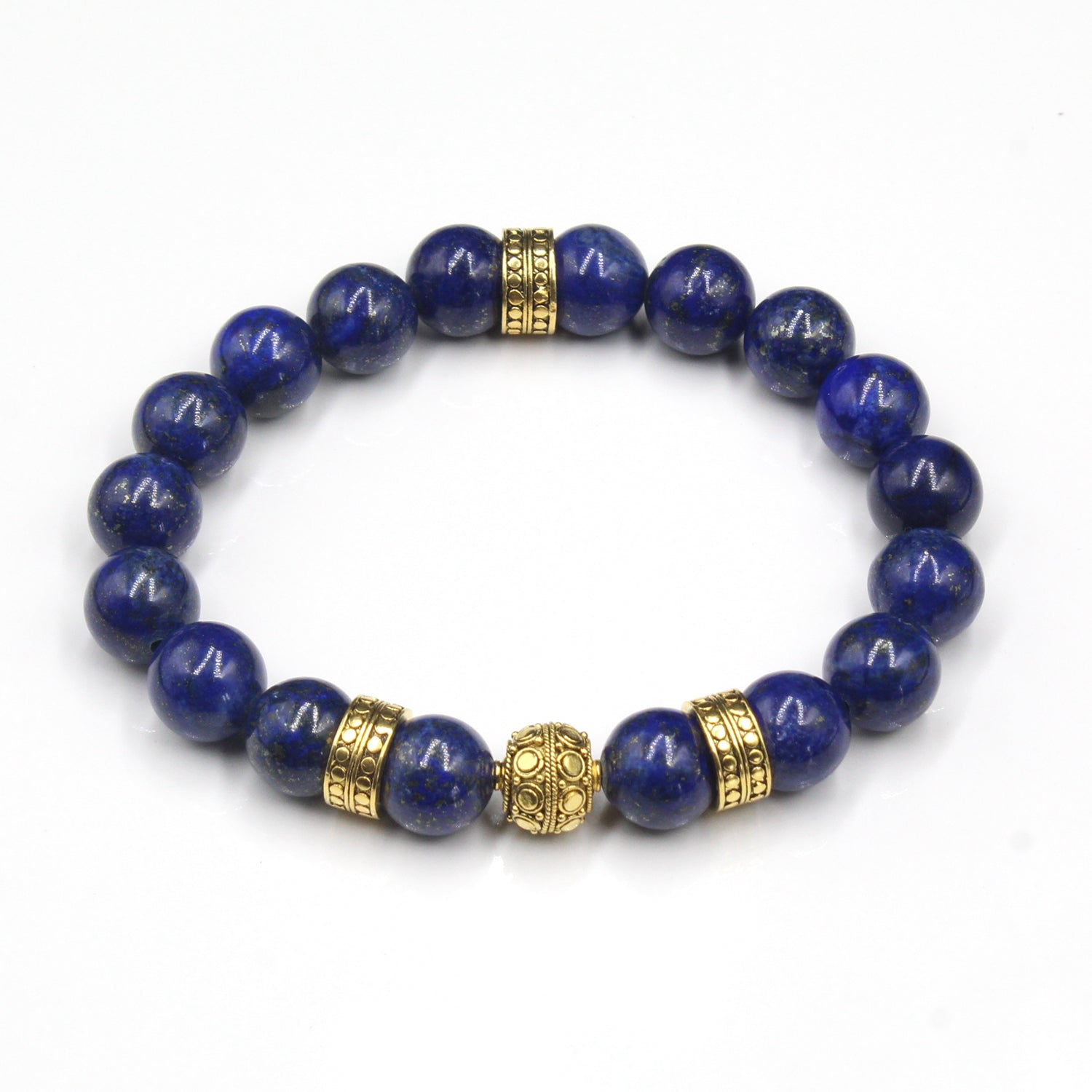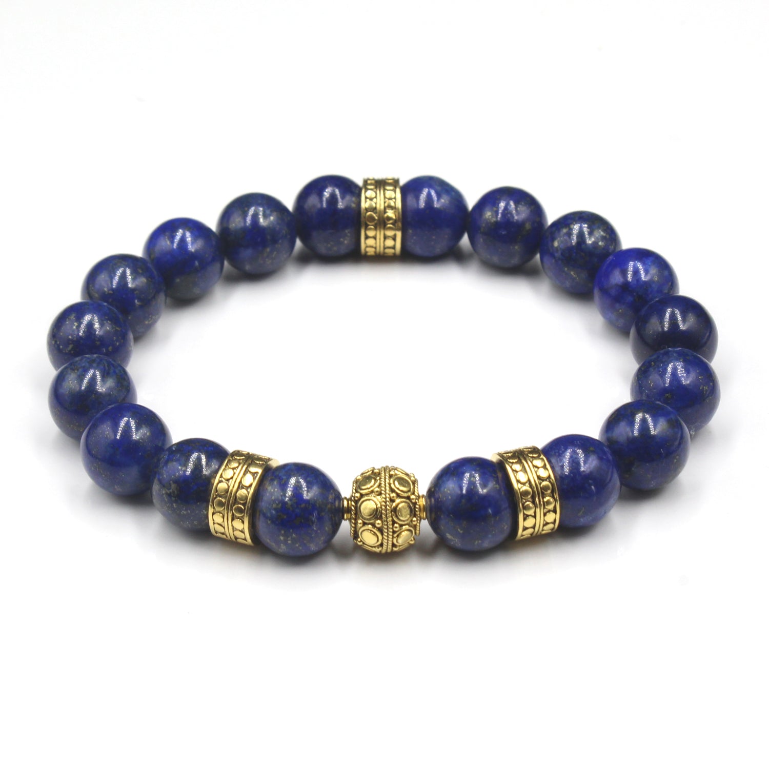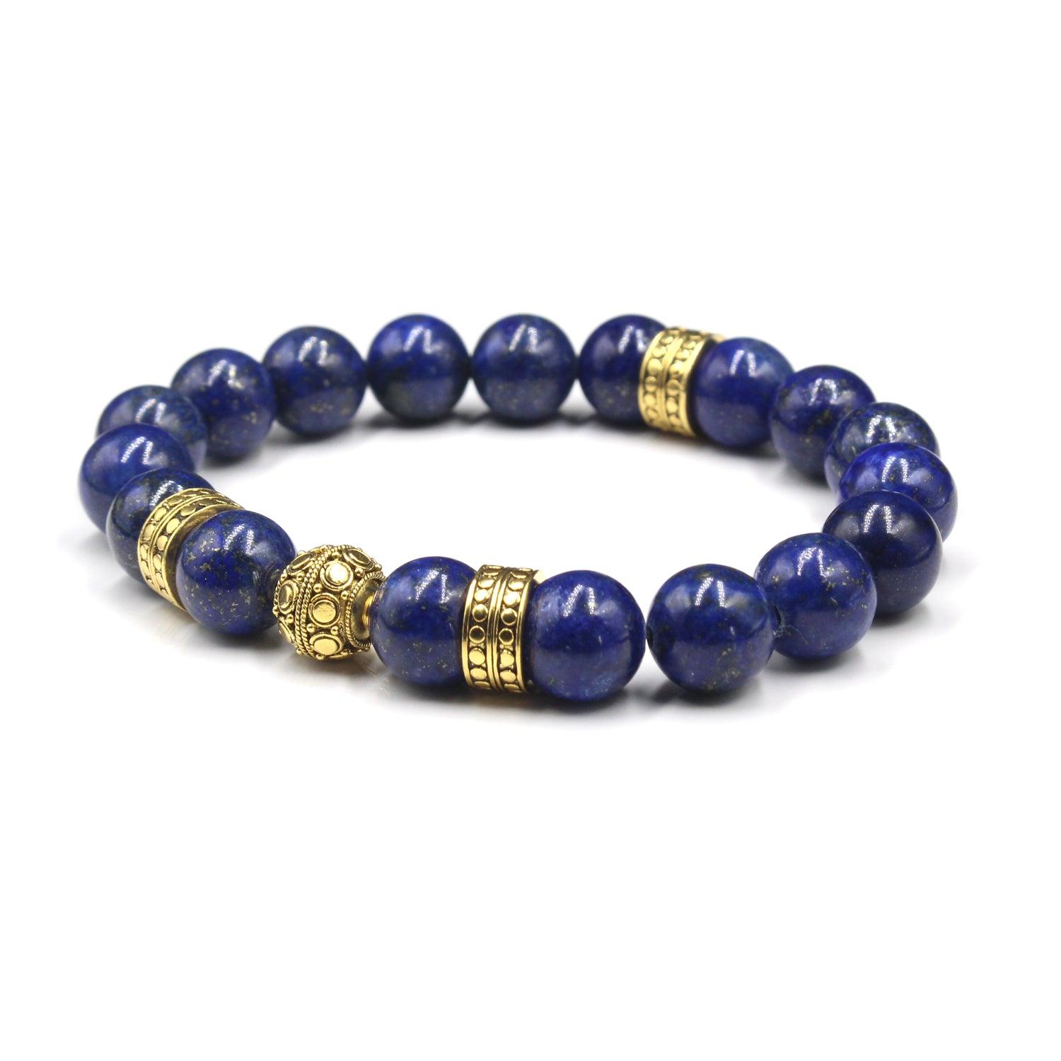 This bracelet features 10mm lapis lazuli beads accented with a 10mm handmade 22 karat gold plated sterling silver Bali beads and three 22 karat gold plated sterling silver "dots" beads. The gold is gently oxidized to darken the recessed areas.
