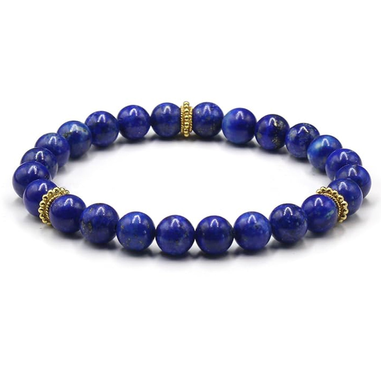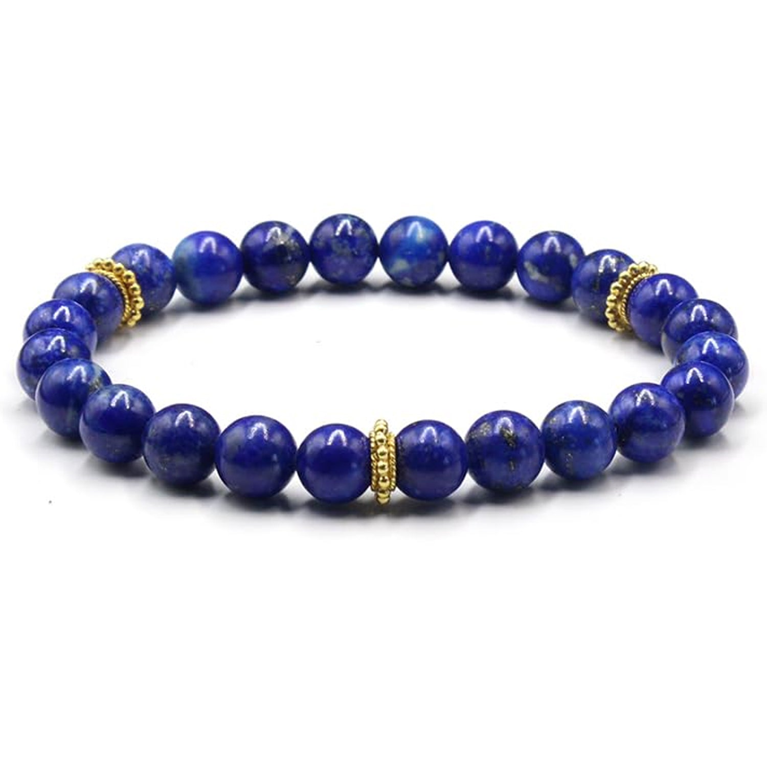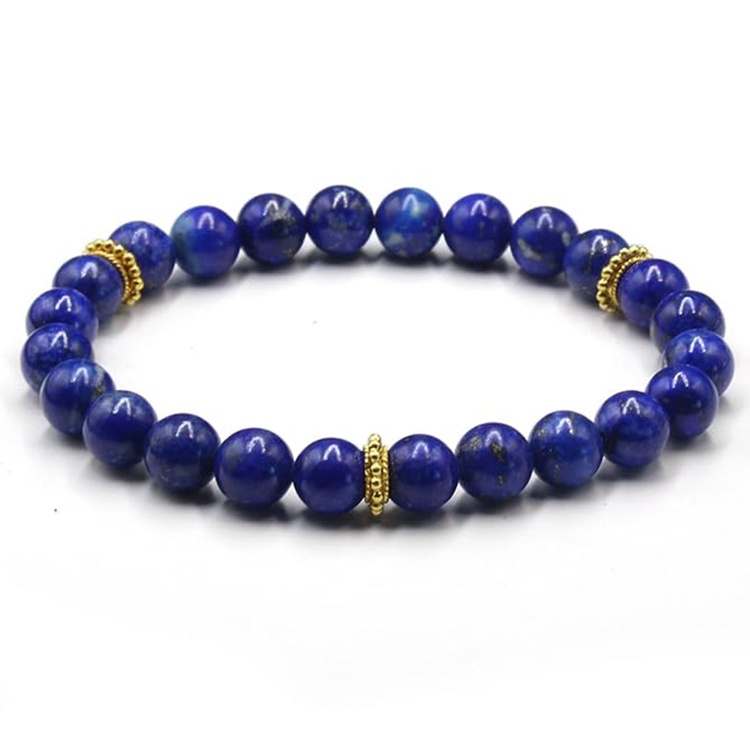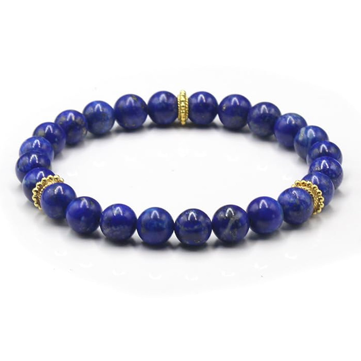 - This bracelet features 8mm natural lapis lazuli beads accented with three 22 karat gold plated sterling silver Bali beads.