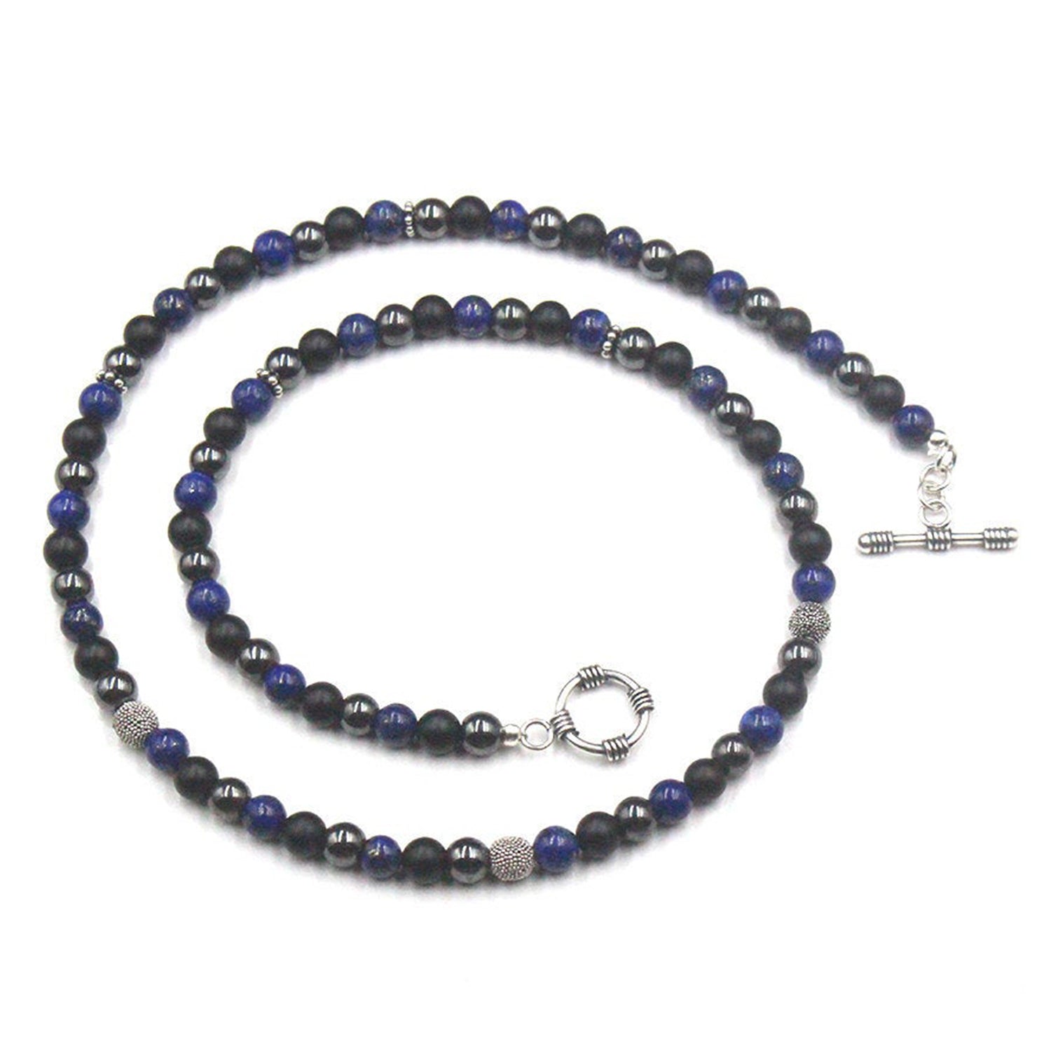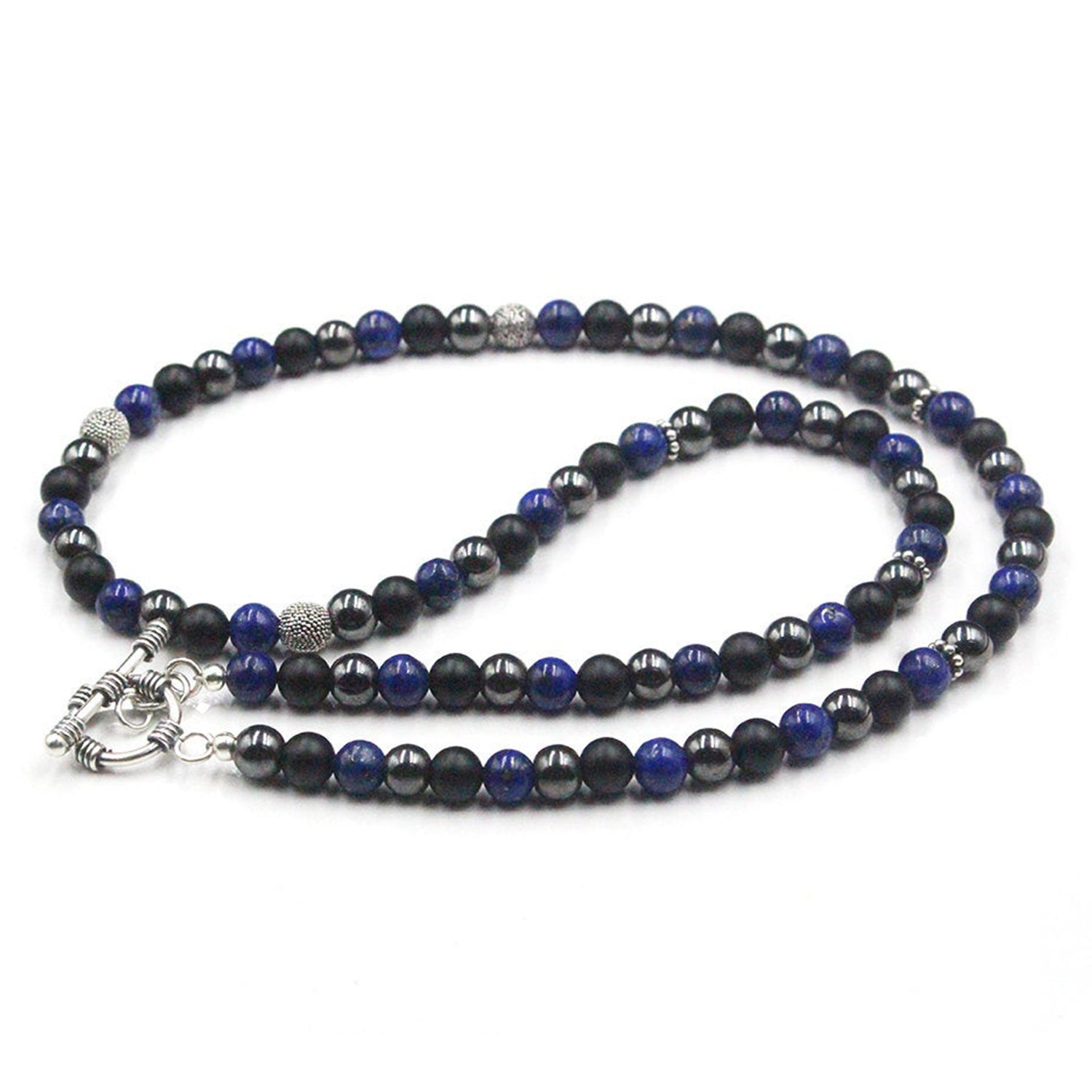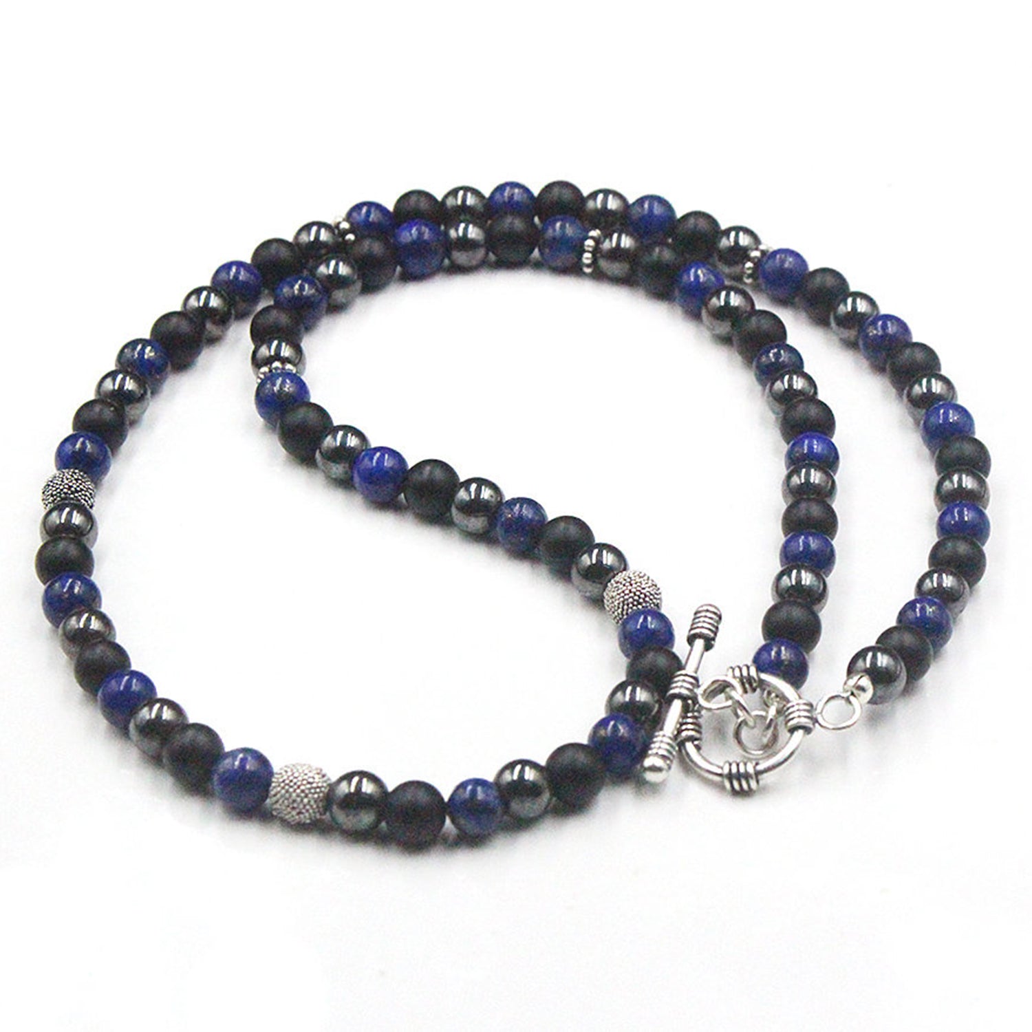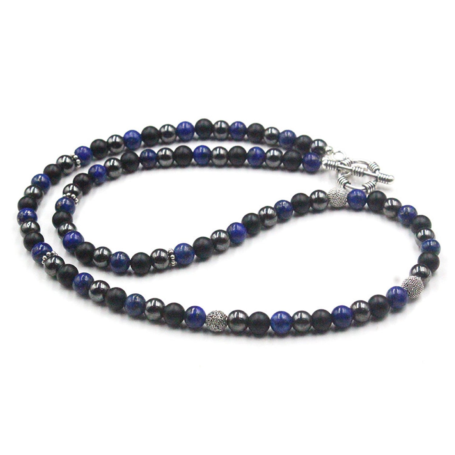 This men's necklace features 6mm lapis lazuli beads, 6mm hematite beads, and 6mm matte black onyx beads accented with three 6mm sterling silver granulation beads and 5mm sterling silver spacers. It fastens with a solid sterling silver toggle clasp and is strung on stainless steel wire for extra strength. Select the necklace size you would like from the drop down menu. Your necklace comes in a black satin pouch.