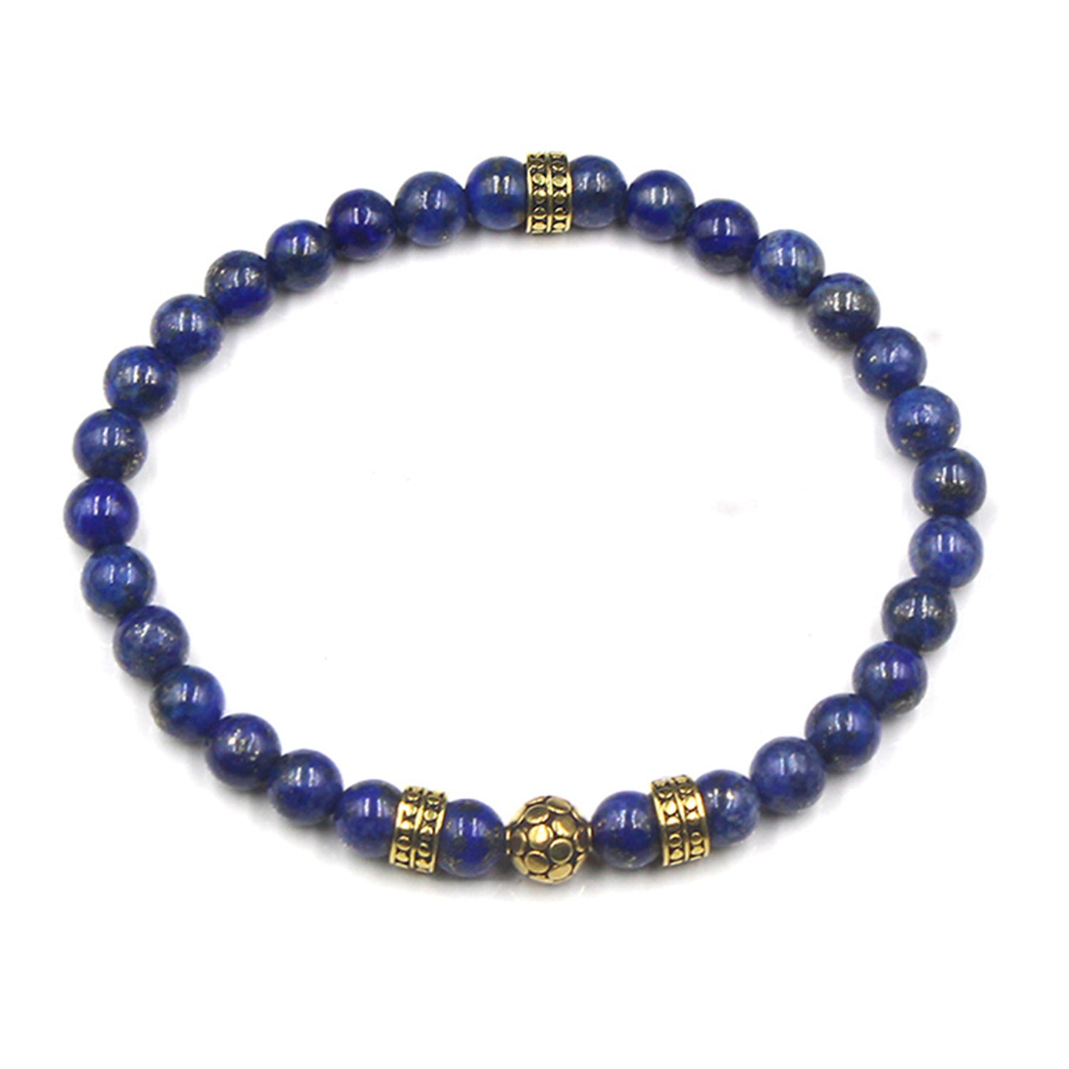 This bracelet features 6mm lapis lazuli stone beads accented with a handmade 6mm 22 karat gold plated sterling silver Bali bead and three rondelle beads.