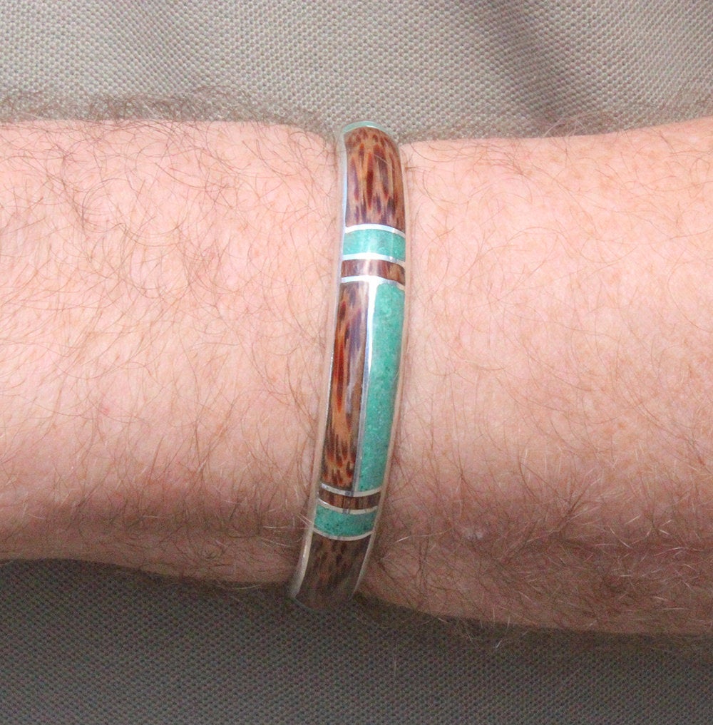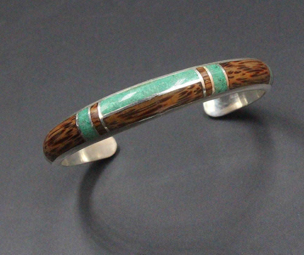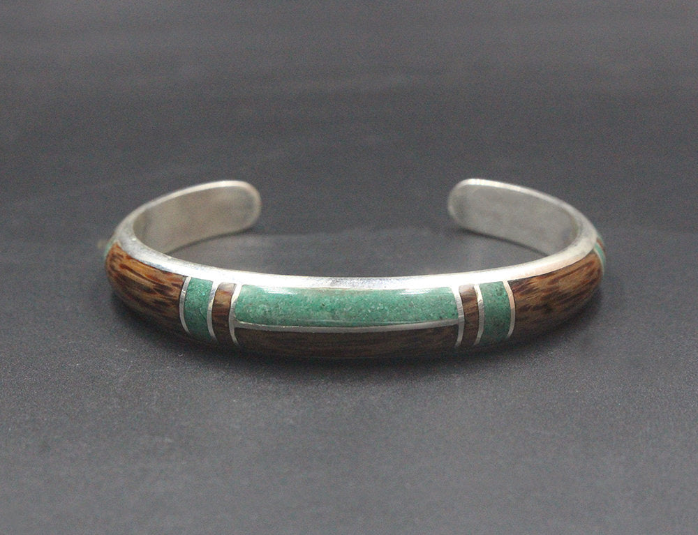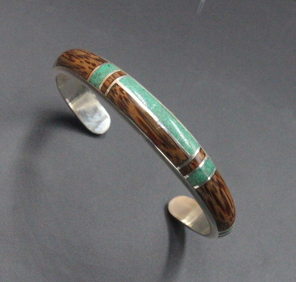 This is a handmade sterling silver cuff bracelet with inlays of coconut wood and natural malachite stone The bracelet width is 10mm tapering to 8mm. The gap is 1.25 inch. Select your wrist measurement from the drop down menu. We will make your bracelet to fit. Please measure your wrist if you are unsure of the size. We want your bracelet to fit perfectly. Solid sterling silver and stone inlay bracelets cannot be changed or altered. No returns are accepted unless the item is defective. Your bracelet comes in a bracelet gift box.