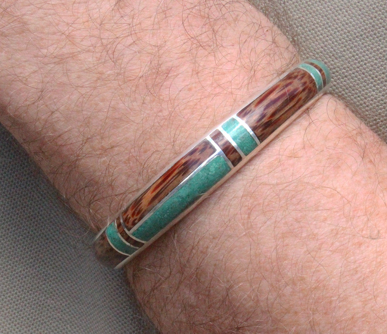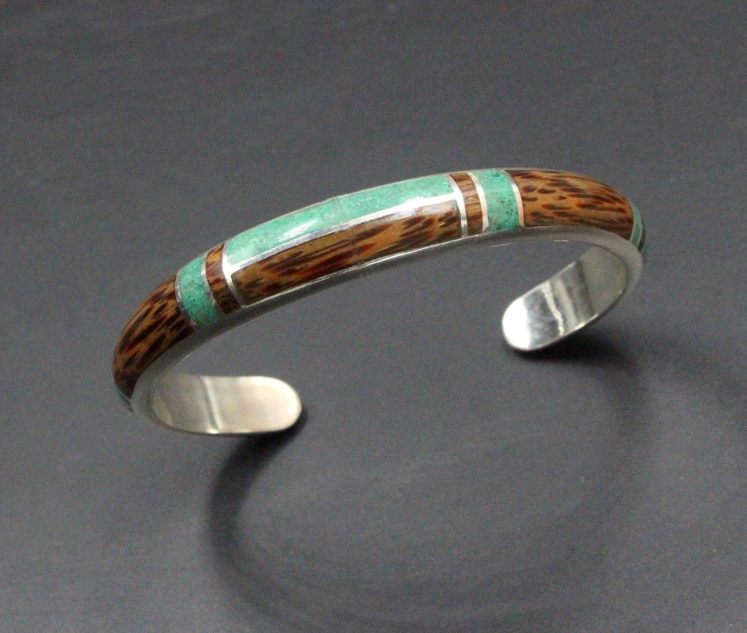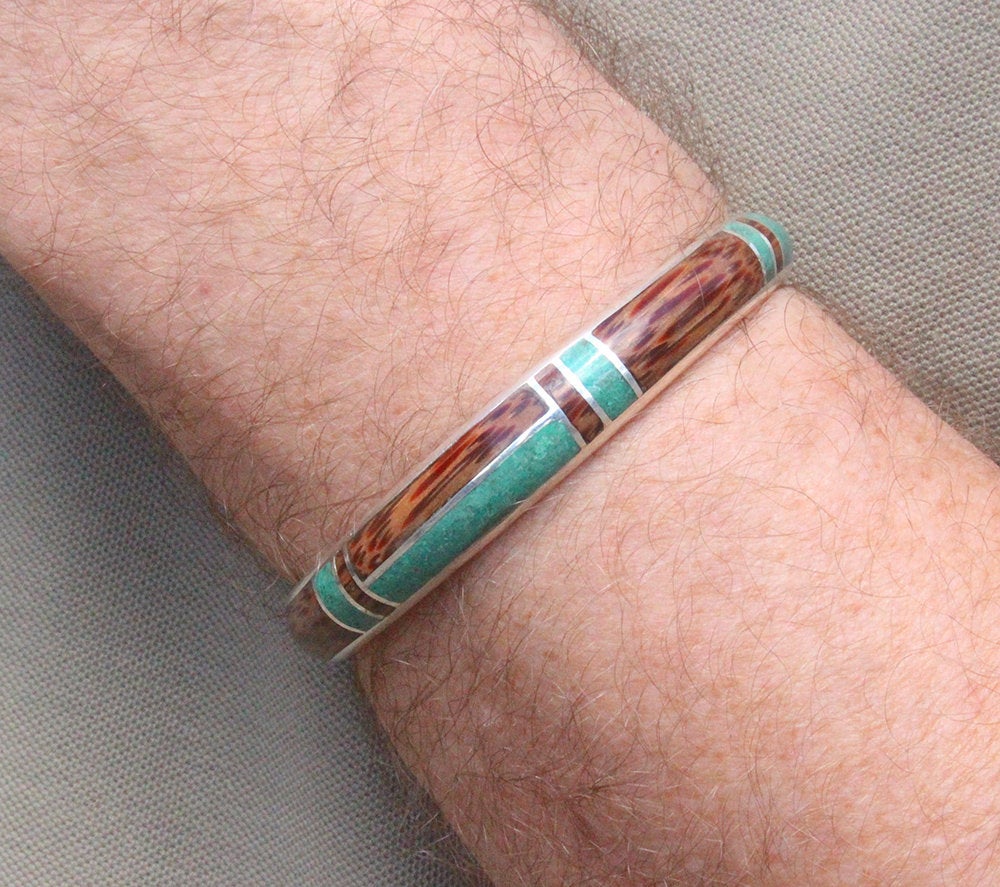 This is a handmade sterling silver cuff bracelet with inlays of coconut wood and natural malachite stone The bracelet width is 10mm tapering to 8mm. The gap is 1.25 inch. Select your wrist measurement from the drop down menu. We will make your bracelet to fit. Please measure your wrist if you are unsure of the size. We want your bracelet to fit perfectly. Solid sterling silver and stone inlay bracelets cannot be changed or altered. No returns are accepted unless the item is defective. Your bracelet comes in a bracelet gift box.