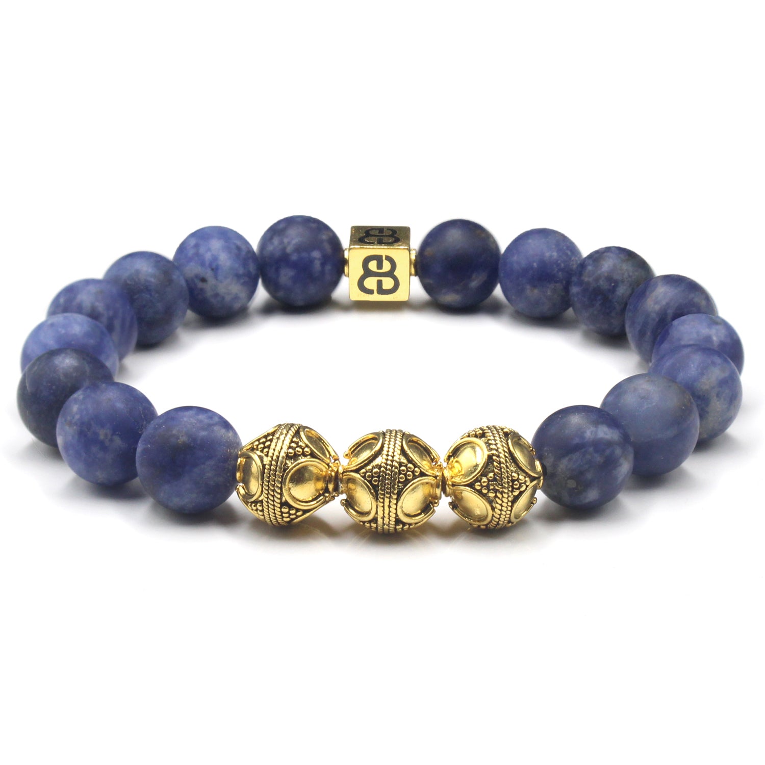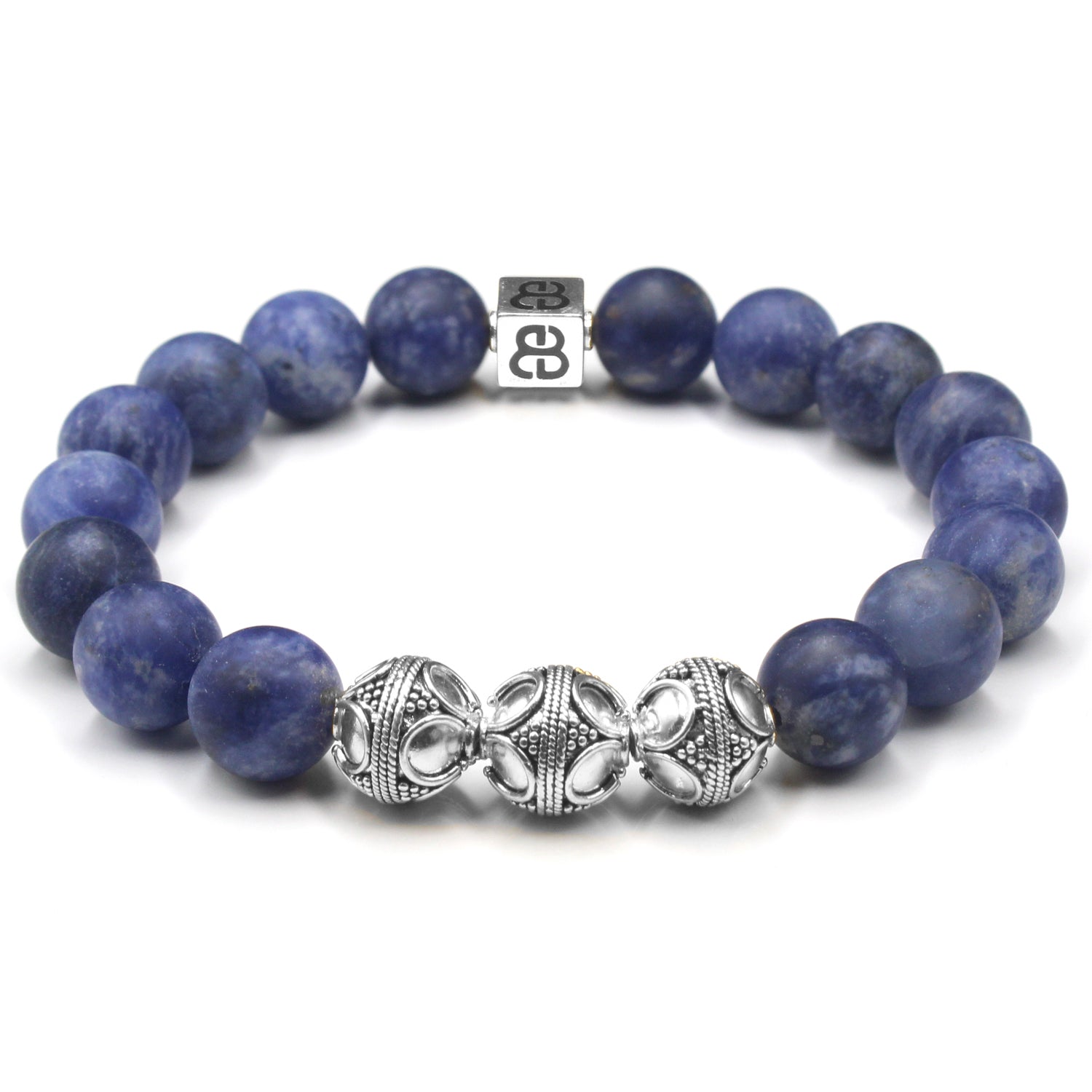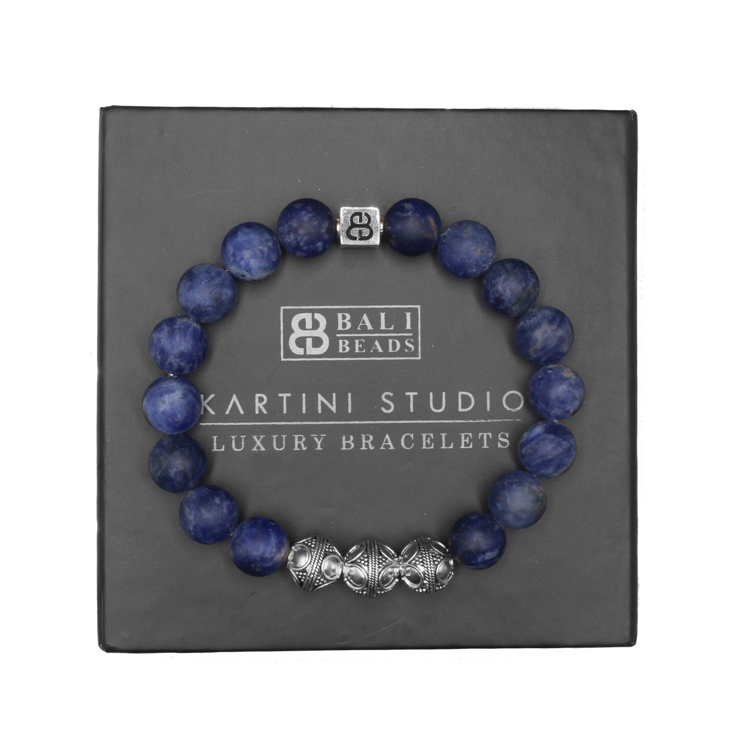 This men's bracelet features 10mm matte sodalite stone beads accented with three handmade 10mm sterling silver Bali beads and a solid sterling silver "Bali Beads" logo anchor bead.