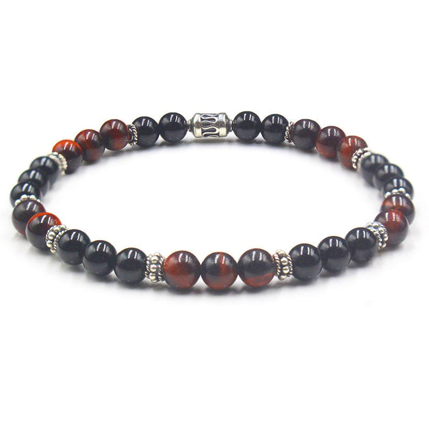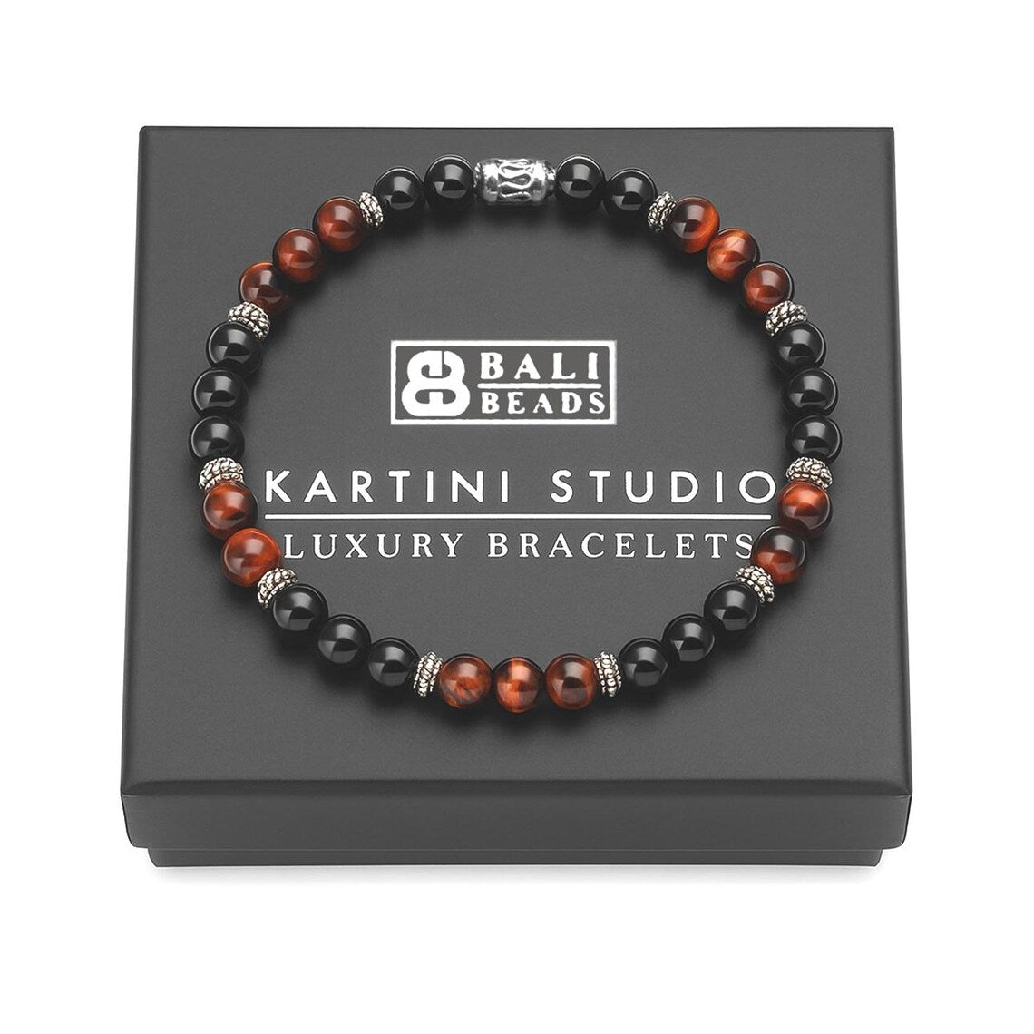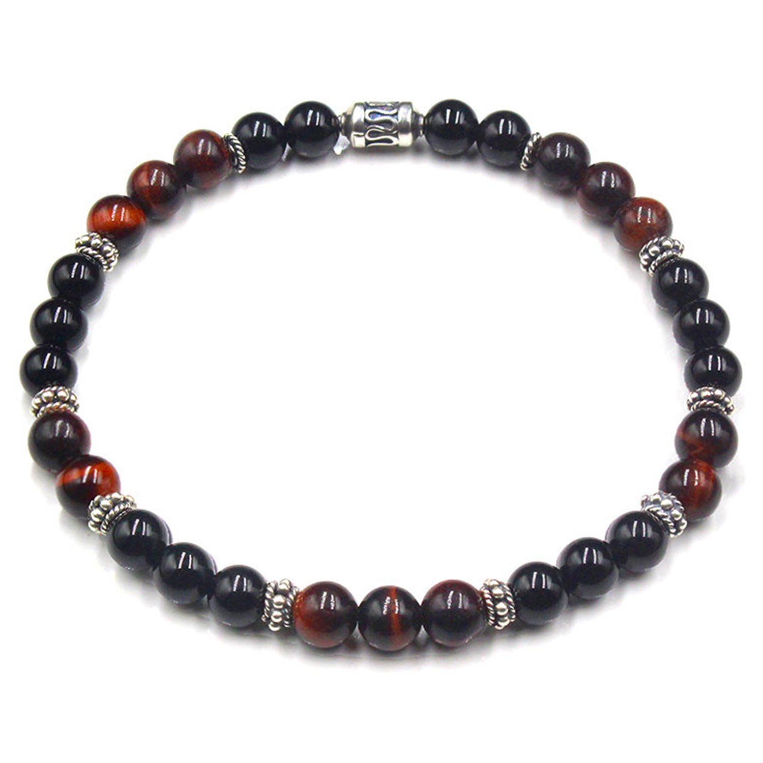 This bracelet features 6mm polished black onyx beads and 6mm red tiger's eye beads accented with a selection of sterling silver Bali beads.