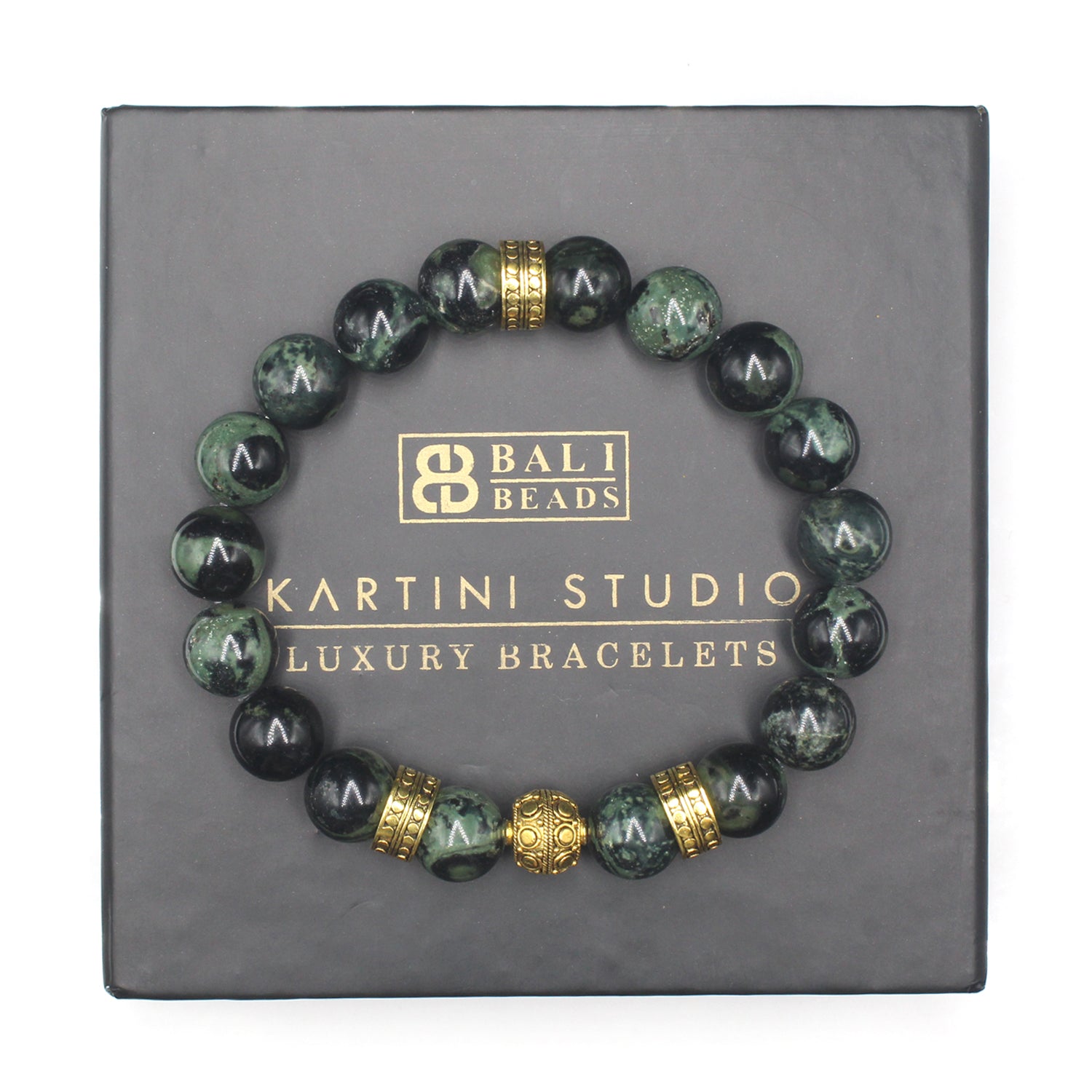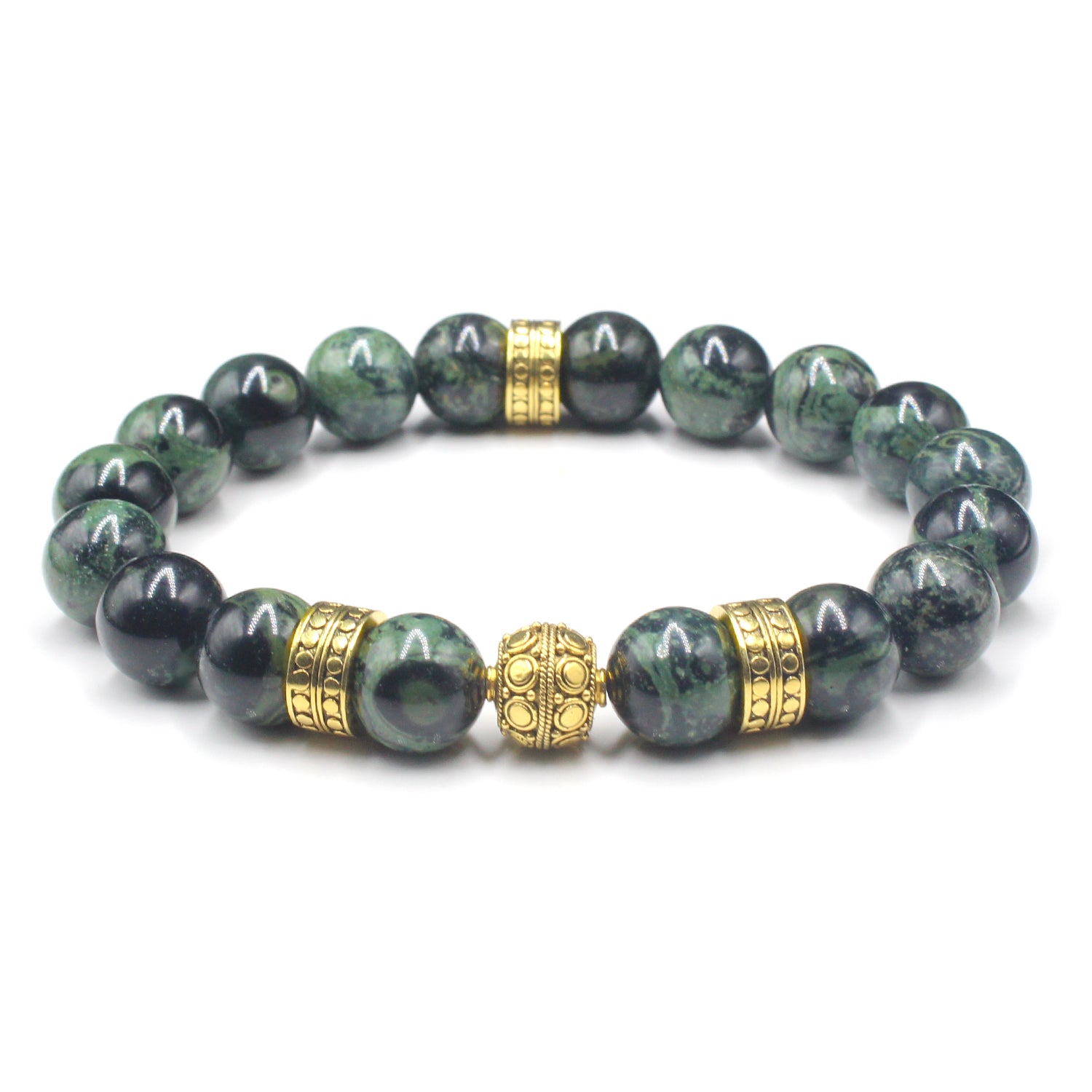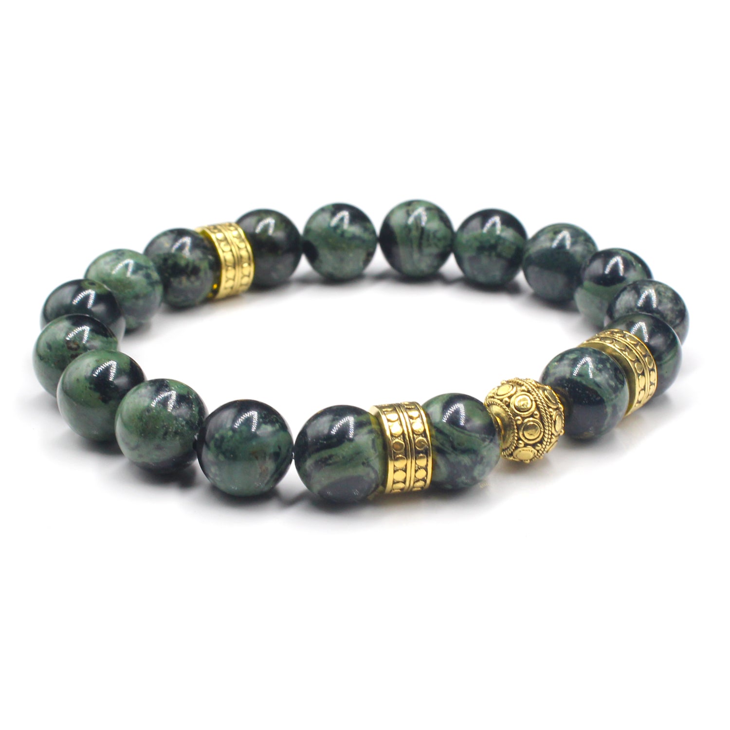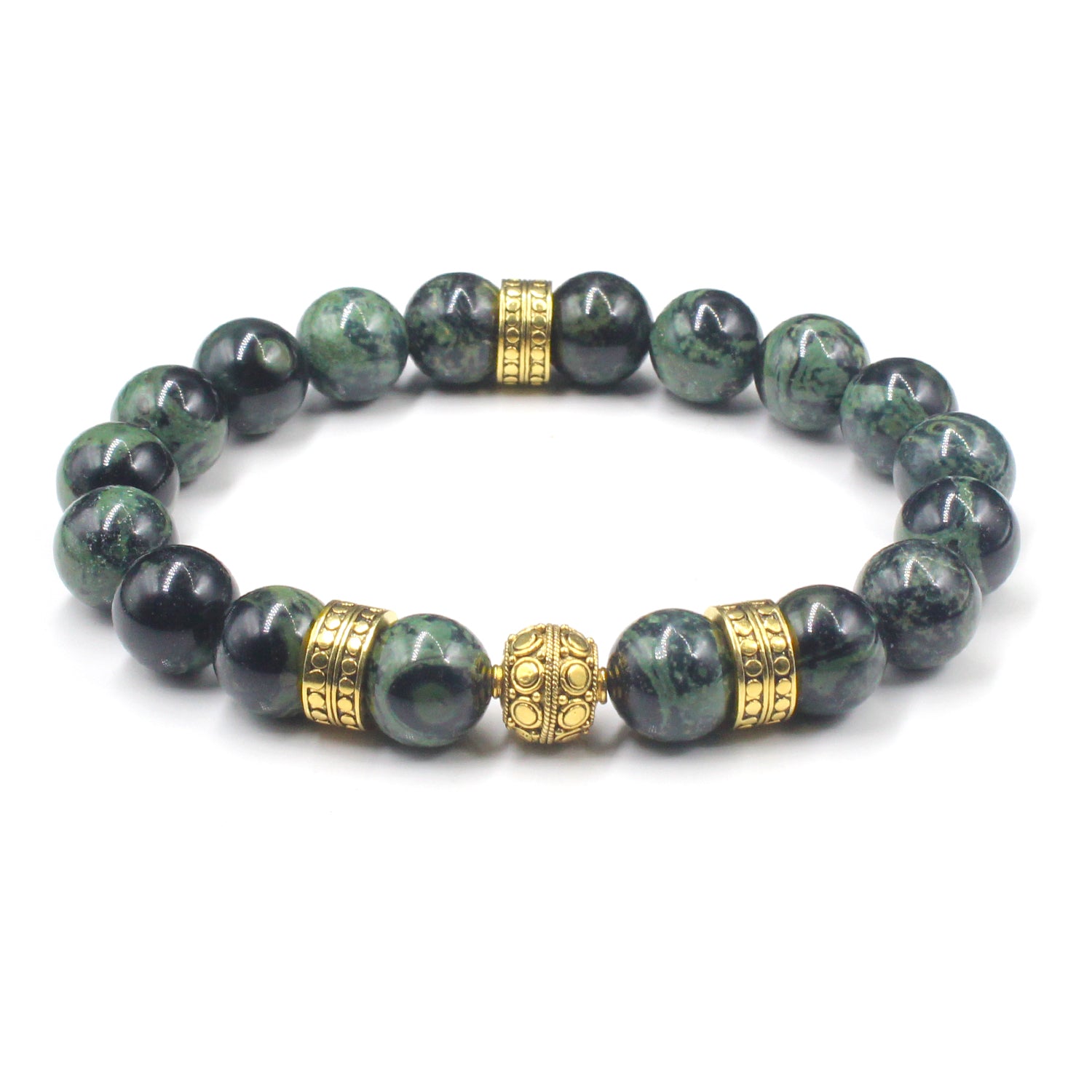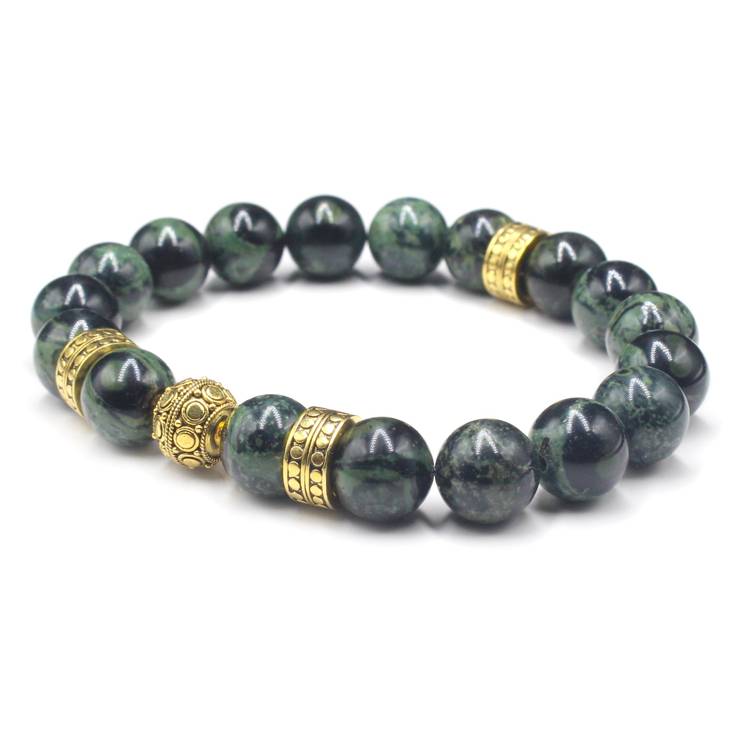 This bracelet features 10mm nephrite jade beads accented with a 10mm handmade 22 karat gold plated sterling silver Bali beads and three 22 karat gold plated sterling silver "dots" beads. The gold is gently oxidized to darken the recessed areas.