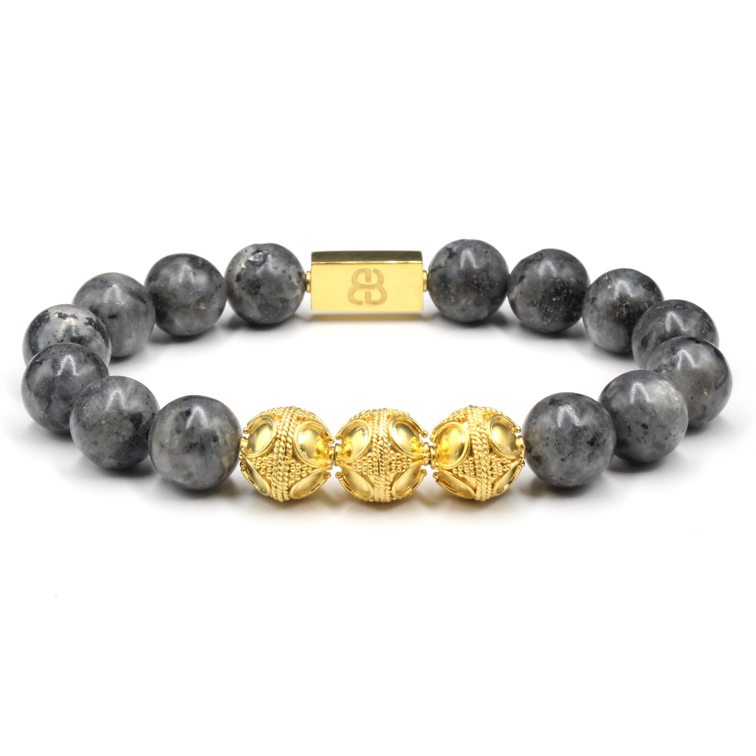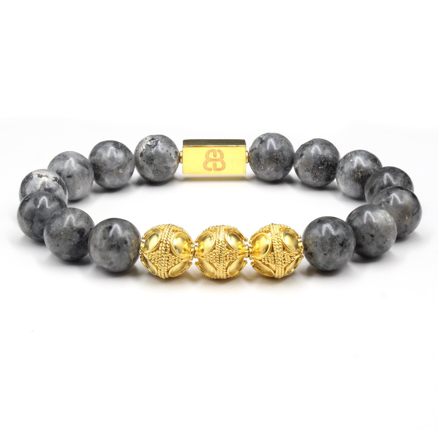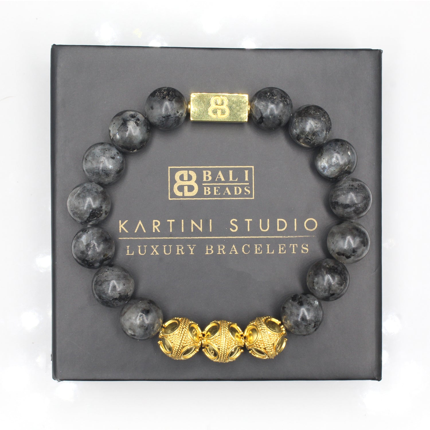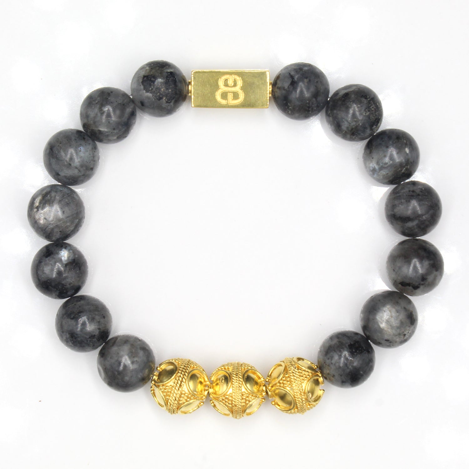- This bracelet features 12mm matte larvikite beads accented with three handmade 12mm 22 karat gold plated sterling silver Bali beads and a “Bali Beads” logo anchor bead.