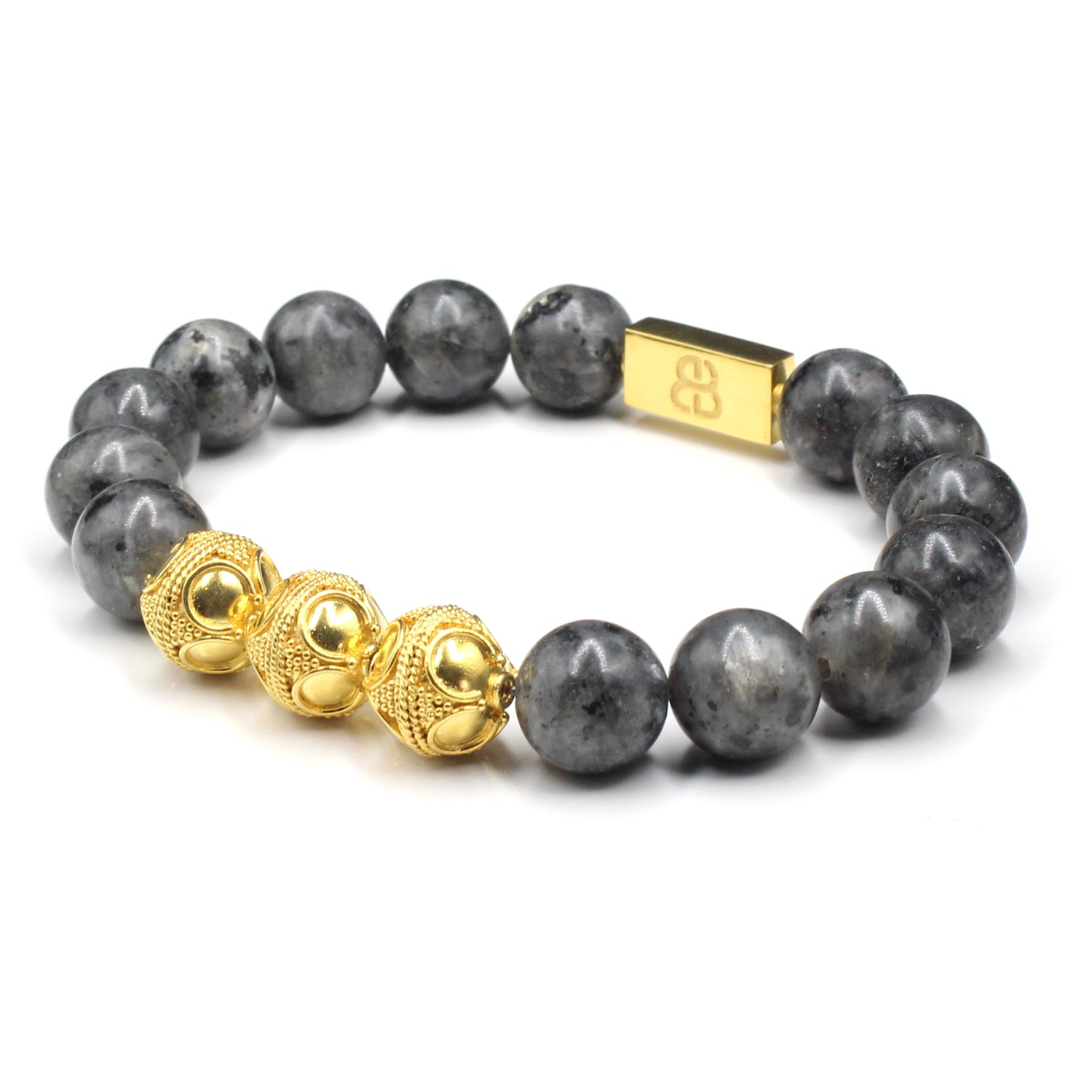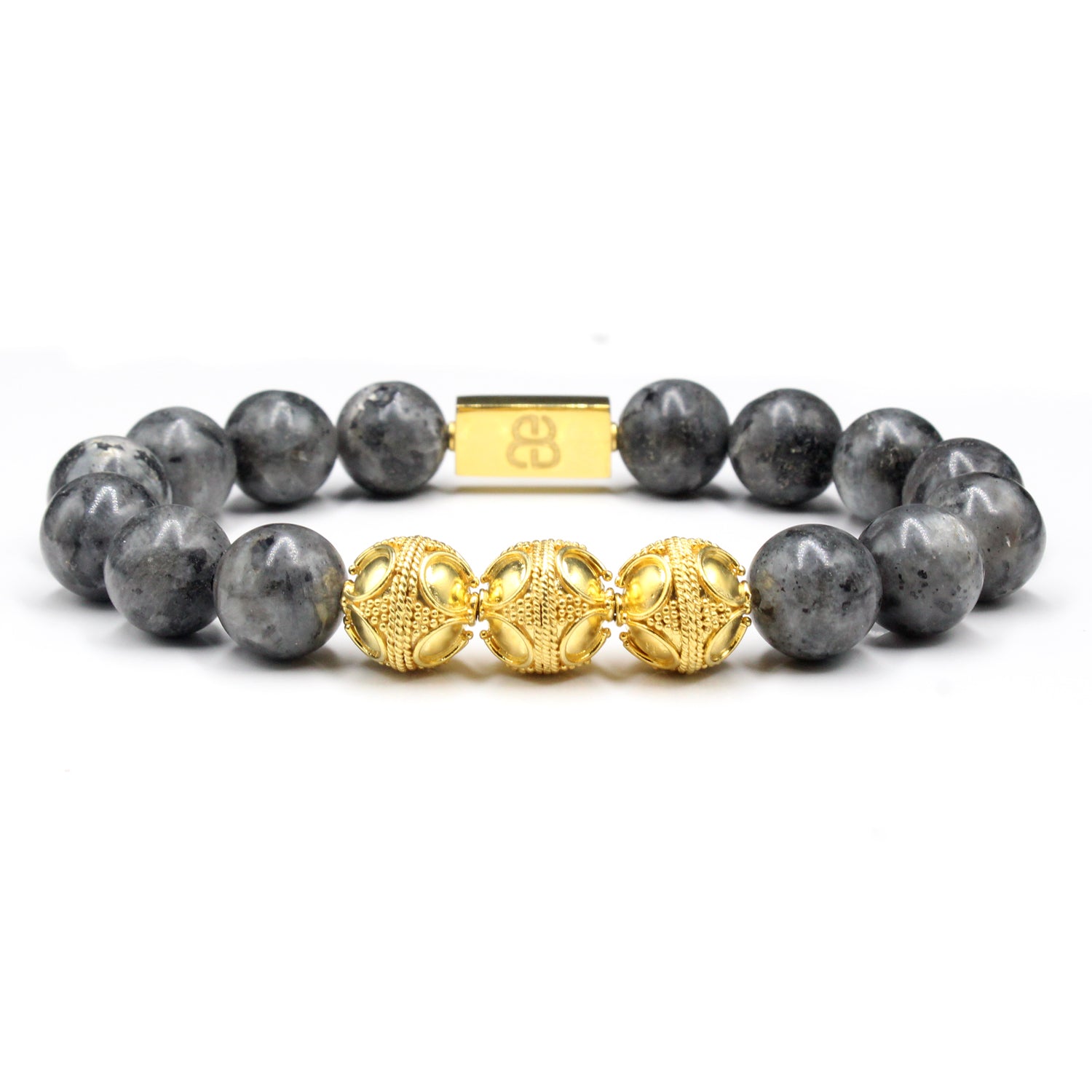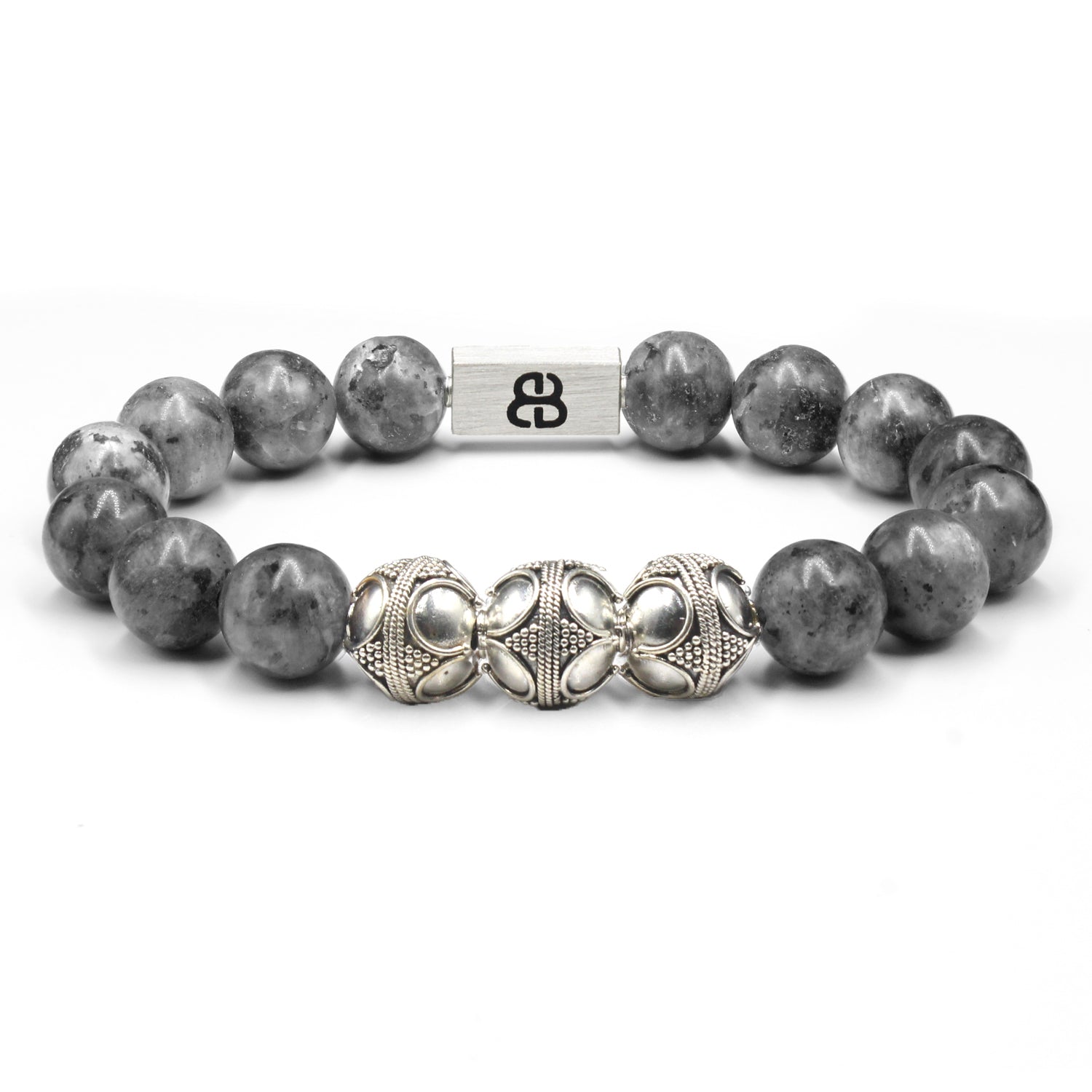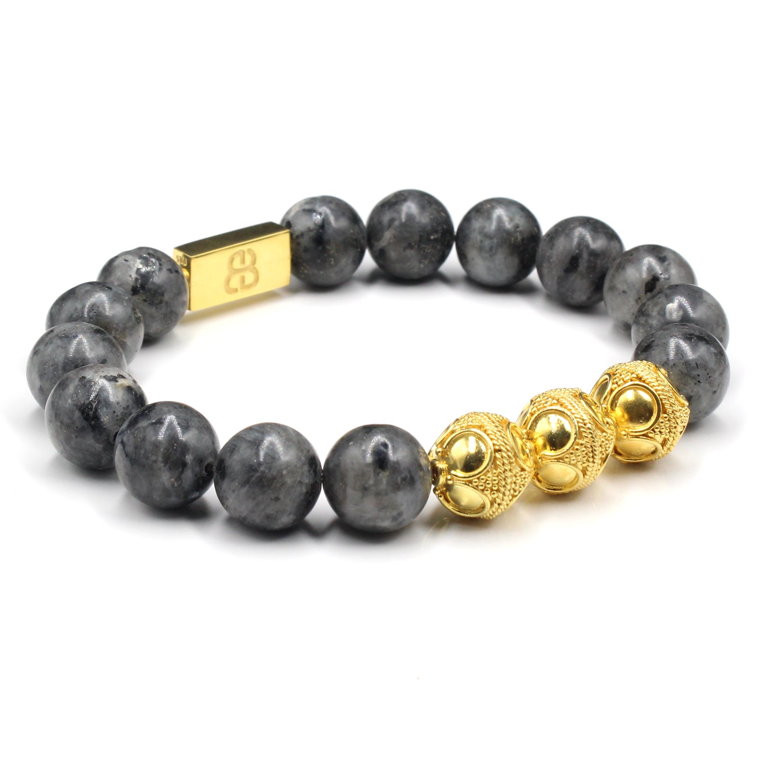 - This bracelet features 12mm matte larvikite beads accented with three handmade 12mm 22 karat gold plated sterling silver Bali beads and a “Bali Beads” logo anchor bead.
