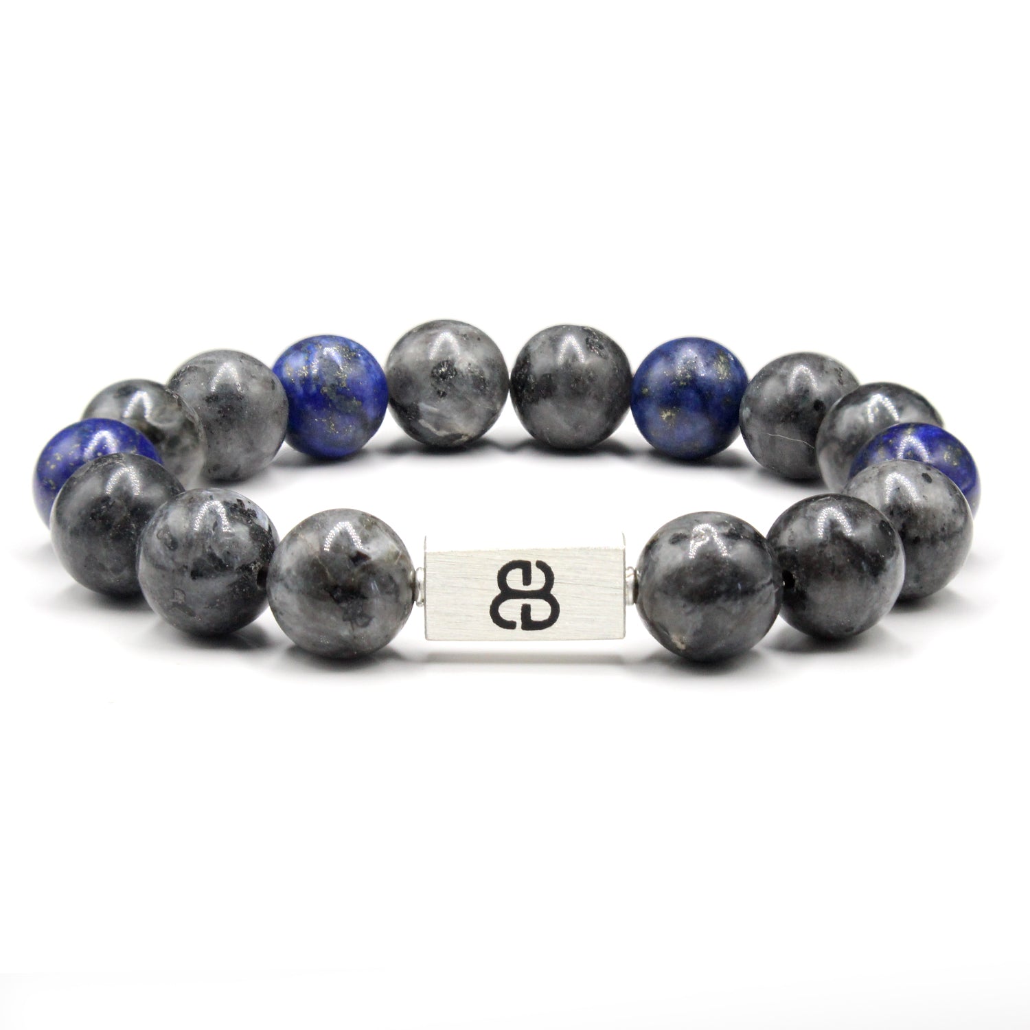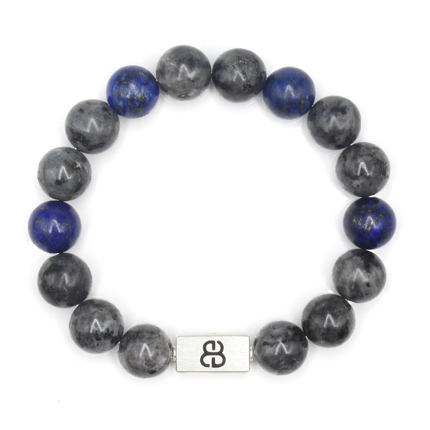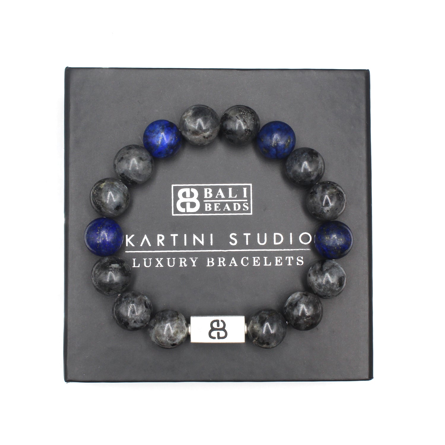 This men's bracelet features 12mm blue-grey labradorite beads and 12mm lapis lazuli beads accented with a 16mm x 8mm x 6mm brushed sterling silver "Bali Beads" logo bead.
