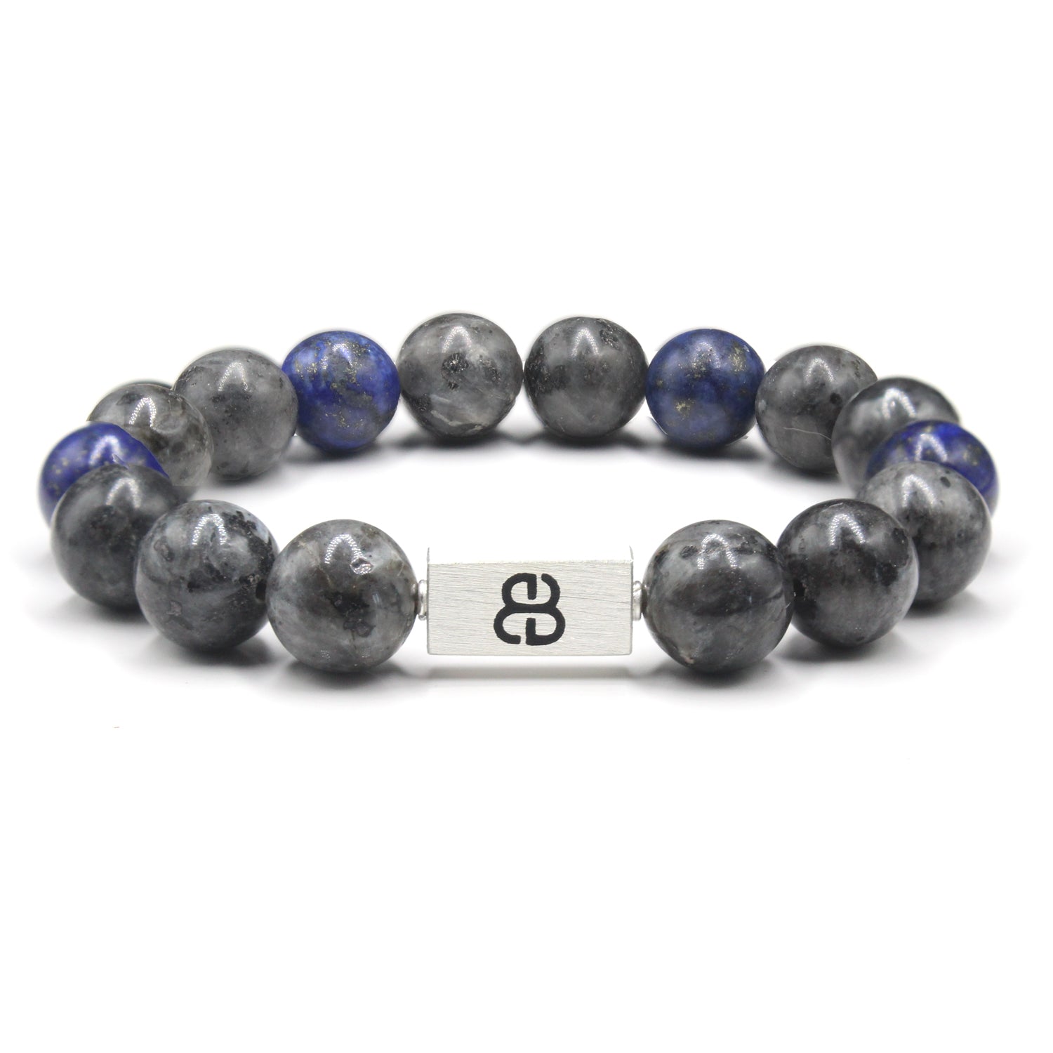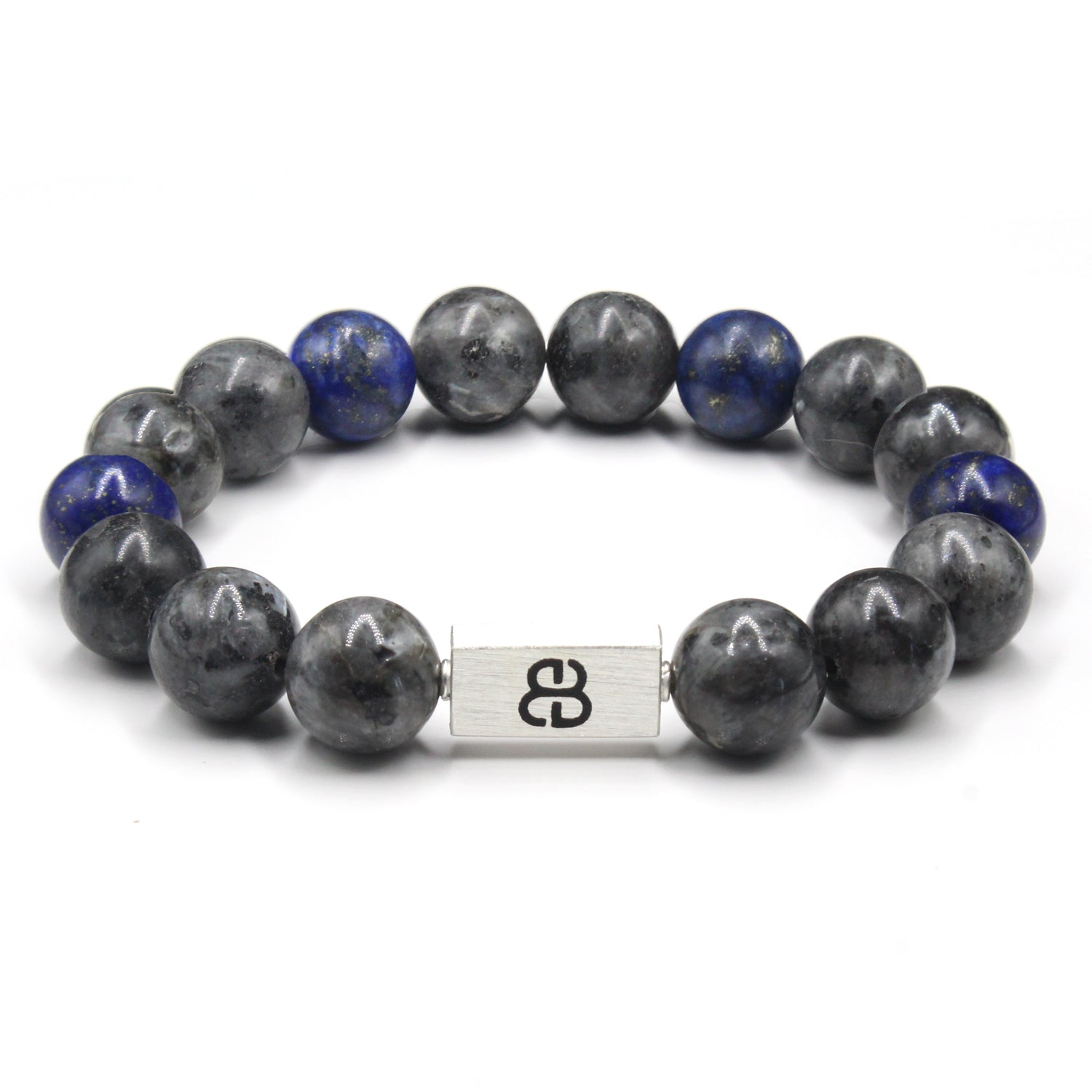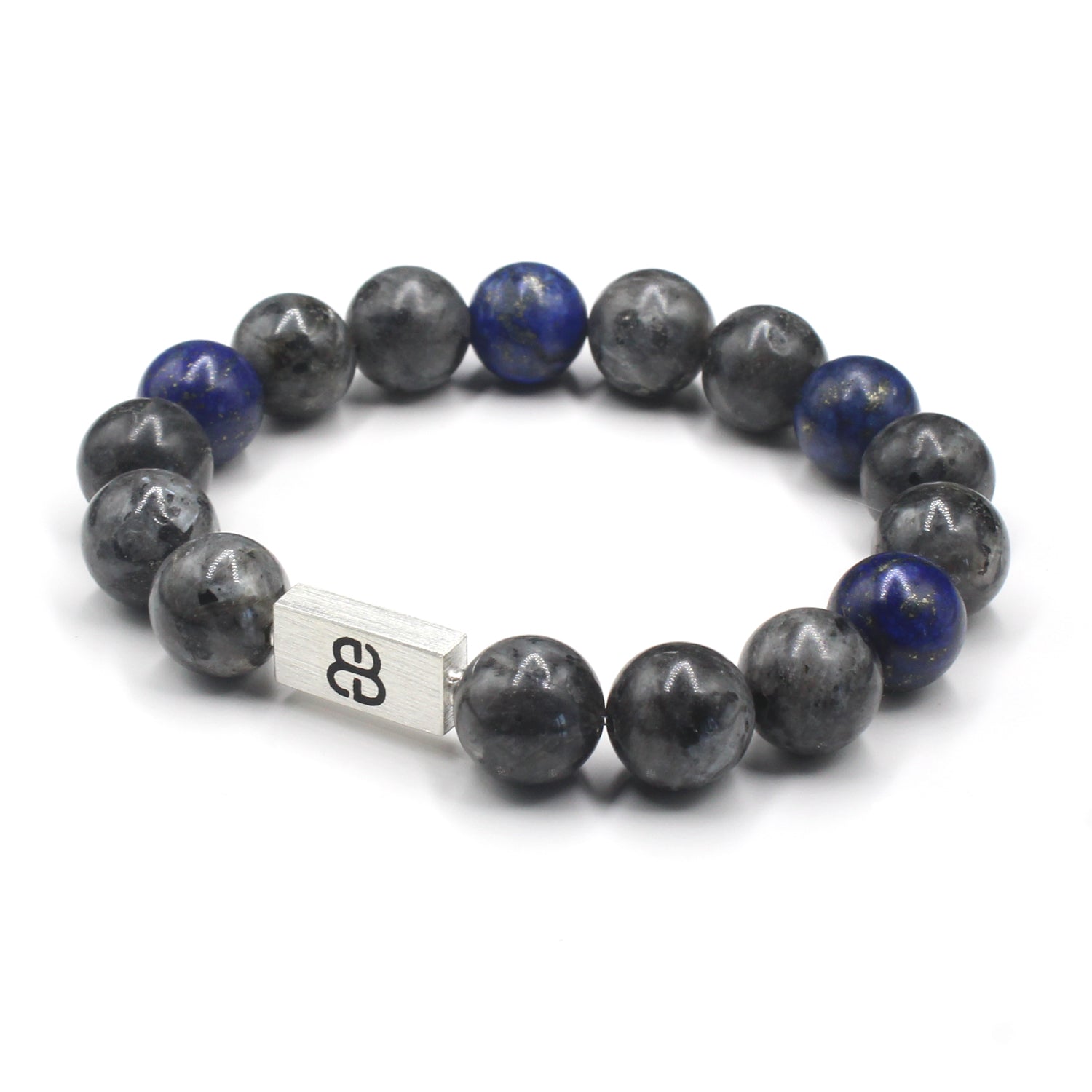 This men's bracelet features 12mm blue-grey labradorite beads and 12mm lapis lazuli beads accented with a 16mm x 8mm x 6mm brushed sterling silver "Bali Beads" logo bead.