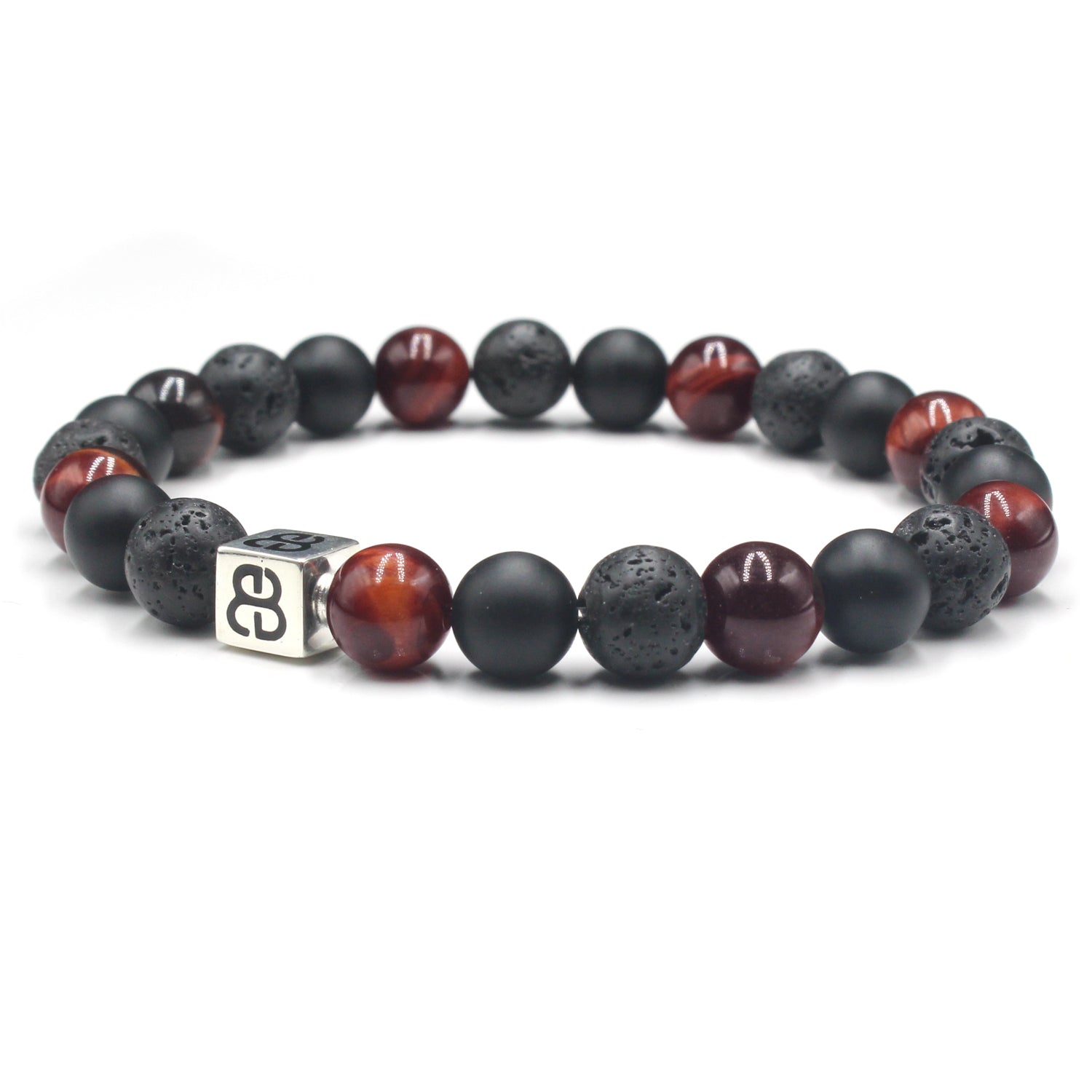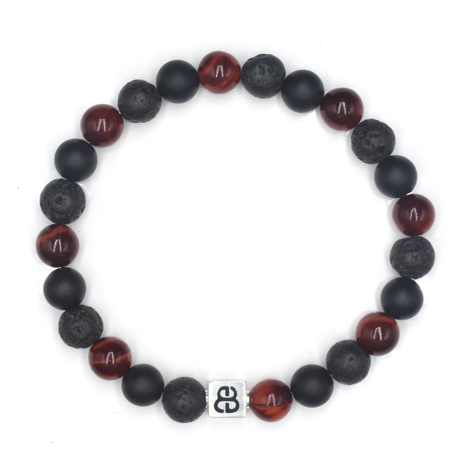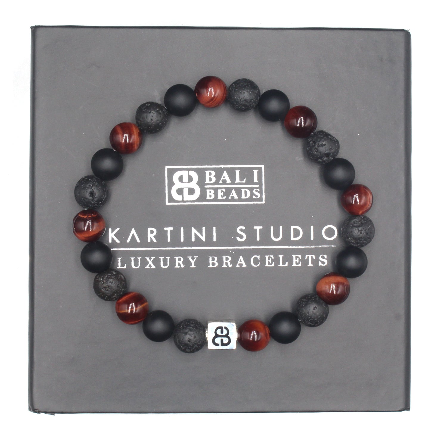 This bracelet features 8mm matte black onyx beads, 8mm red tiger's eye beads, and 8mm volcanic lava stone beads accented with a 8mm x 8mm sterling silver "Bali Beads" logo bead.