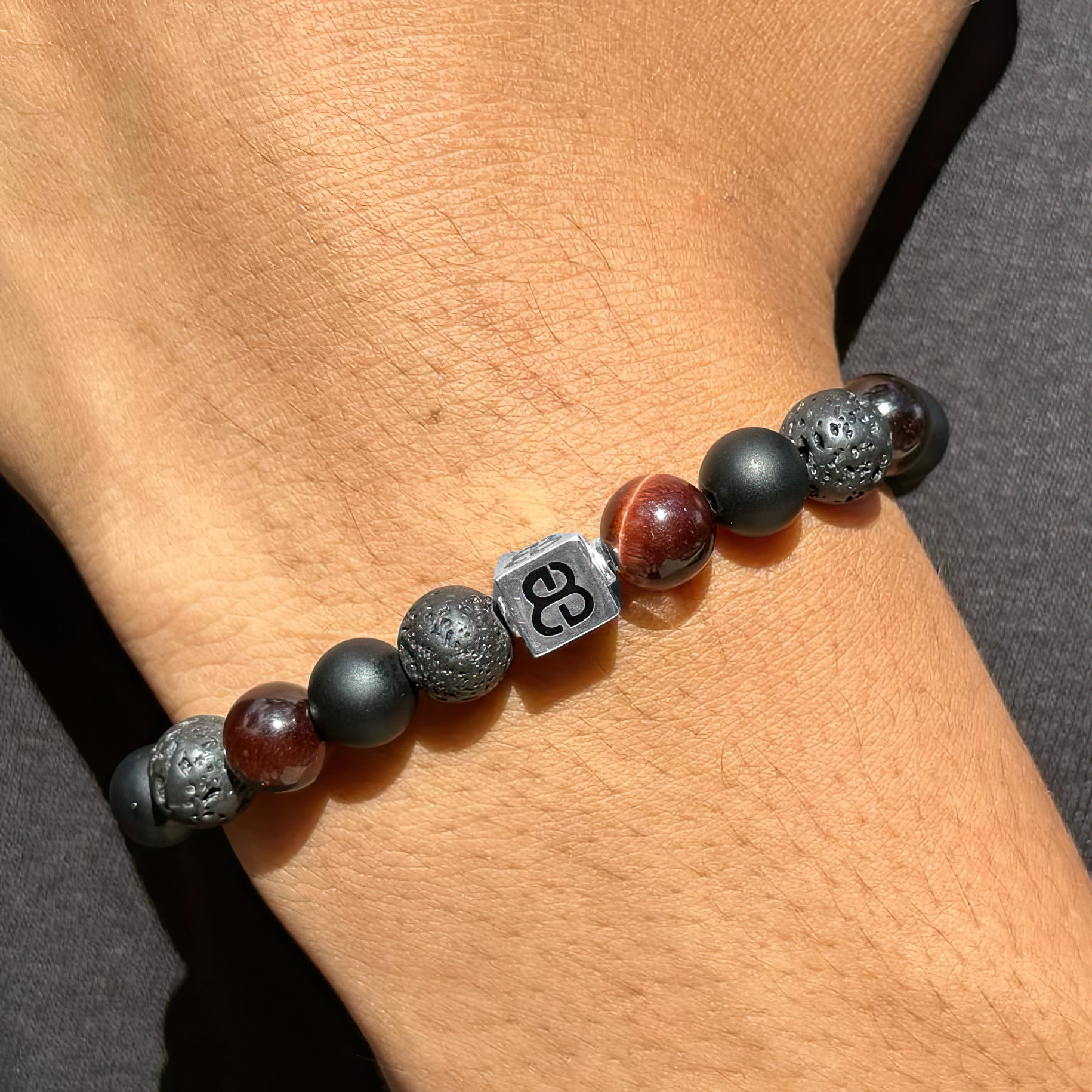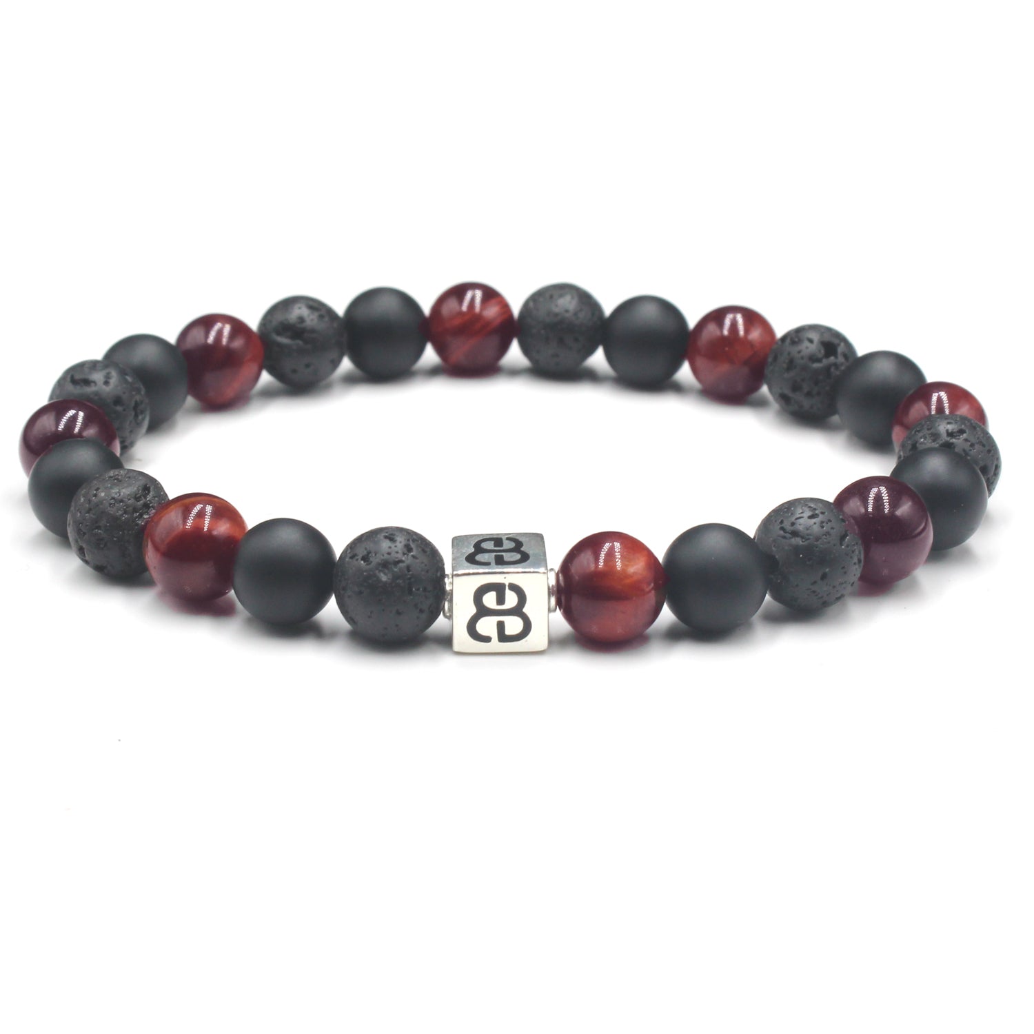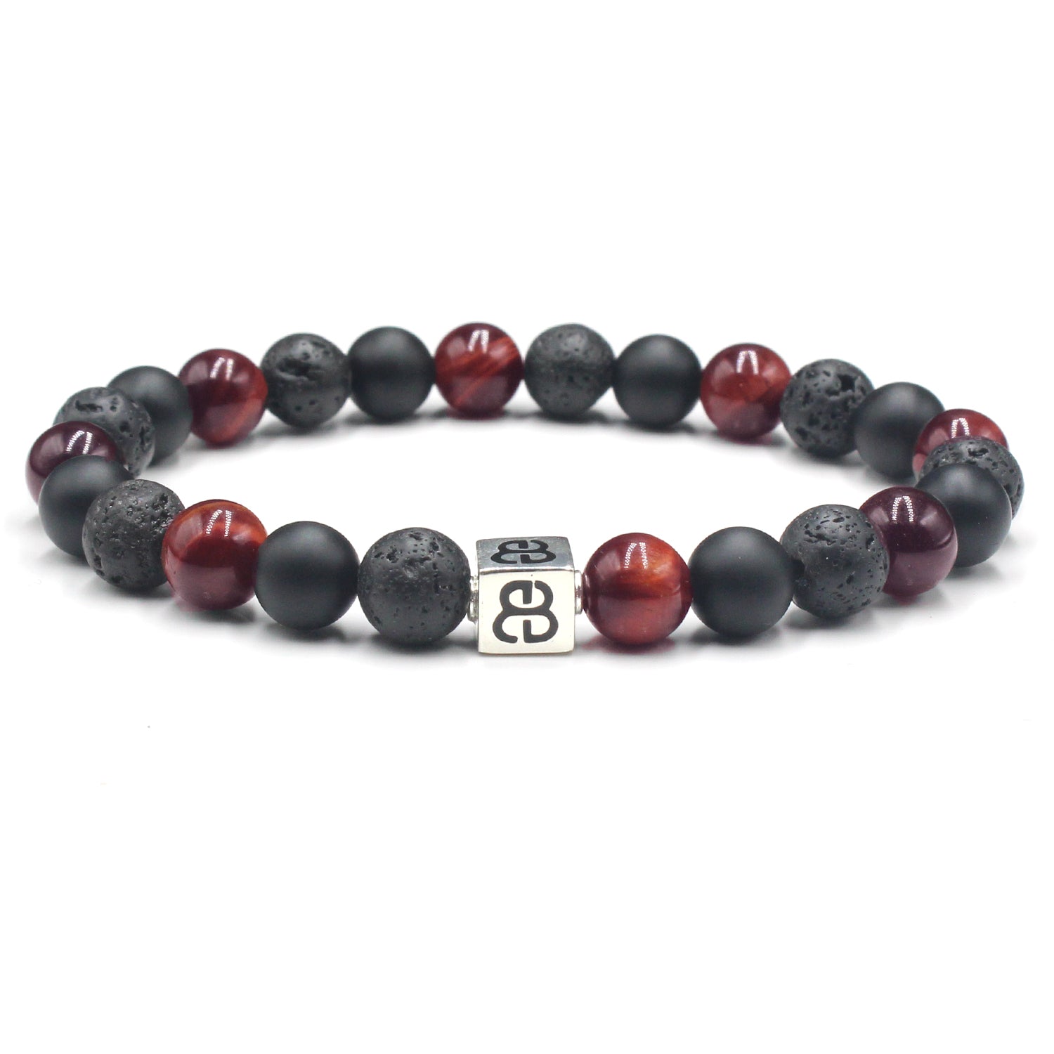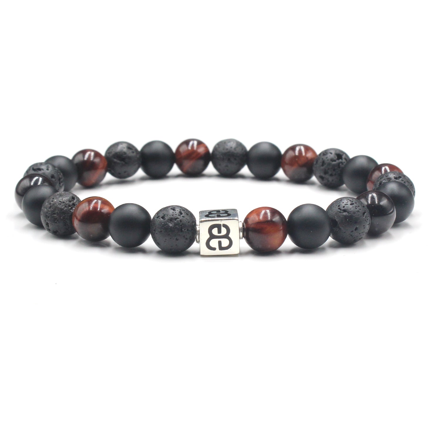 This bracelet features 8mm matte black onyx beads, 8mm red tiger's eye beads, and 8mm volcanic lava stone beads accented with a 8mm x 8mm sterling silver "Bali Beads" logo bead.