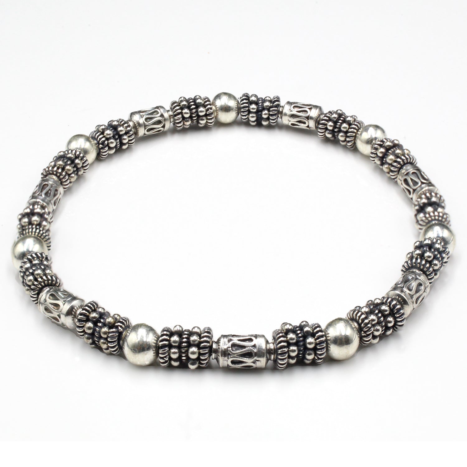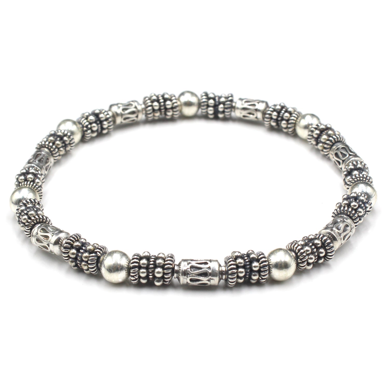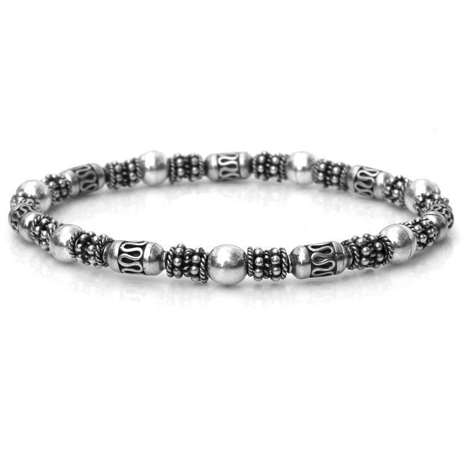 This bracelet features a selection of genuine sterling silver Bali beads and including 6mm sterling silver ball beads