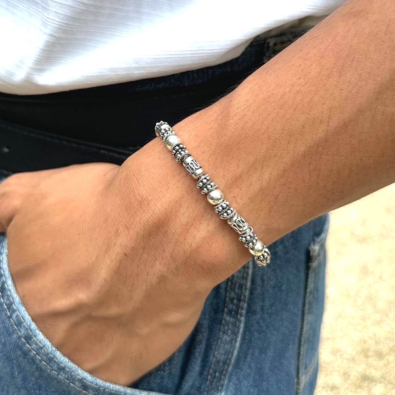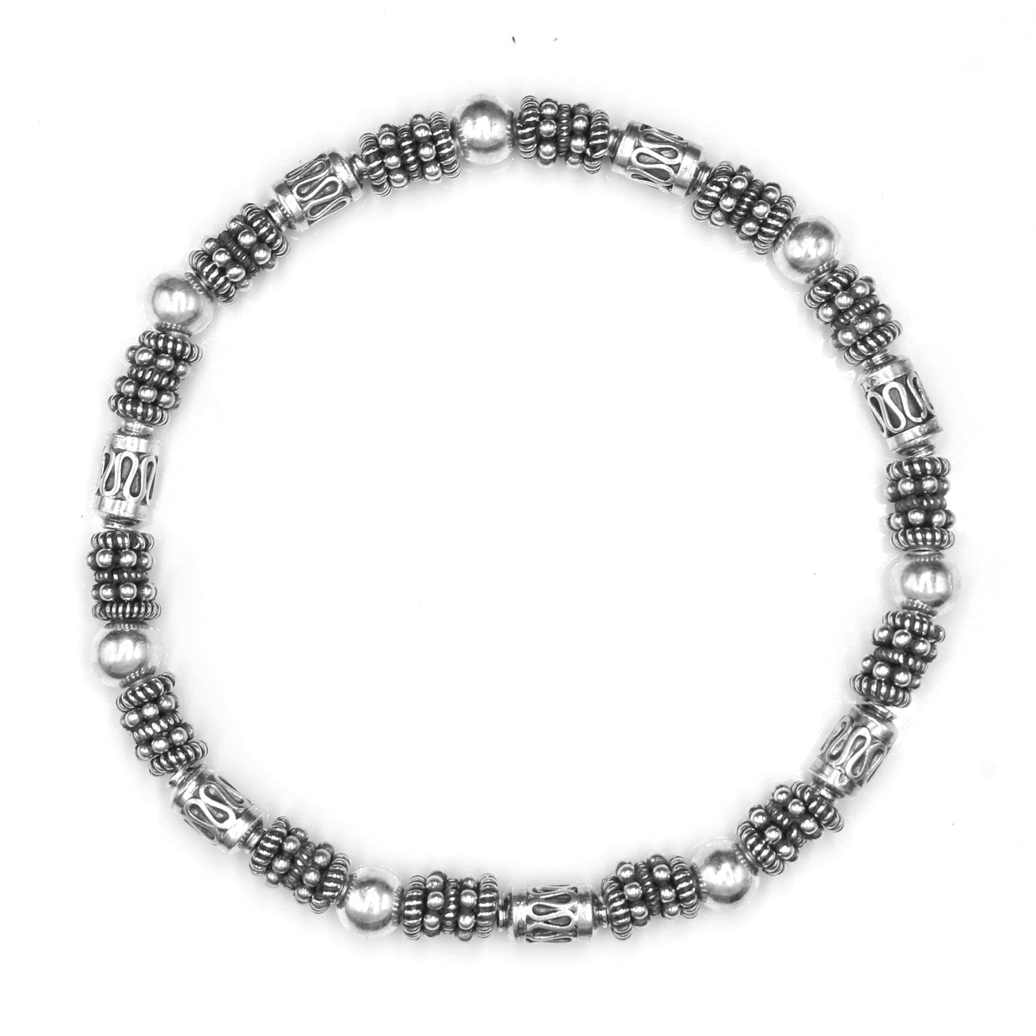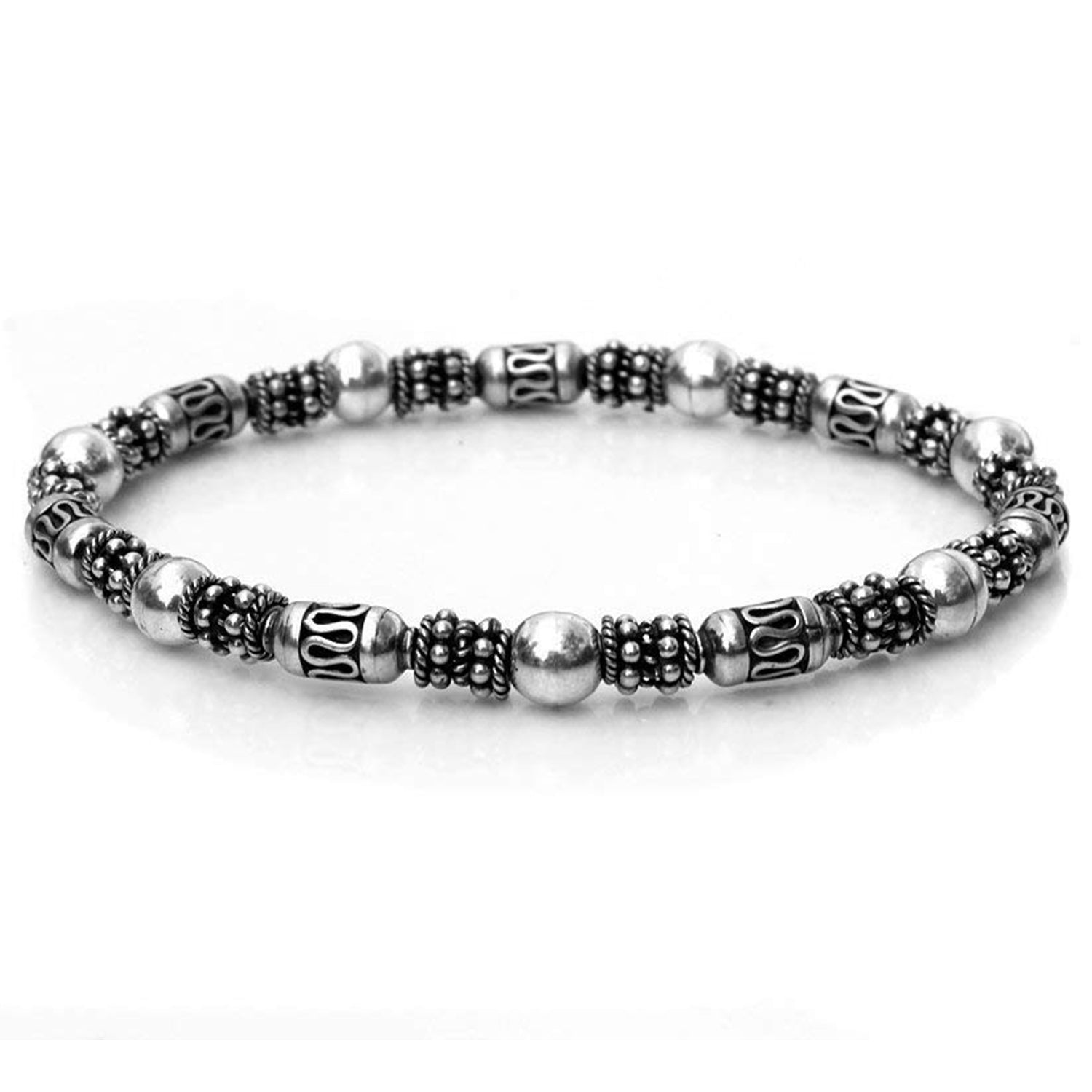 This bracelet features a selection of genuine sterling silver Bali beads and including 6mm sterling silver ball beads