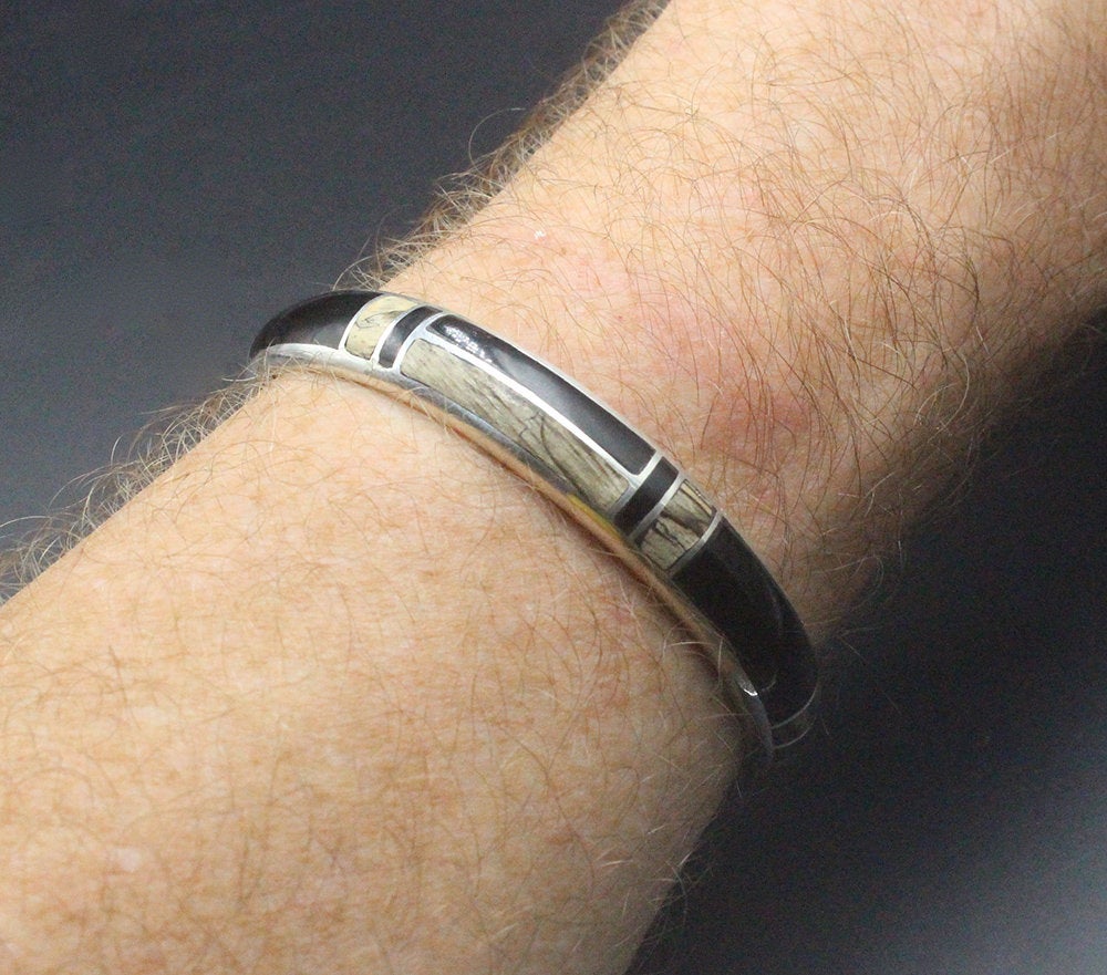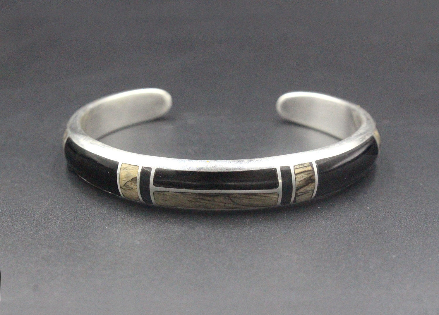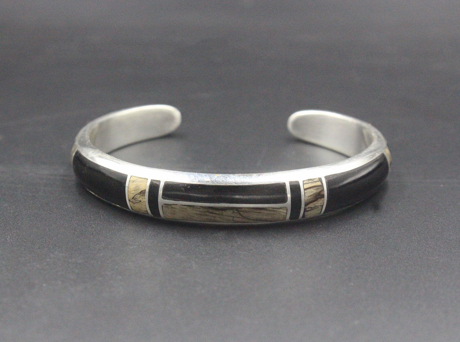 This is a solid sterling silver cuff bracelet with inlaid black onyx stone and spalted tamarind wood. Tamarind wood is an exotic tropical wood. Spalted tamarind wood has developed beautiful line patterns thru aging. The wood is sealed for protection. The bracelet width is 10mm. The gap is 1.25 inch for man's wrist size, 1 inch for woman's wrist size. Select your wrist size and we will make your bracelet to fit. Please measure your wrist size if you are unsure of the size. It takes approximately two weeks to make this bracelet. Your bracelet comes in a bracelet gift box.