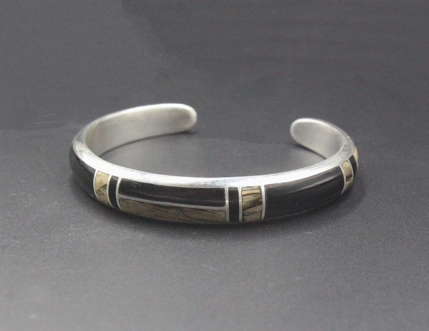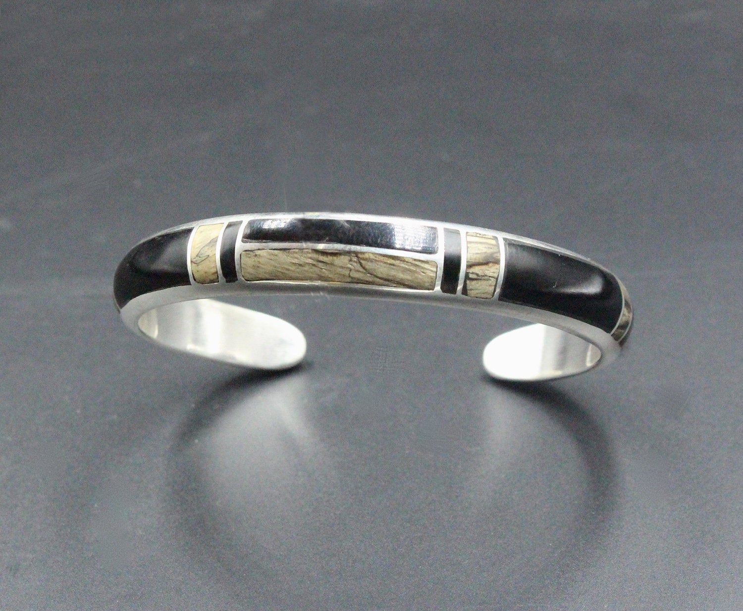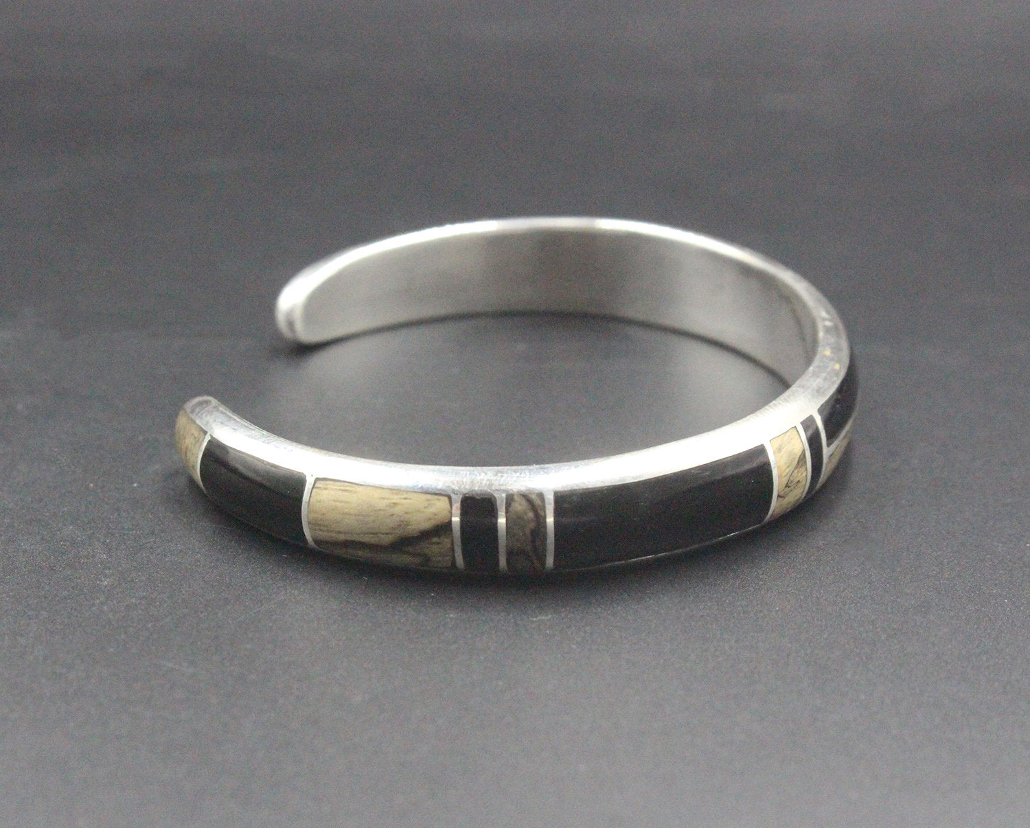 This is a solid sterling silver cuff bracelet with inlaid black onyx stone and spalted tamarind wood. Tamarind wood is an exotic tropical wood. Spalted tamarind wood has developed beautiful line patterns thru aging. The wood is sealed for protection. The bracelet width is 10mm. The gap is 1.25 inch for man's wrist size, 1 inch for woman's wrist size. Select your wrist size and we will make your bracelet to fit. Please measure your wrist size if you are unsure of the size. It takes approximately two weeks to make this bracelet. Your bracelet comes in a bracelet gift box.