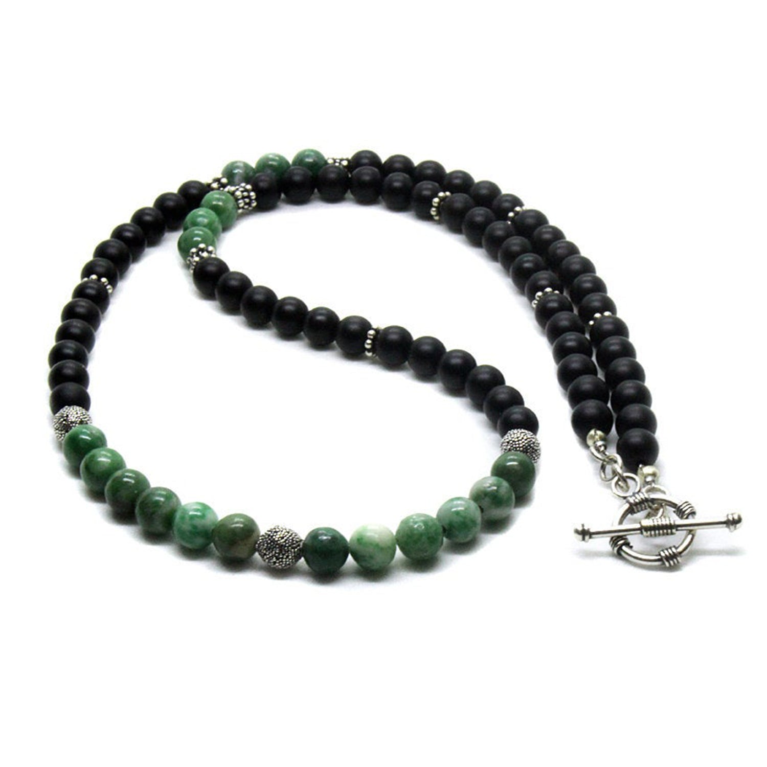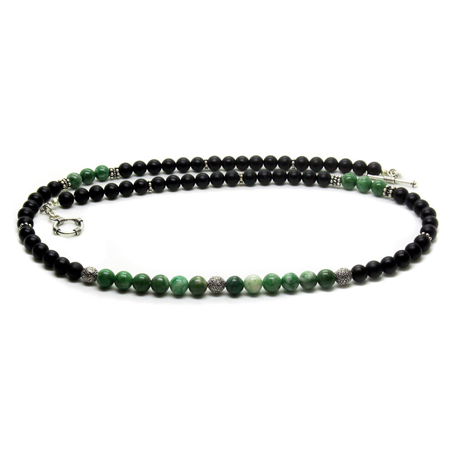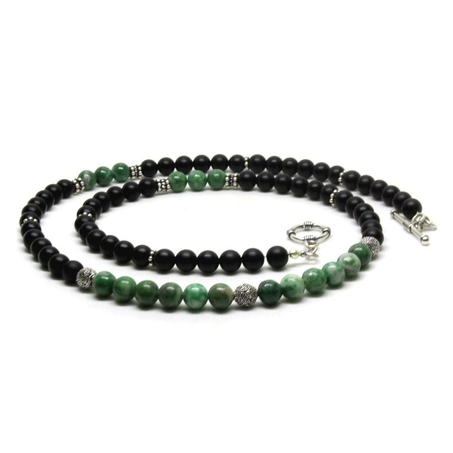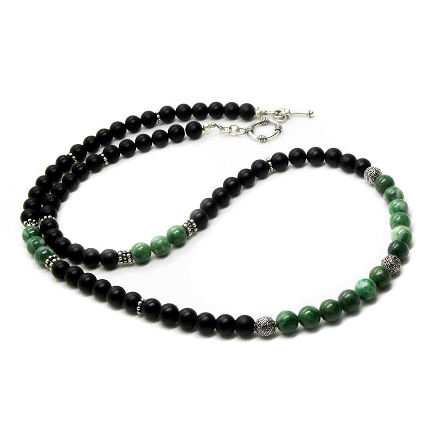 This men's necklace features 6mm matte black onyx beads and 6mm Qinghai jade beads accented with sterling silver Bali beads. It fastens with a sterling silver Bali toggle clasp.