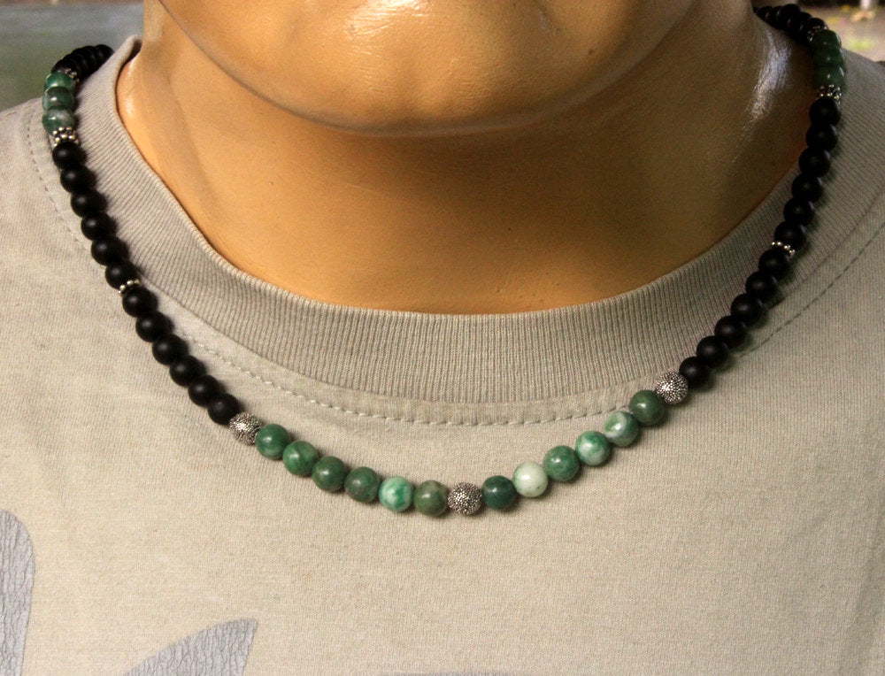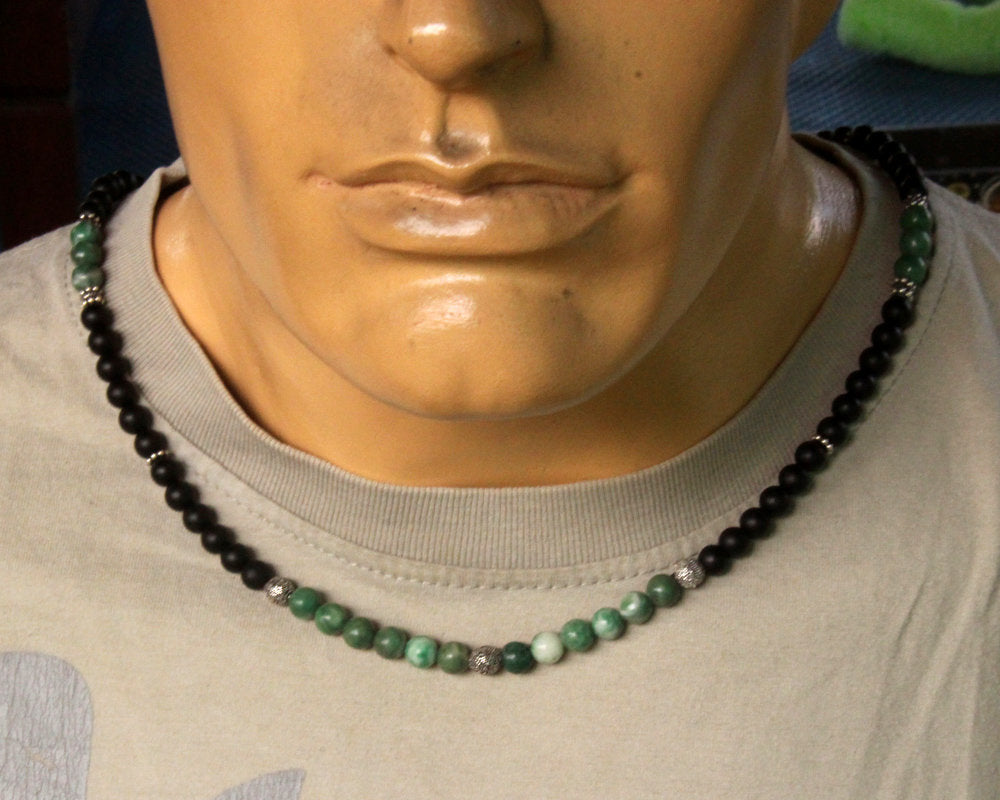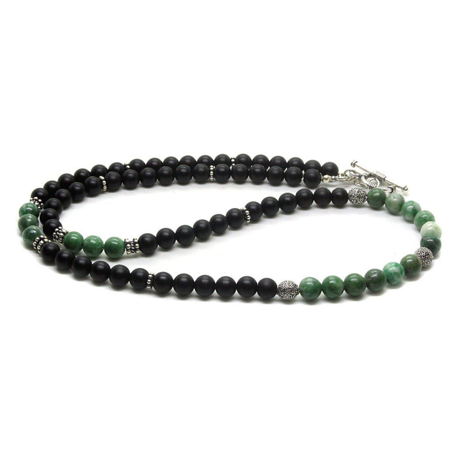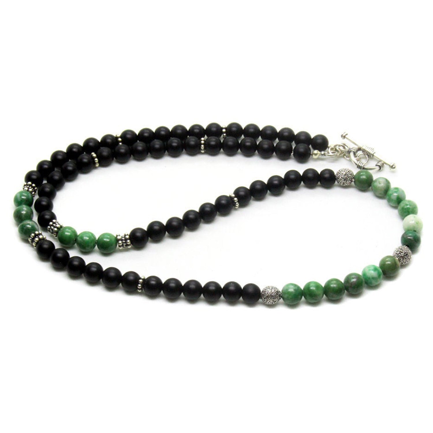 This men's necklace features 6mm matte black onyx beads and 6mm Qinghai jade beads accented with sterling silver Bali beads. It fastens with a sterling silver Bali toggle clasp.