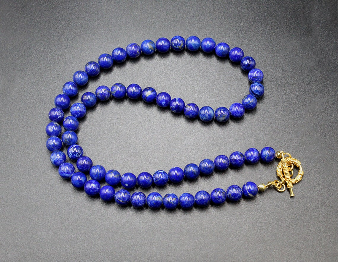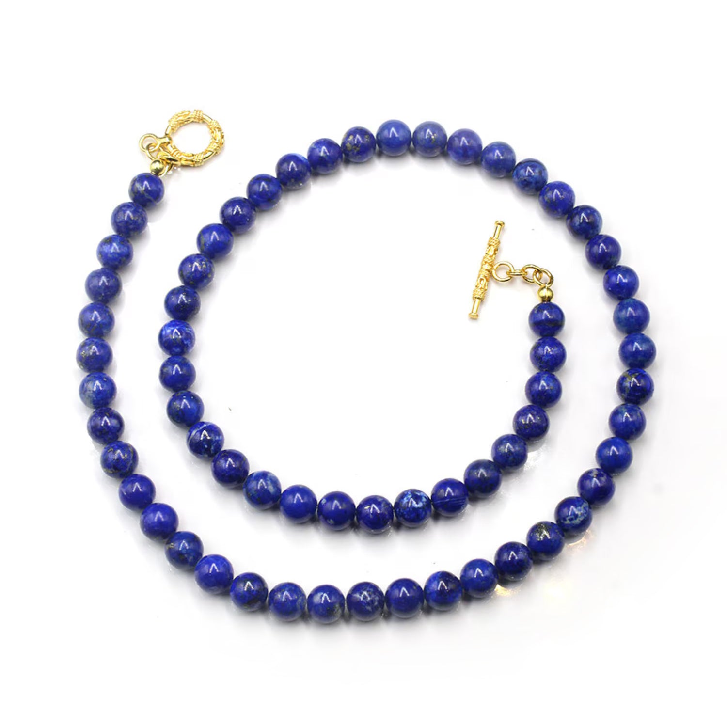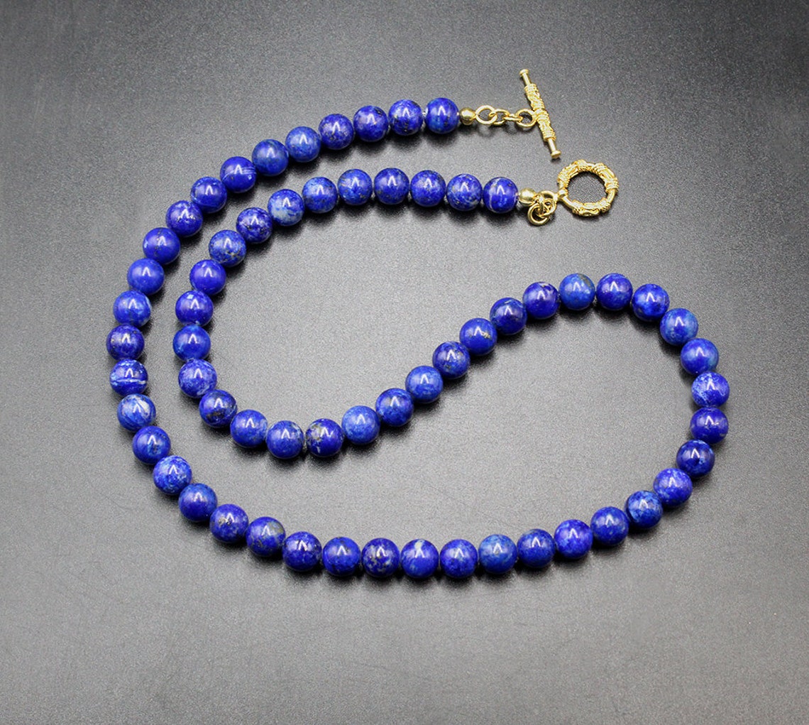 This men's necklace features 8mm natural lapis lazuli stone beads and fastens with a 16mm 22 karat gold plated sterling silver toggle clasp.