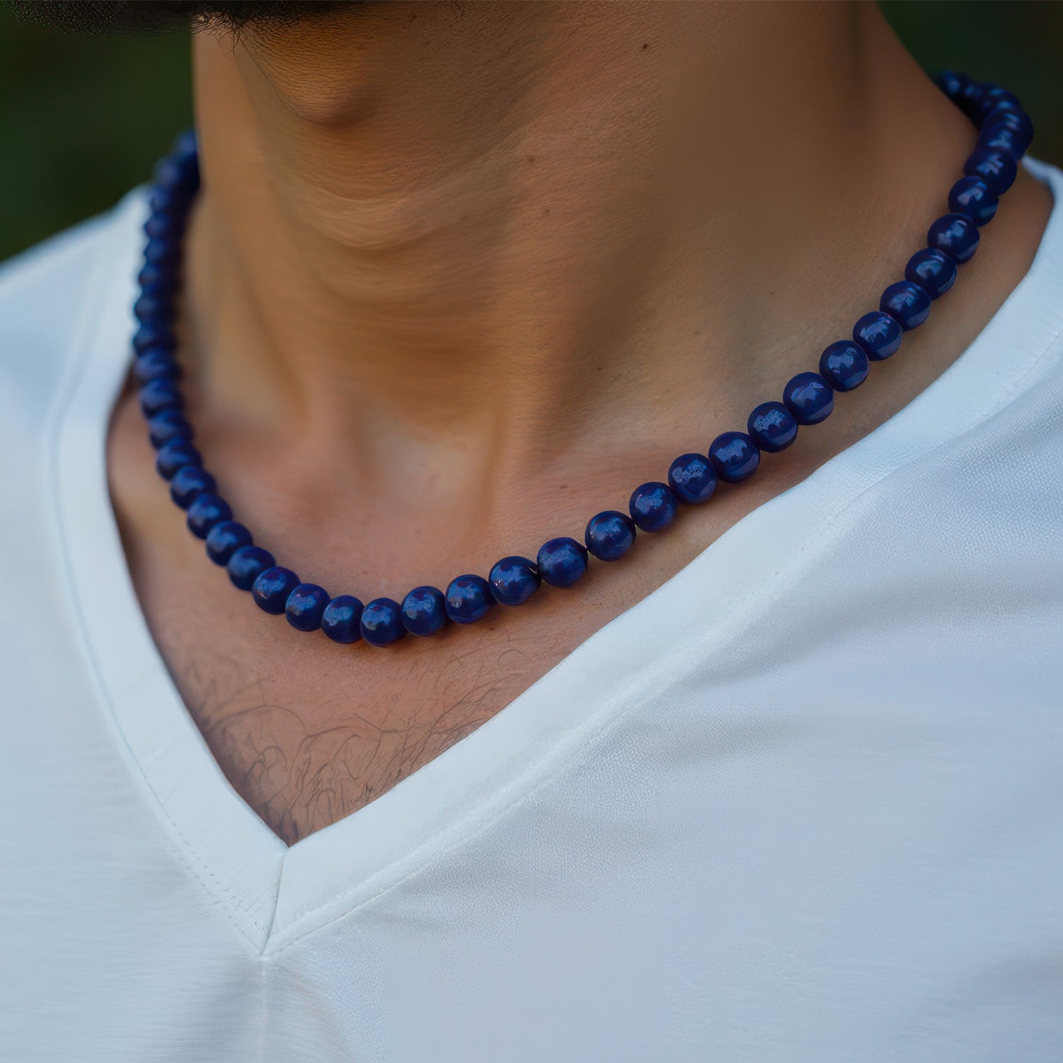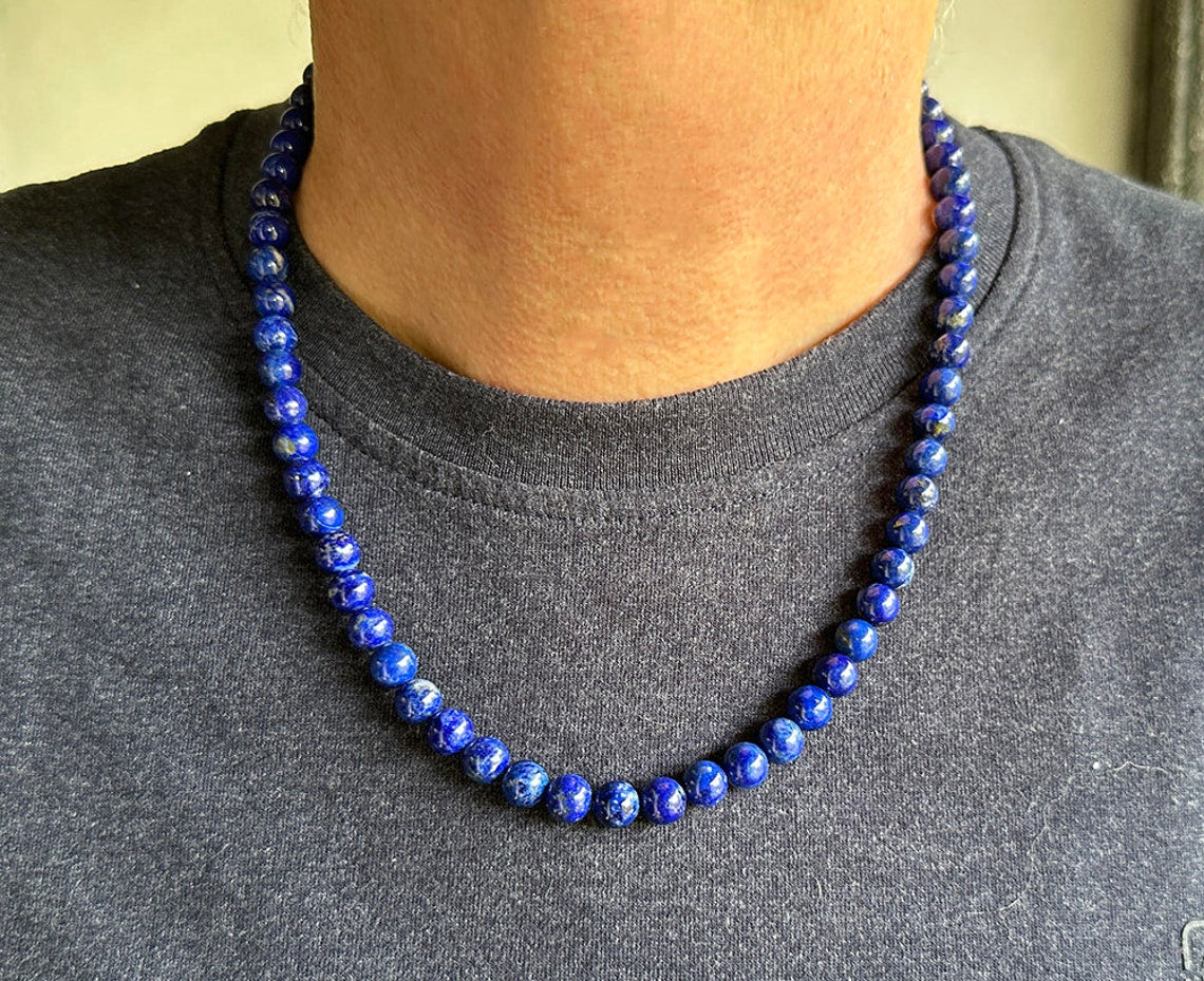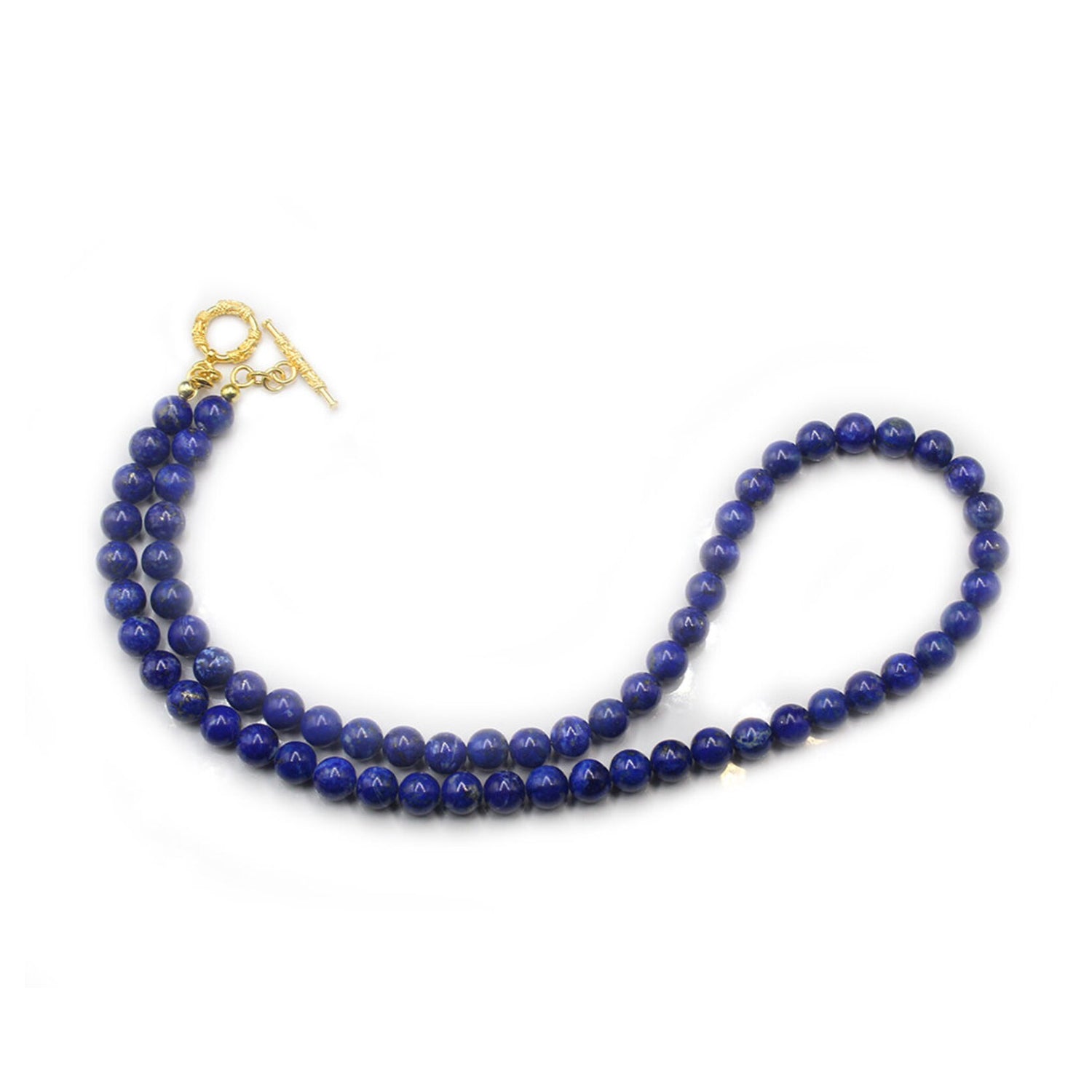 This men's necklace features 8mm natural lapis lazuli stone beads and fastens with a 16mm 22 karat gold plated sterling silver toggle clasp.