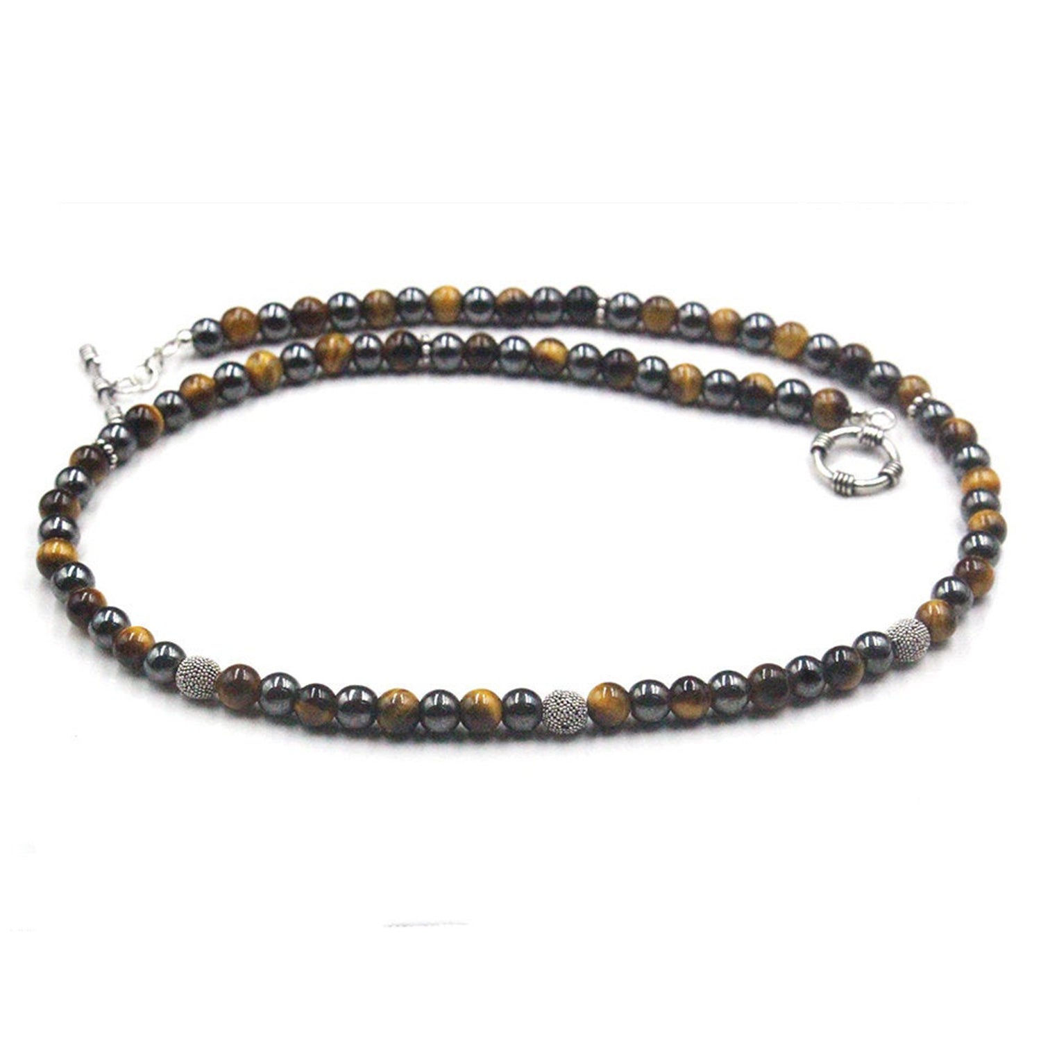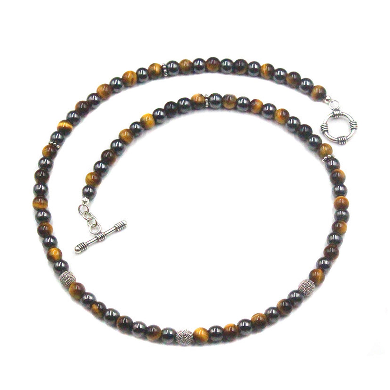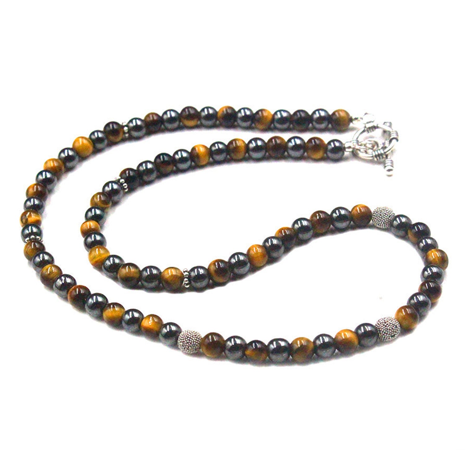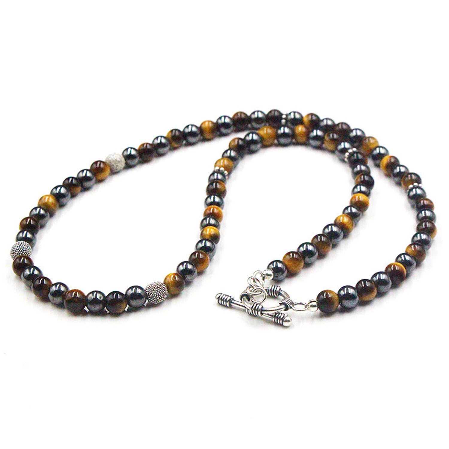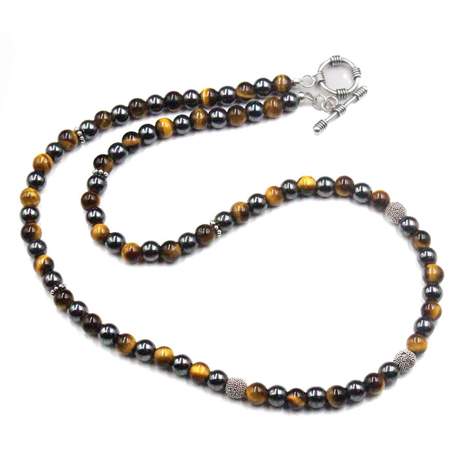 This men's necklace features 6mm tiger's eye beads and 6mm hematite beads accented with three 6mm sterling silver granulation beads and sterling silver spacers. It fastens with a solid sterling silver toggle clasp, and is strung on stainless steel wire for superior strength. Select your necklace size from the drop down menu.