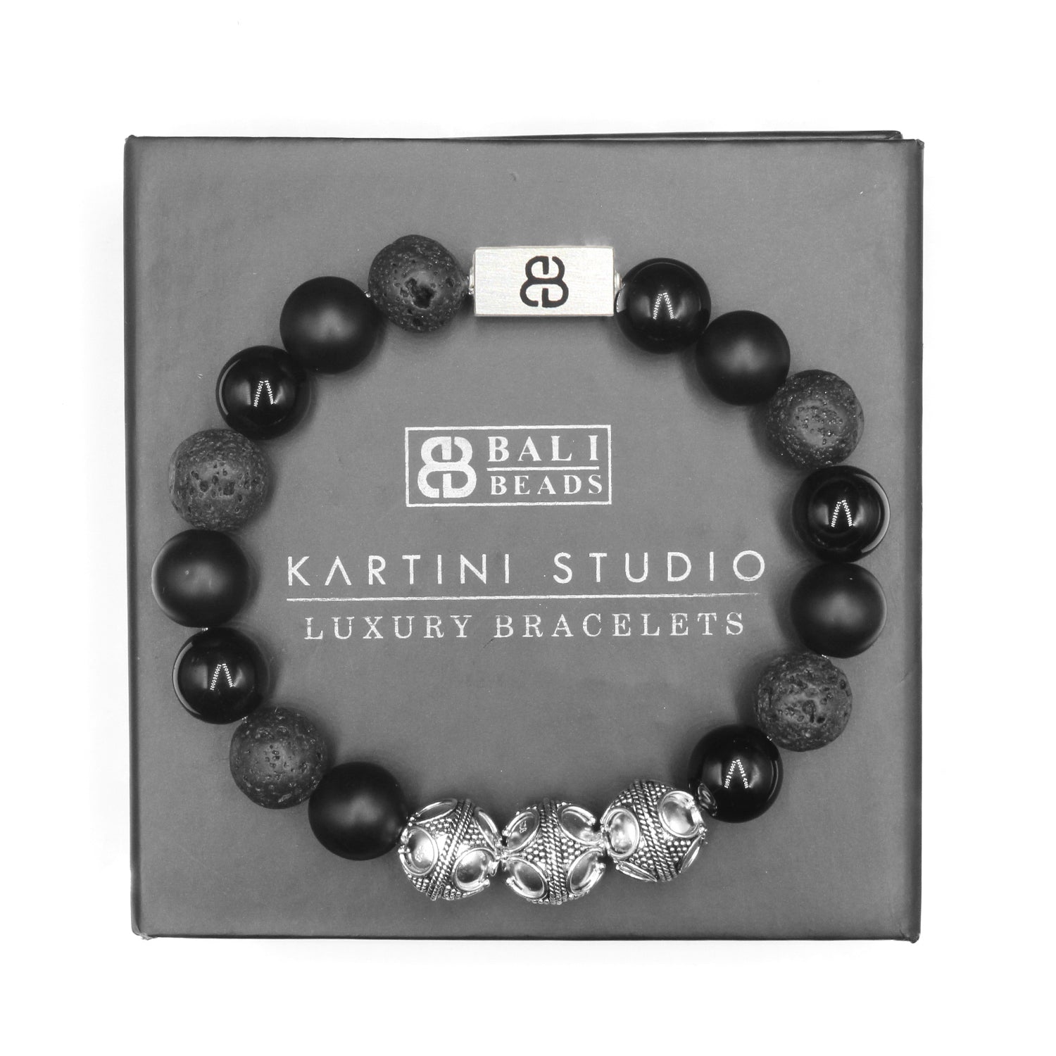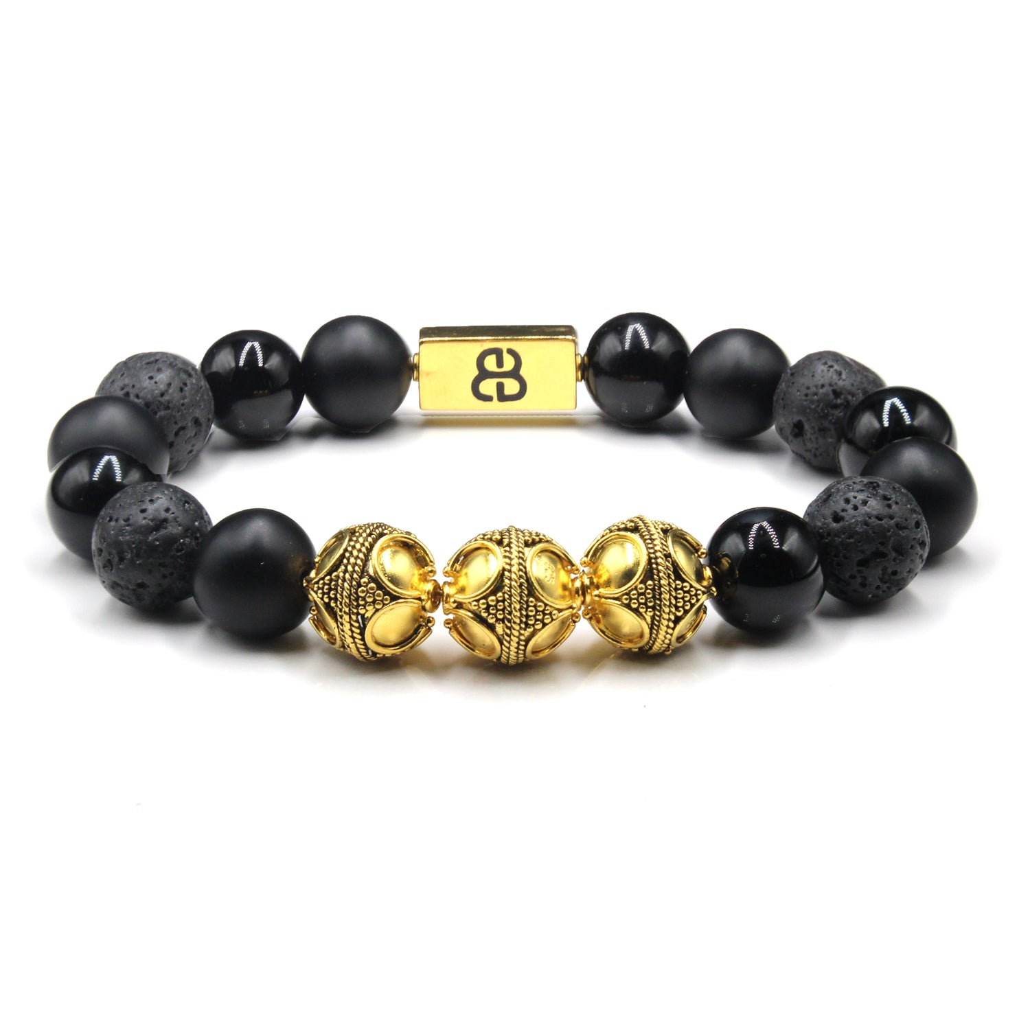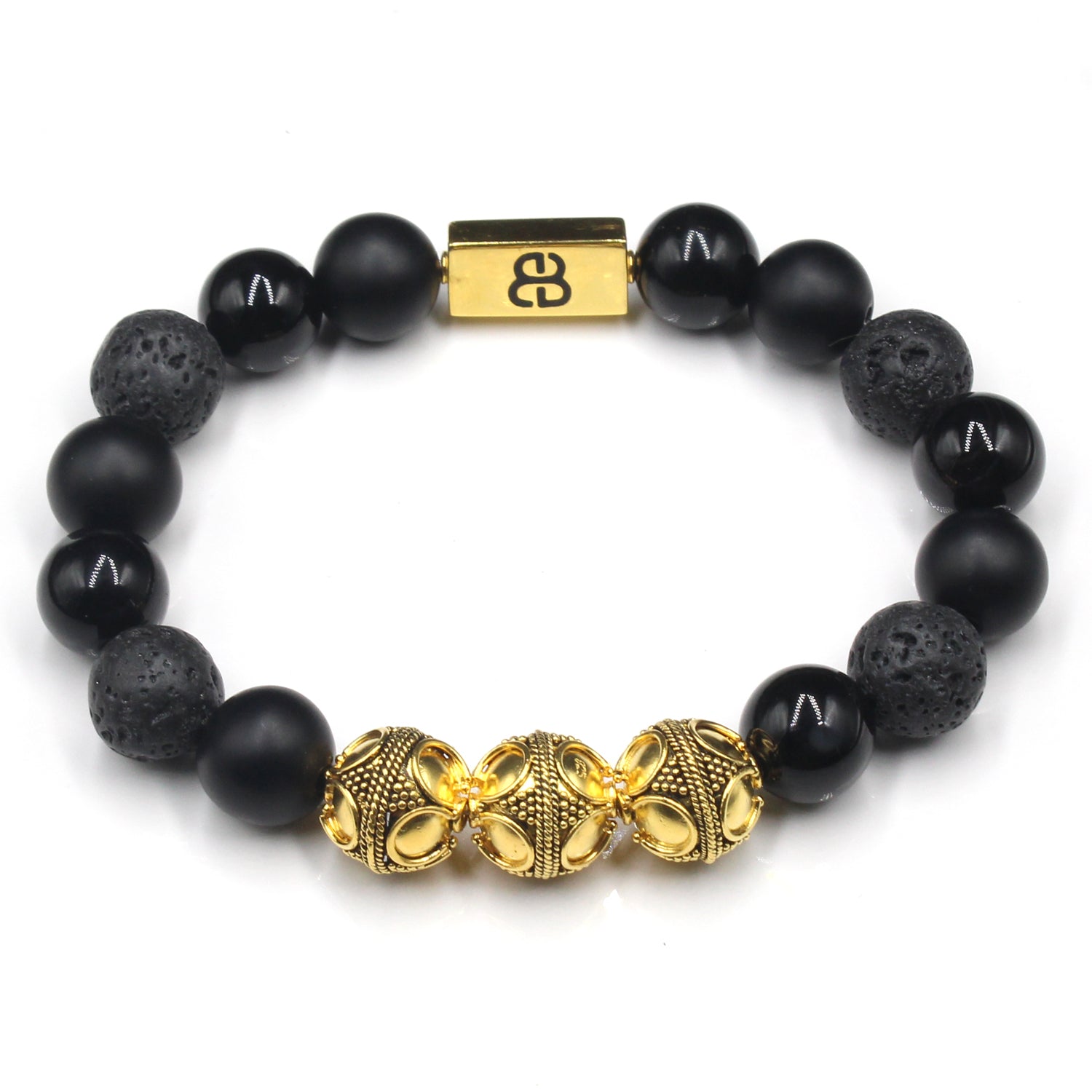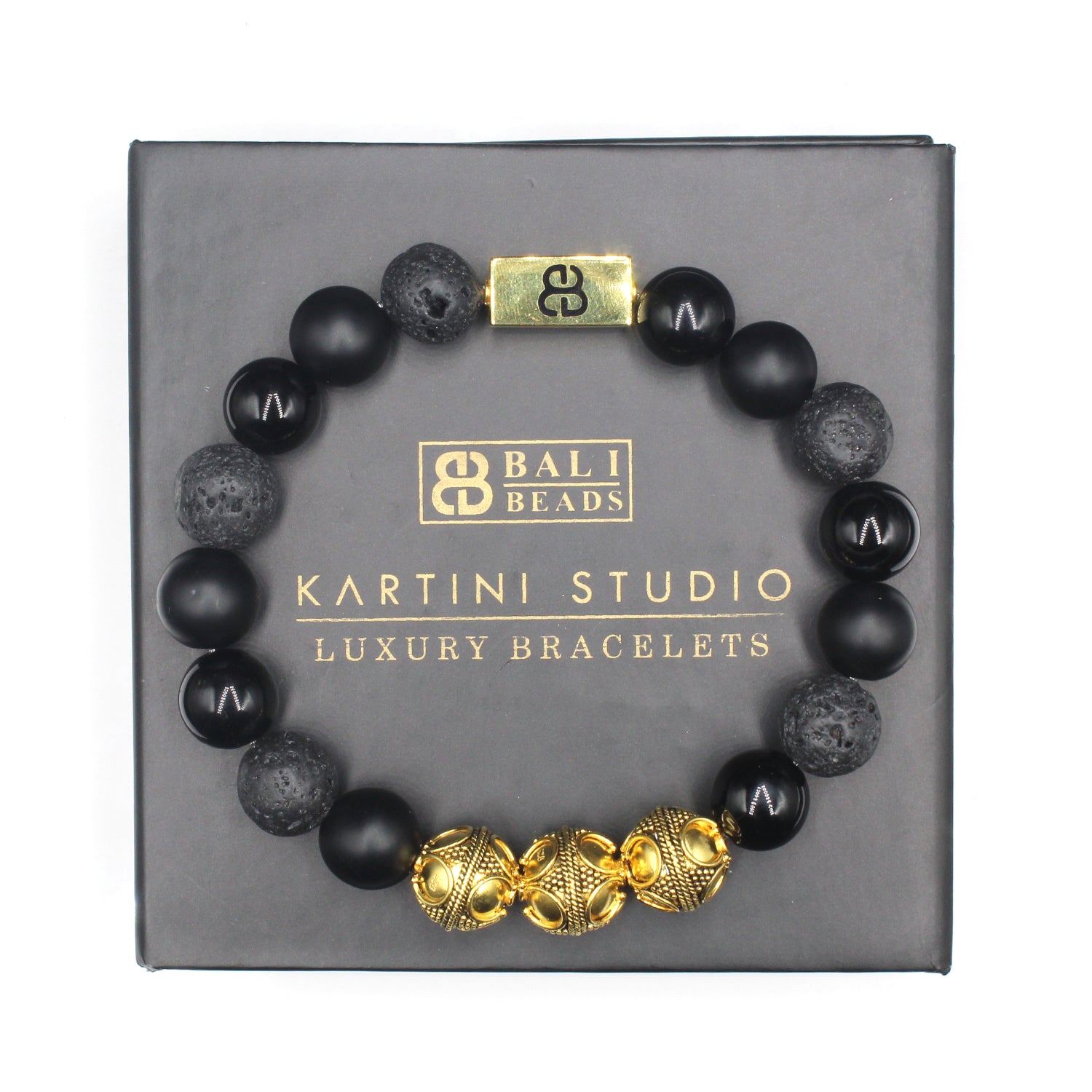This bracelet features 12mm lava stone, matte black onyx, and polished black onyx beads accented with three handmade 22 karat gold plated sterling silver Bali beads and a 16mm x 8mm 22 karat gold plated sterling silver "Bali Beads" logo bead. The gold is gently oxidized to darken the recessed areas.