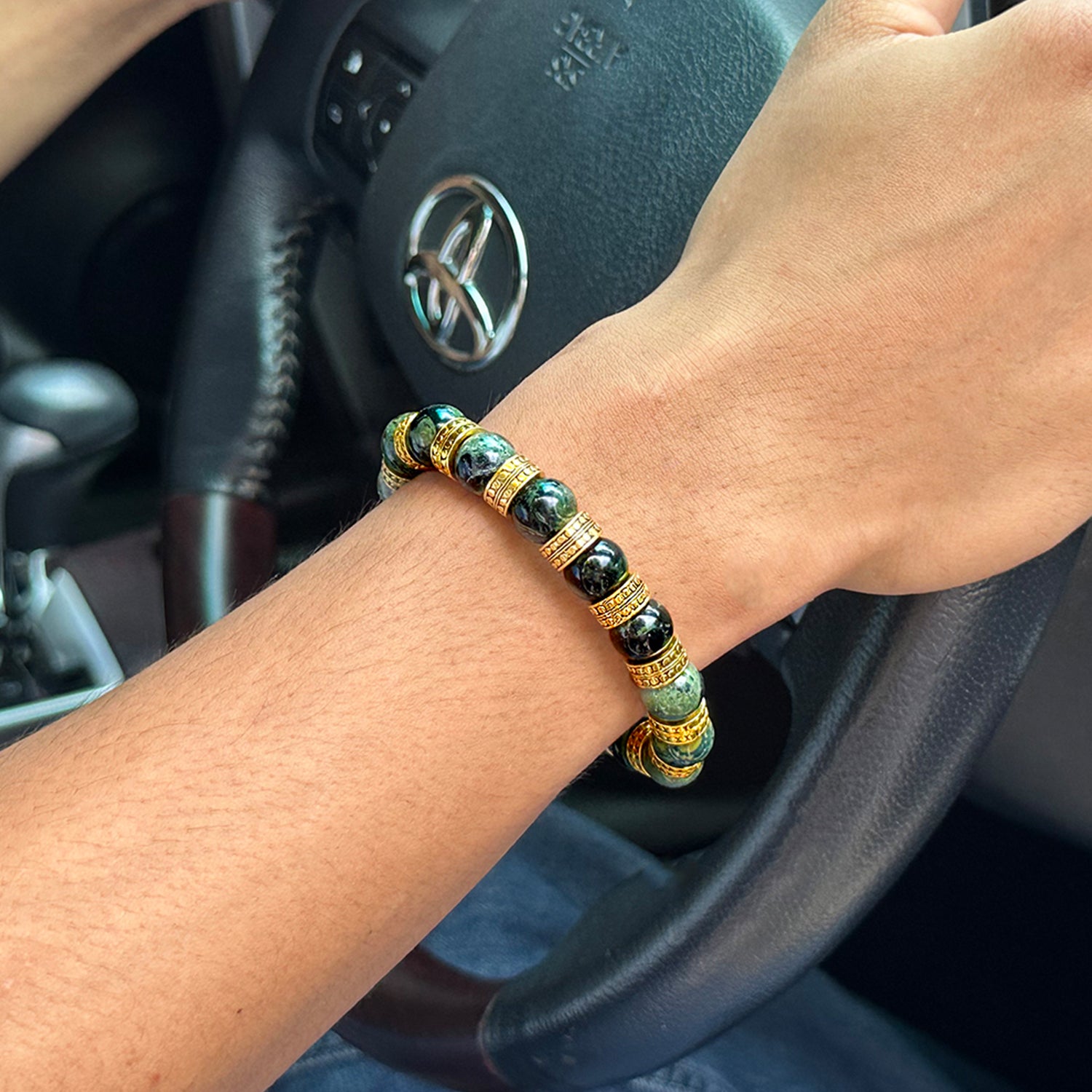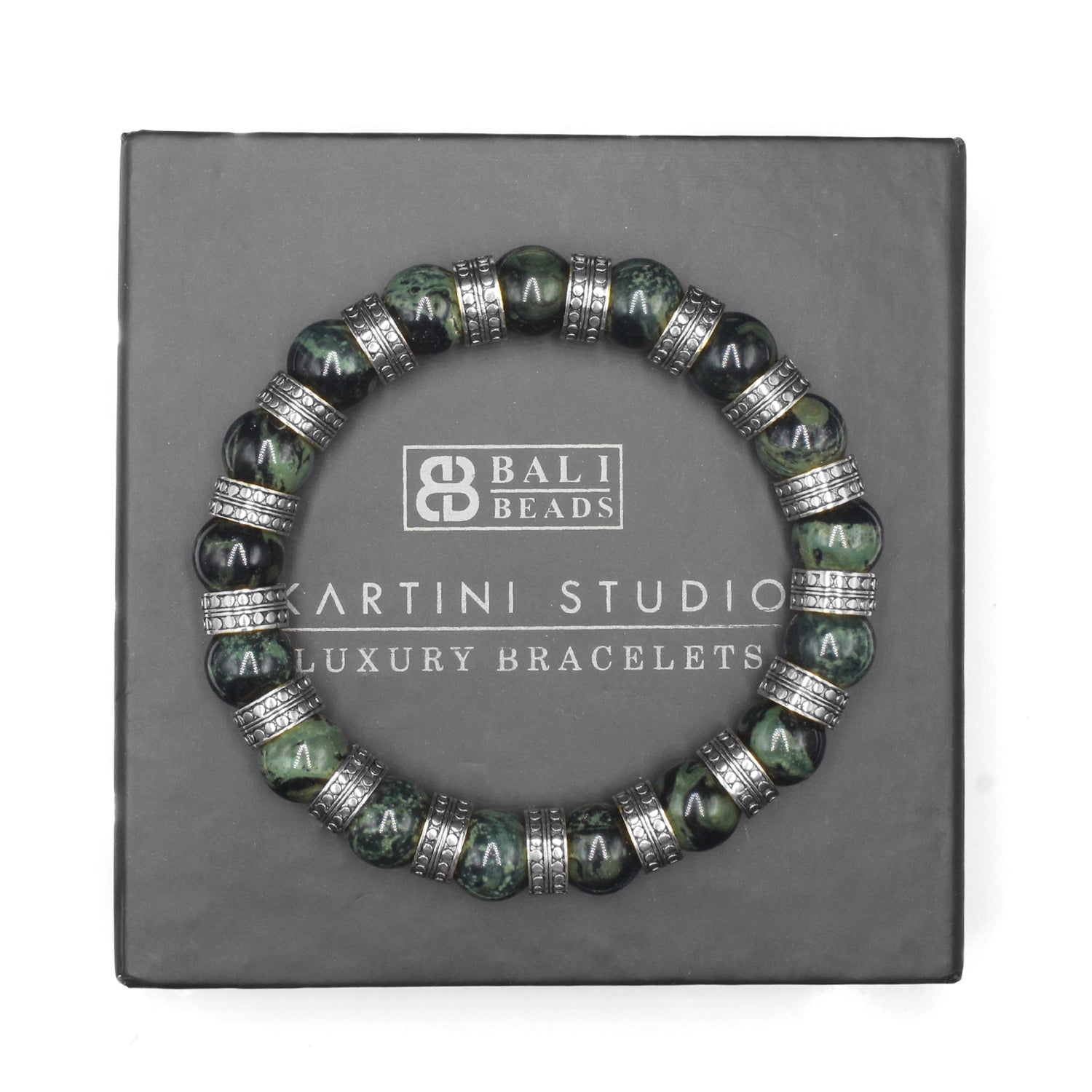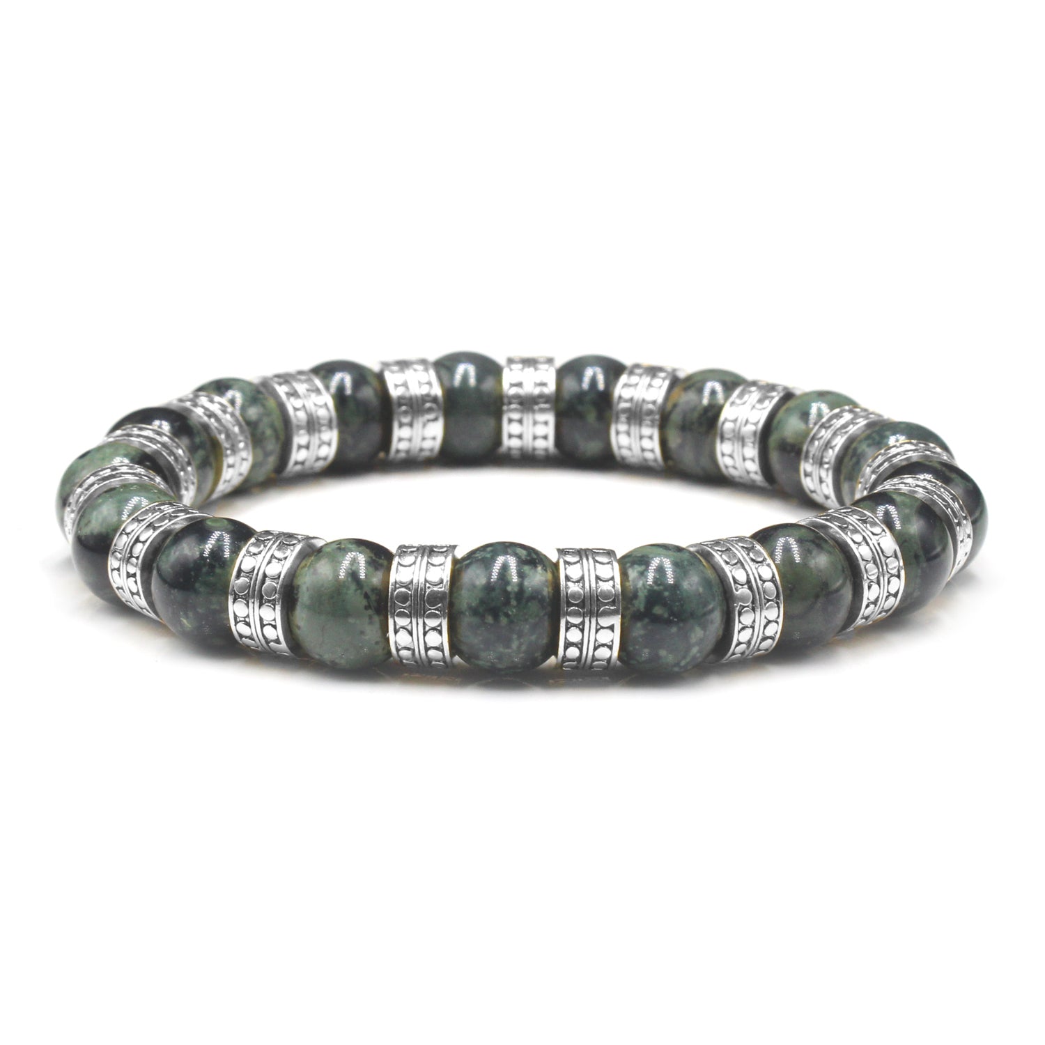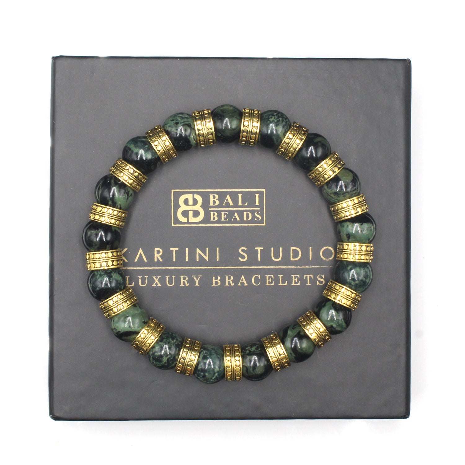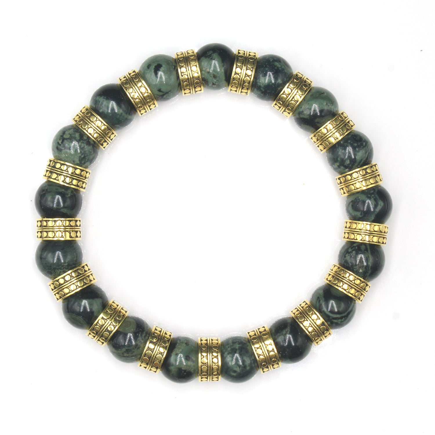 This bracelet features 10mm Nephrite Jade beads accented with handmade 22 karat gold plated sterling silver "dots" beads.