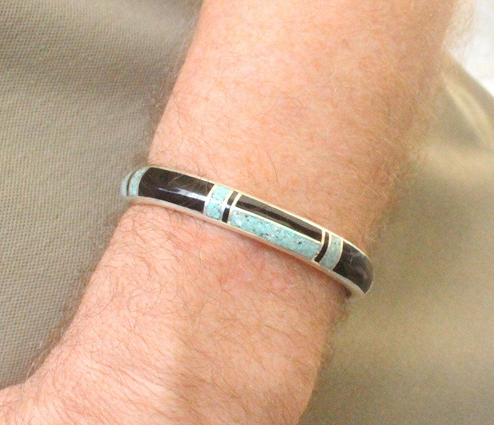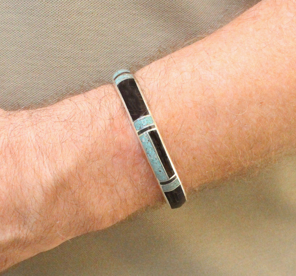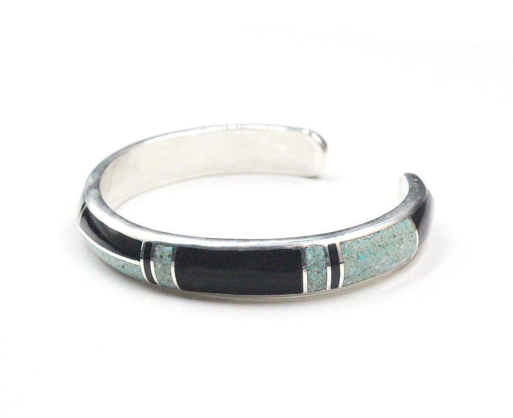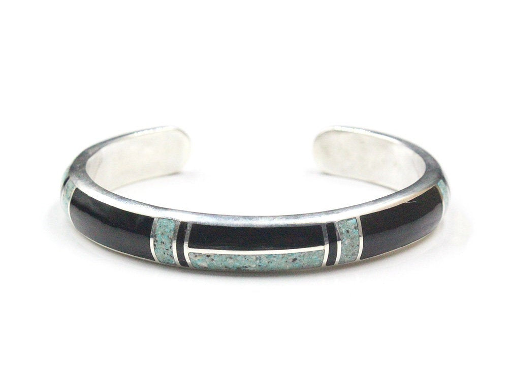 This cuff bracelet is made from solid sterling silver with inlaid black onyx and crushed Qinghai jade. The bracelet width is 10mm. The gap is 1.25 inches for a man's size wrist; 1 inch for a woman's size wrist. Select your wrist size from the drop down menu, and we will make your bracelet to fit. At the moment, it takes approximately 2 weeks to make this bracelet.