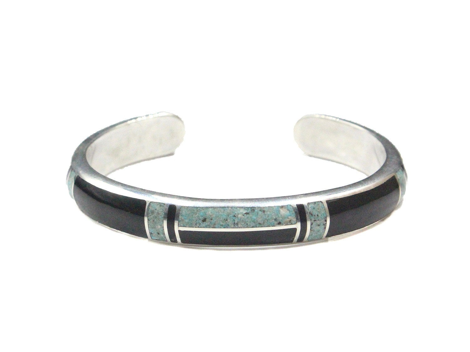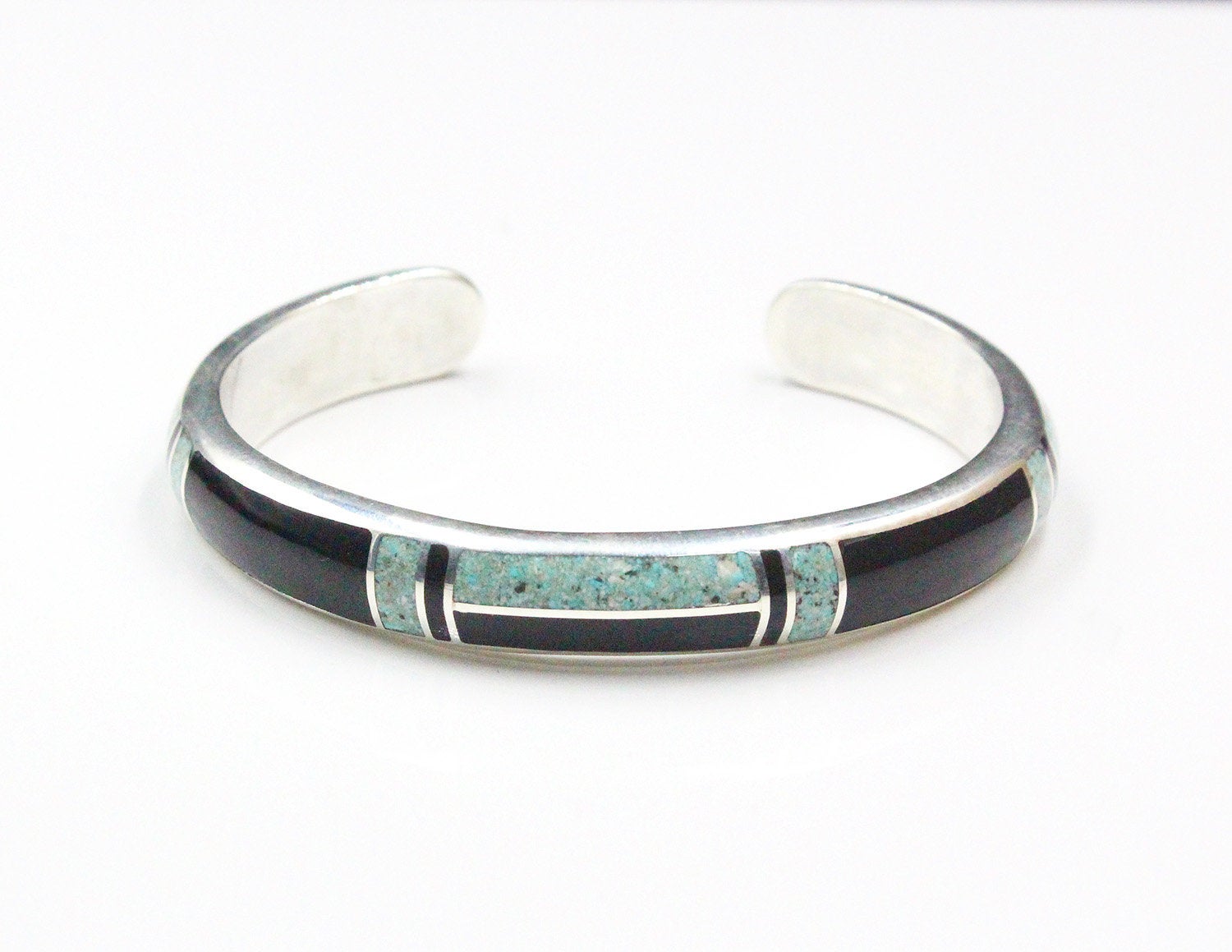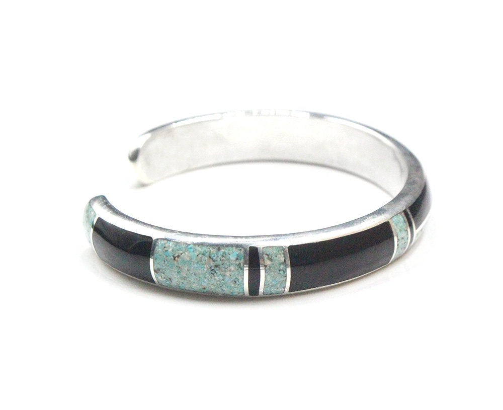 This cuff bracelet is made from solid sterling silver with inlaid black onyx and crushed Qinghai jade. The bracelet width is 10mm. The gap is 1.25 inches for a man's size wrist; 1 inch for a woman's size wrist. Select your wrist size from the drop down menu, and we will make your bracelet to fit. At the moment, it takes approximately 2 weeks to make this bracelet.