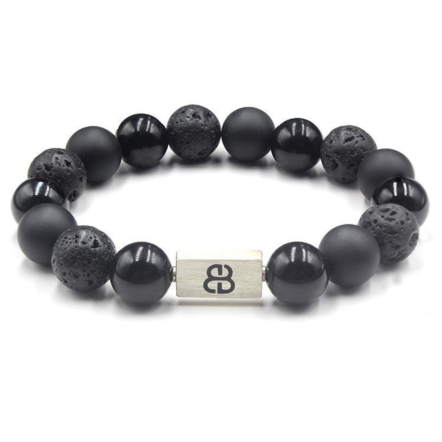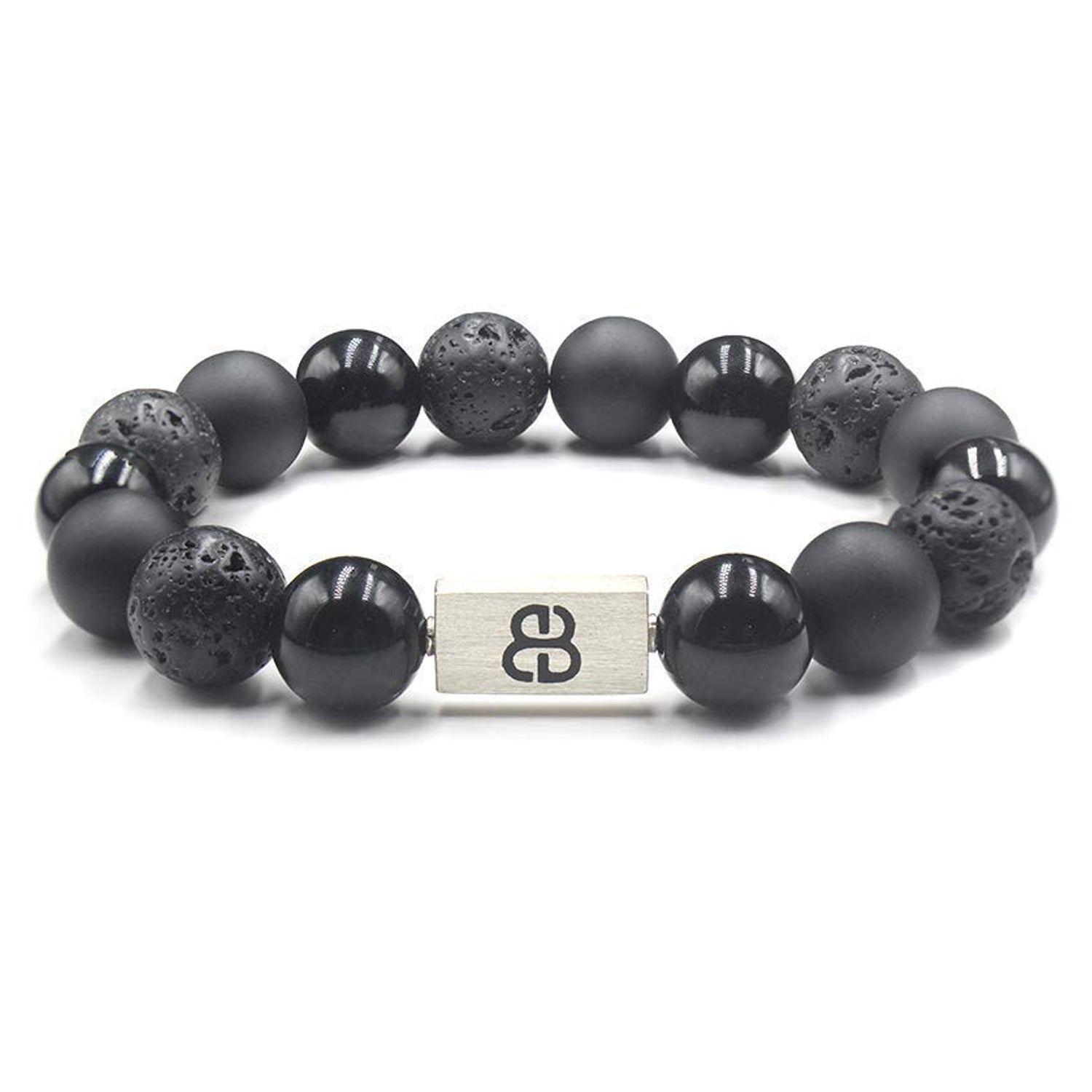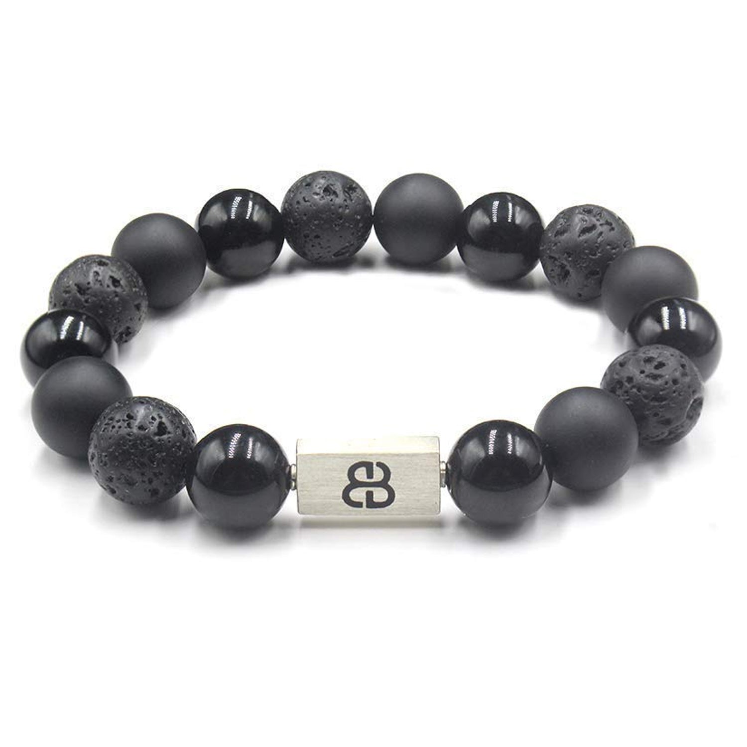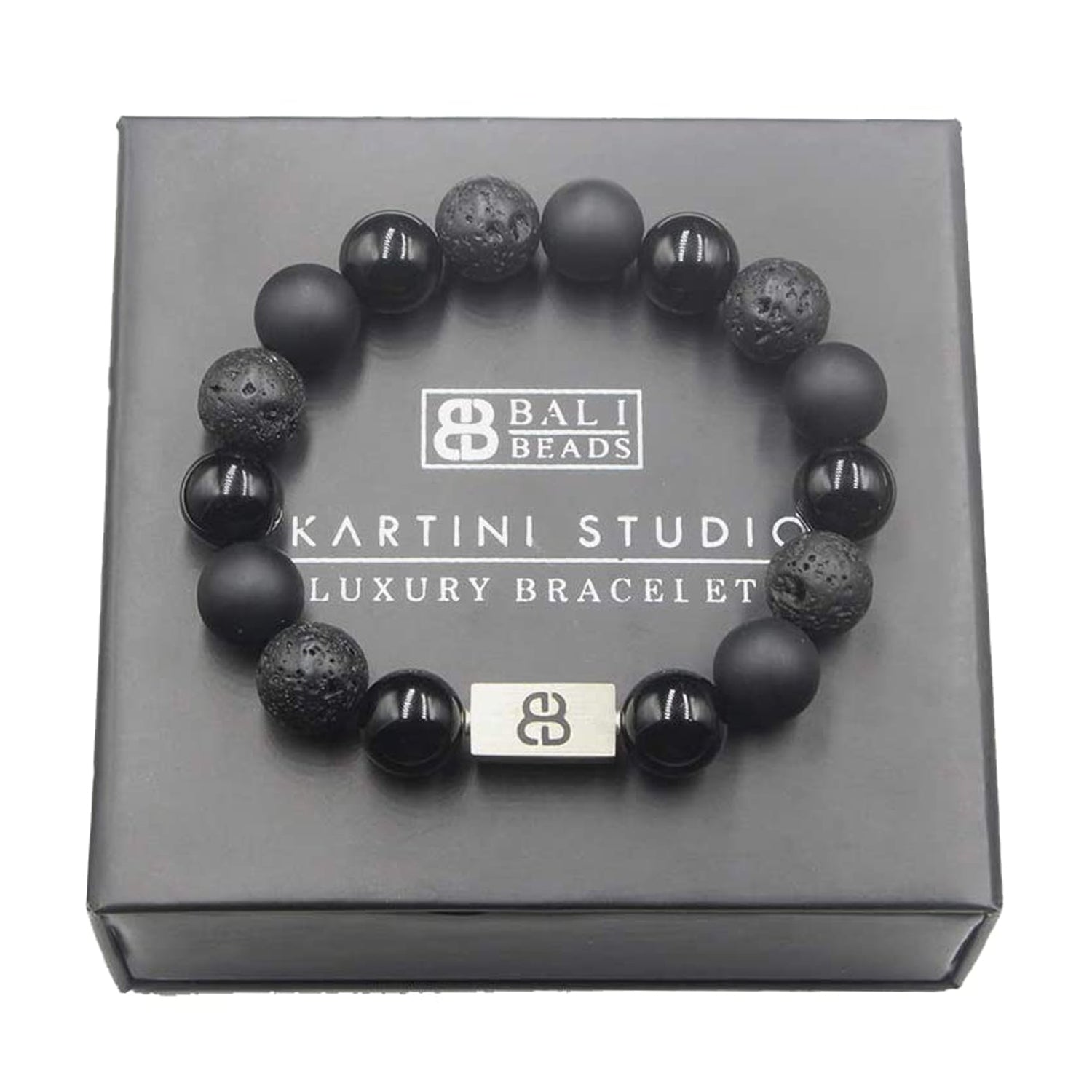 This bracelet features 12mm volcanic lava stone beads, 12mm matte black onyx beads, and 12mm black obsidian beads accented with a 16mm x 8mm brushed sterling silver "Bali Beads" logo bead.