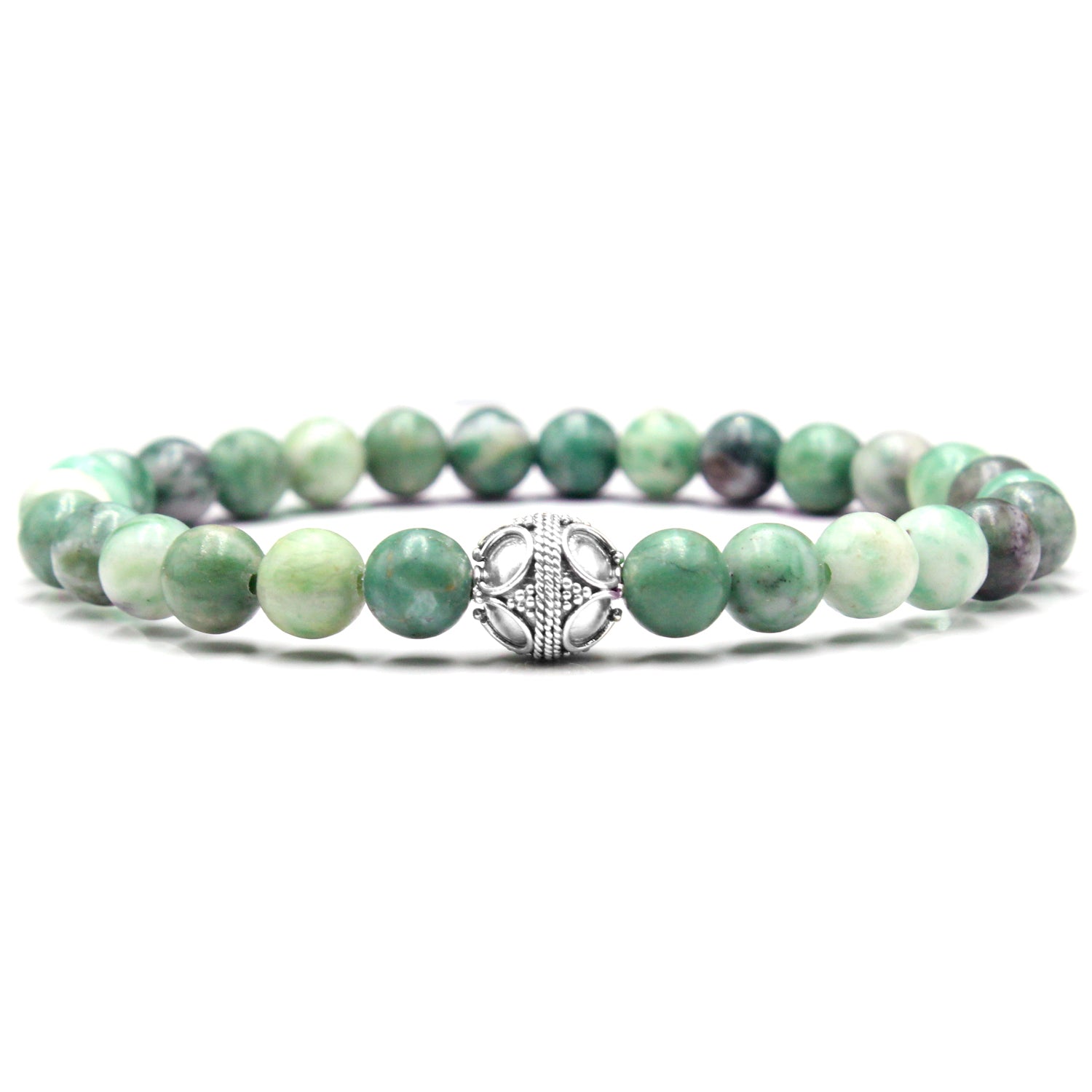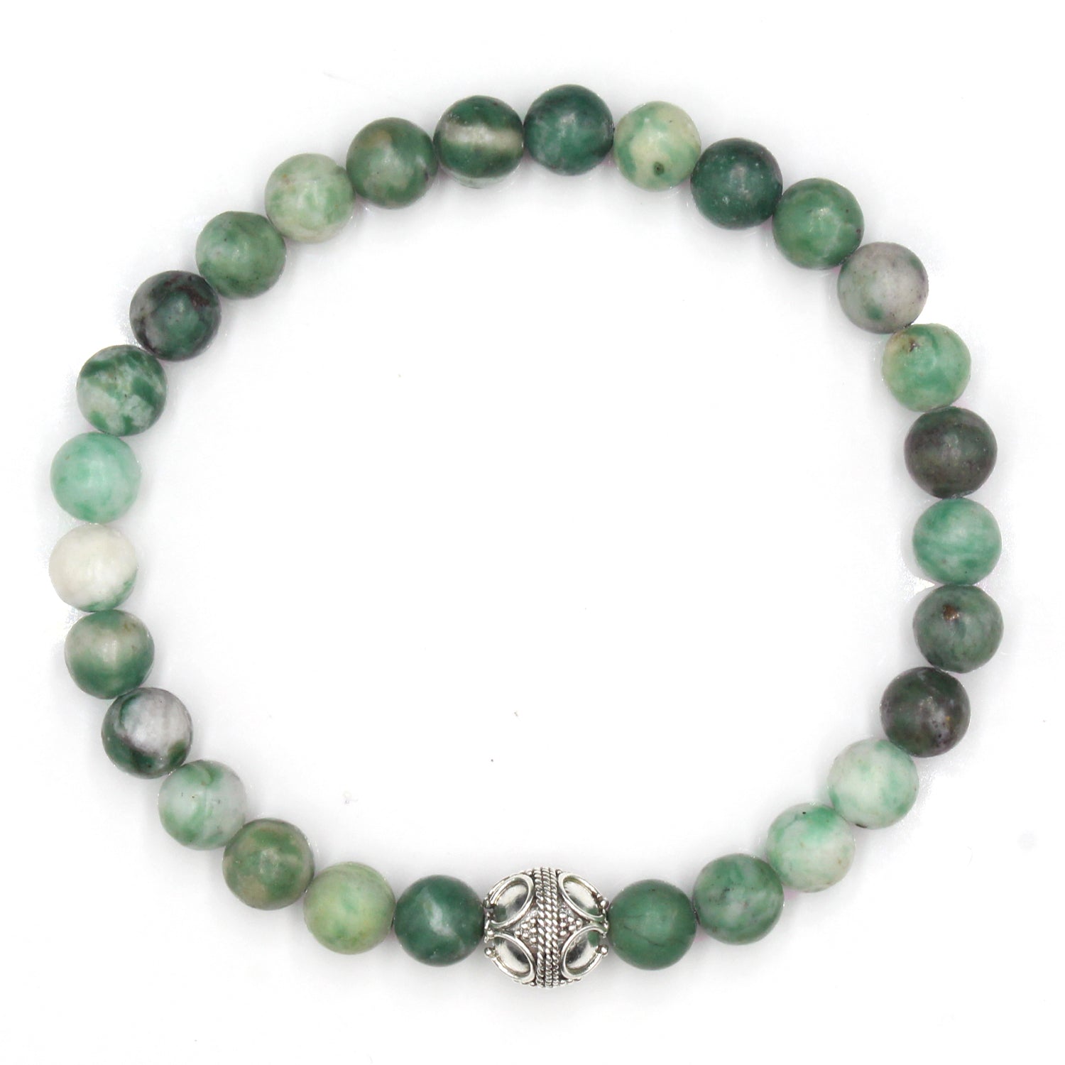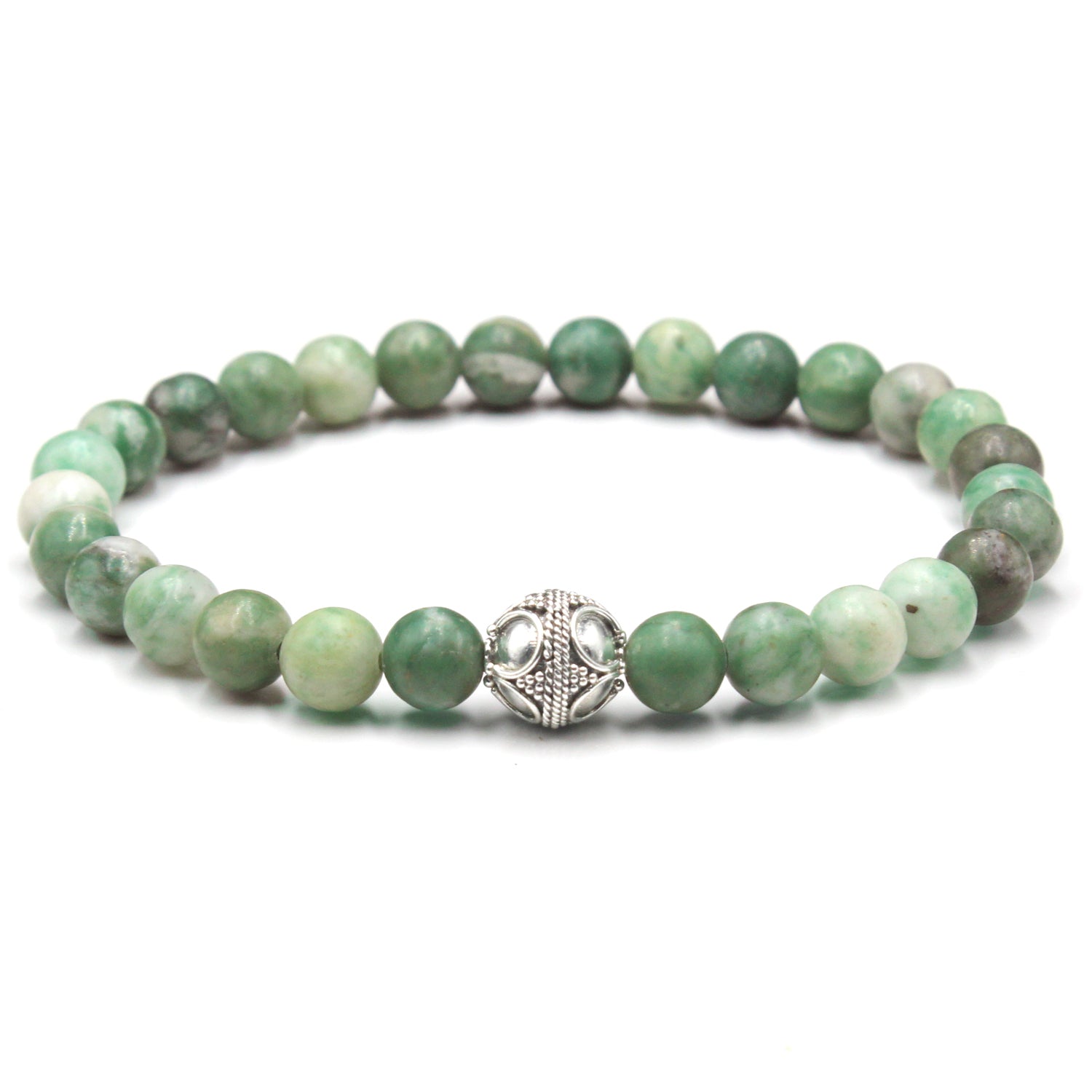 This bracelet features 6mm Qinghai jade beads accented with a handmade 8mm sterling silver Bali Bead.