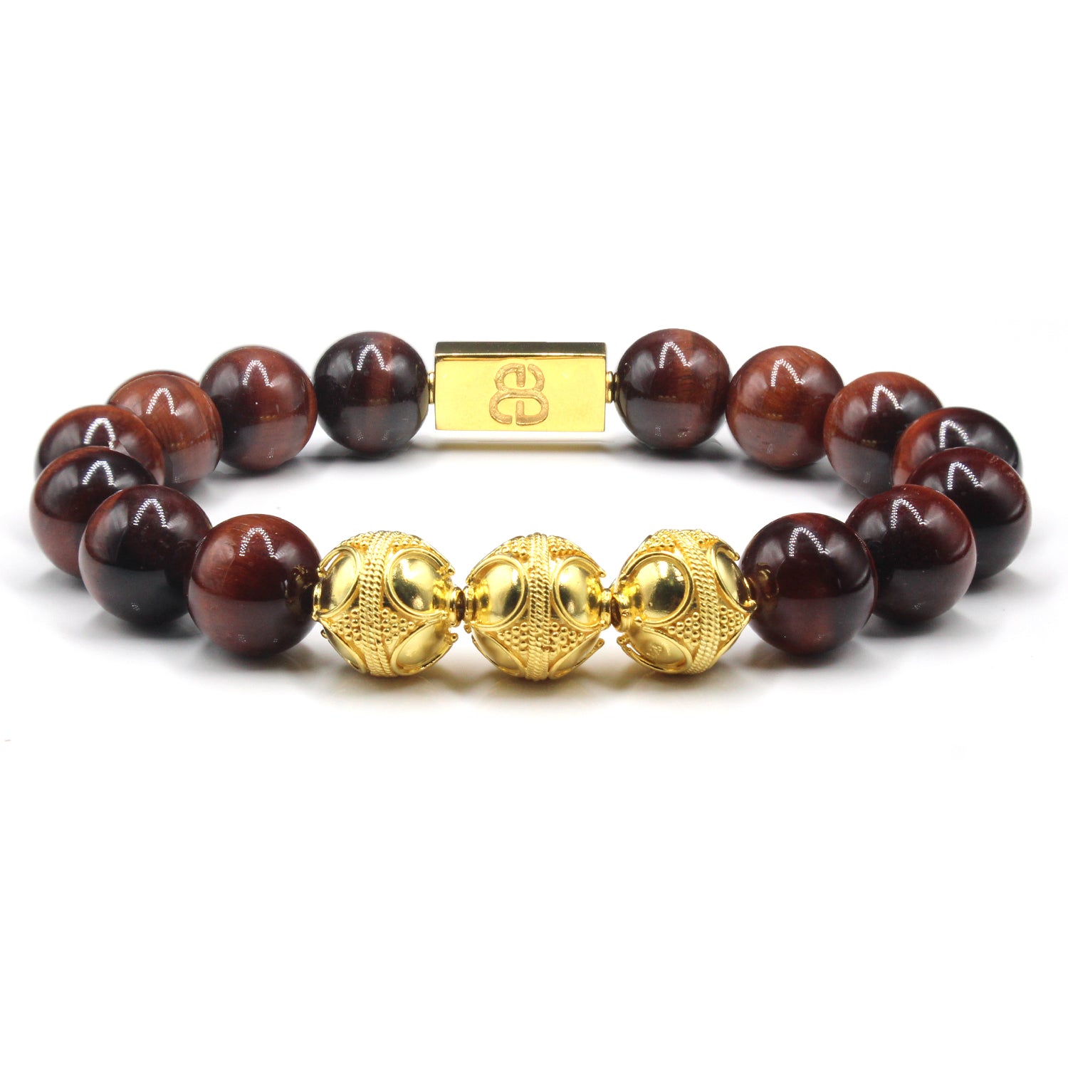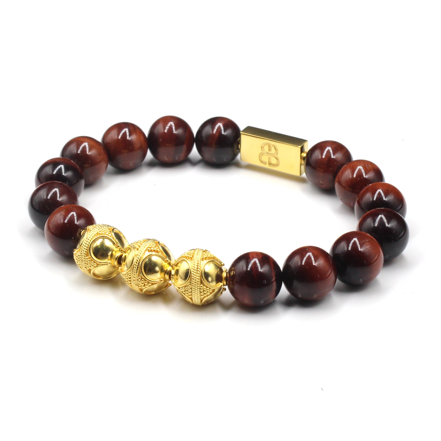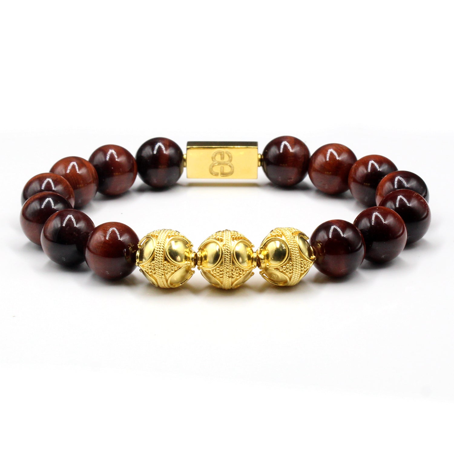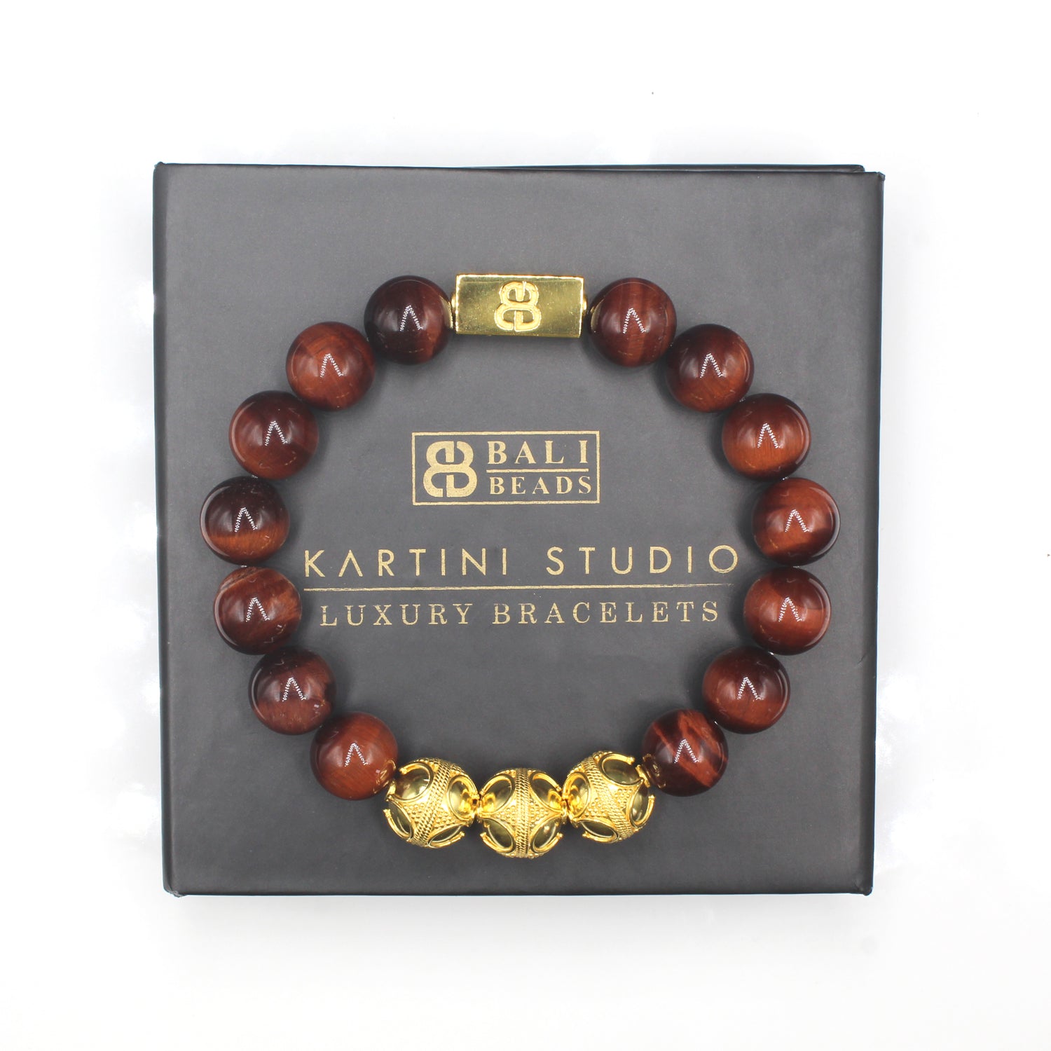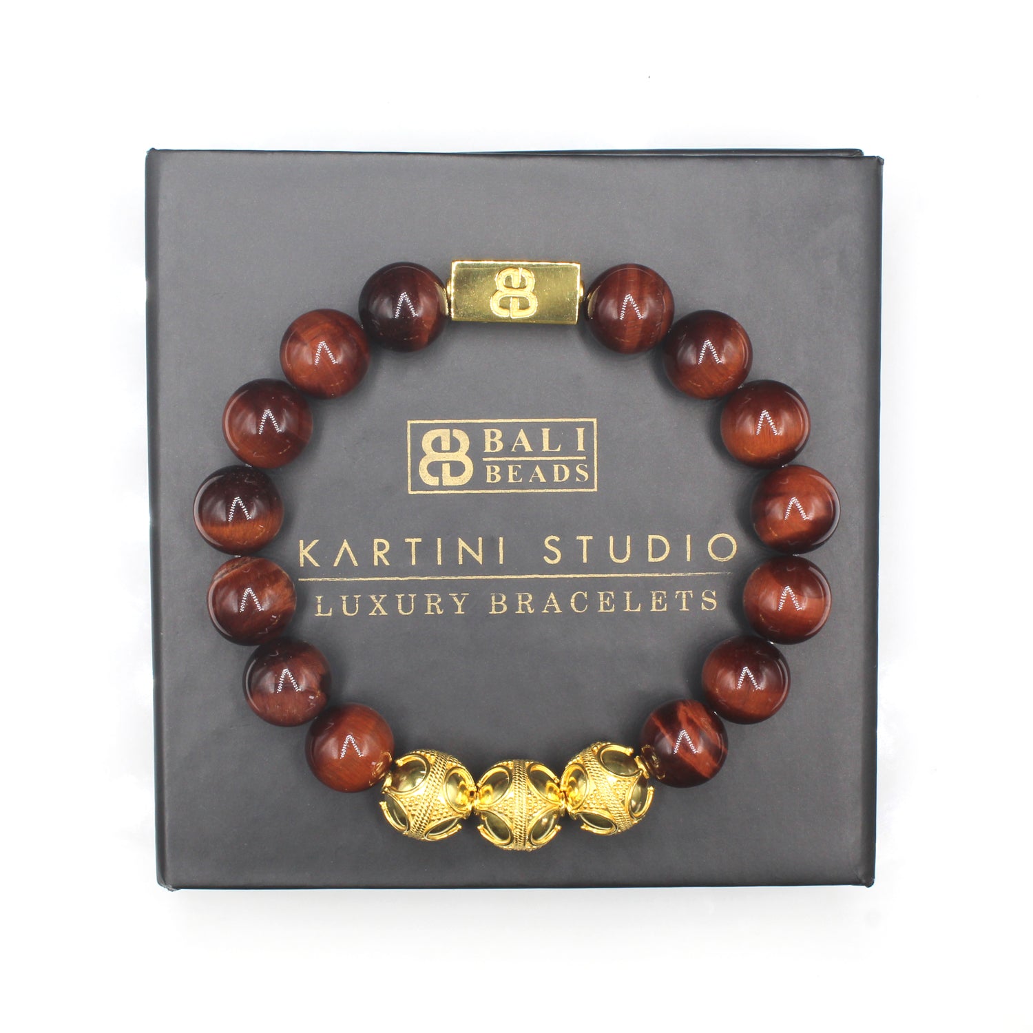 - This premium quality men’s luxury bracelet features 12mm red tiger’s eye gemstone beads accented with three handmade 12mm22 karat gold plated sterling silver Bali beads and an exclusive “Bali Beads” logo anchor bead.