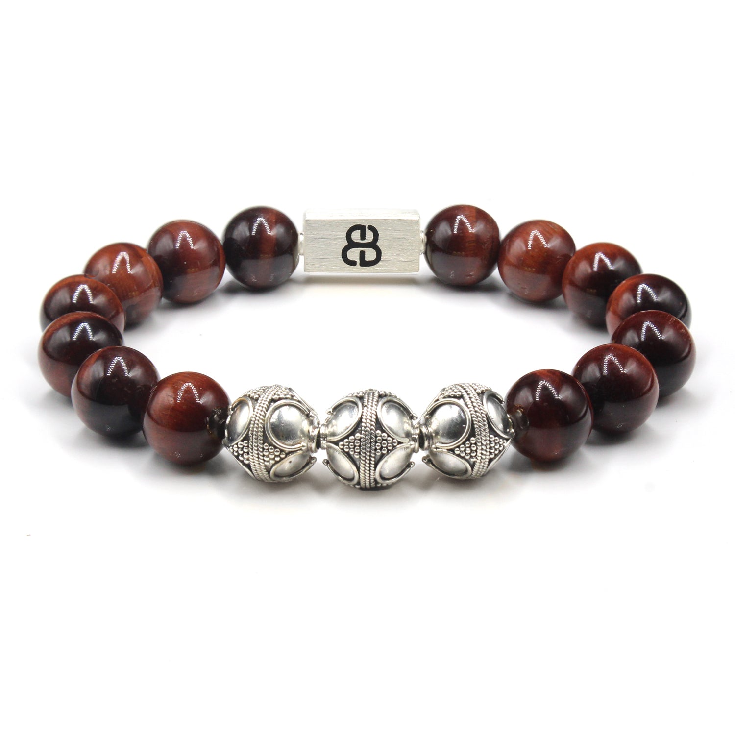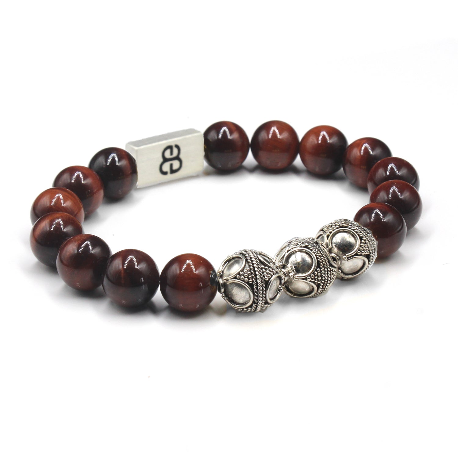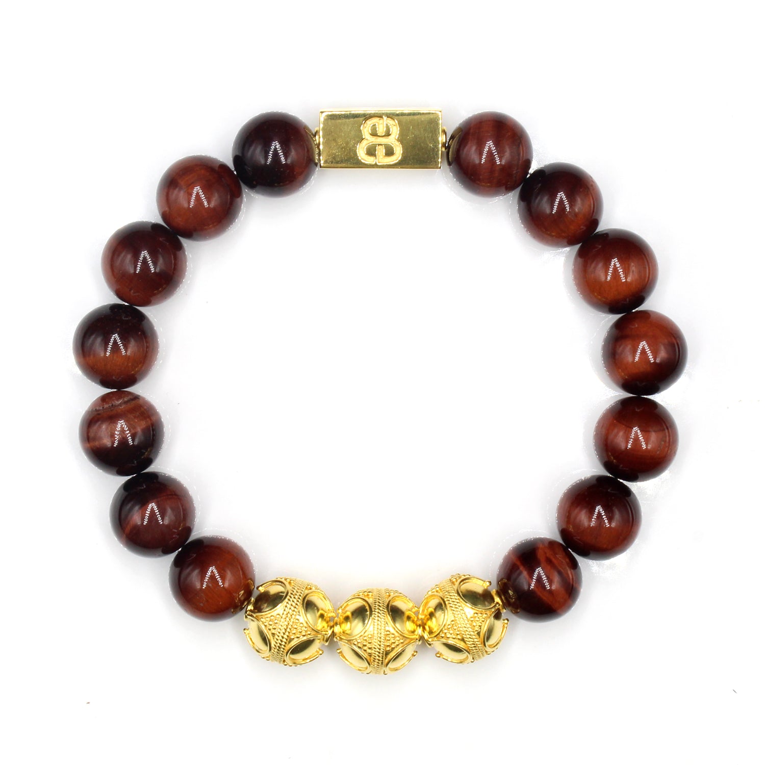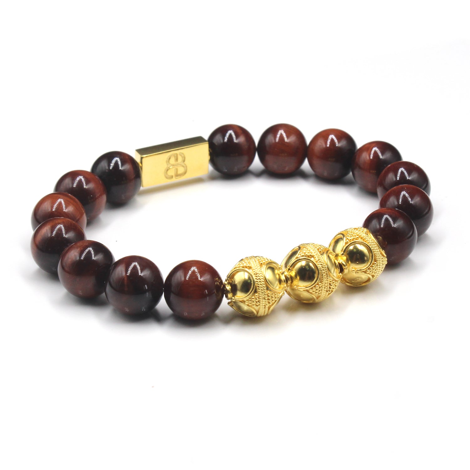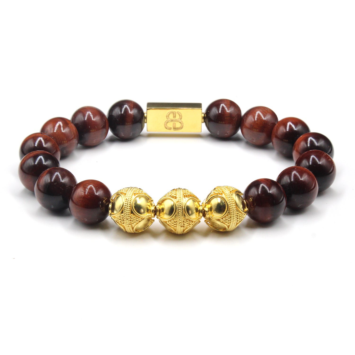 - This premium quality men’s luxury bracelet features 12mm red tiger’s eye gemstone beads accented with three handmade 12mm22 karat gold plated sterling silver Bali beads and an exclusive “Bali Beads” logo anchor bead.