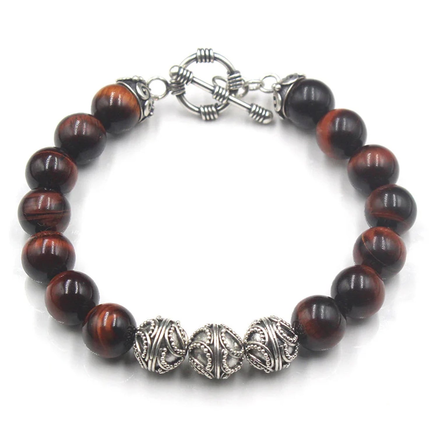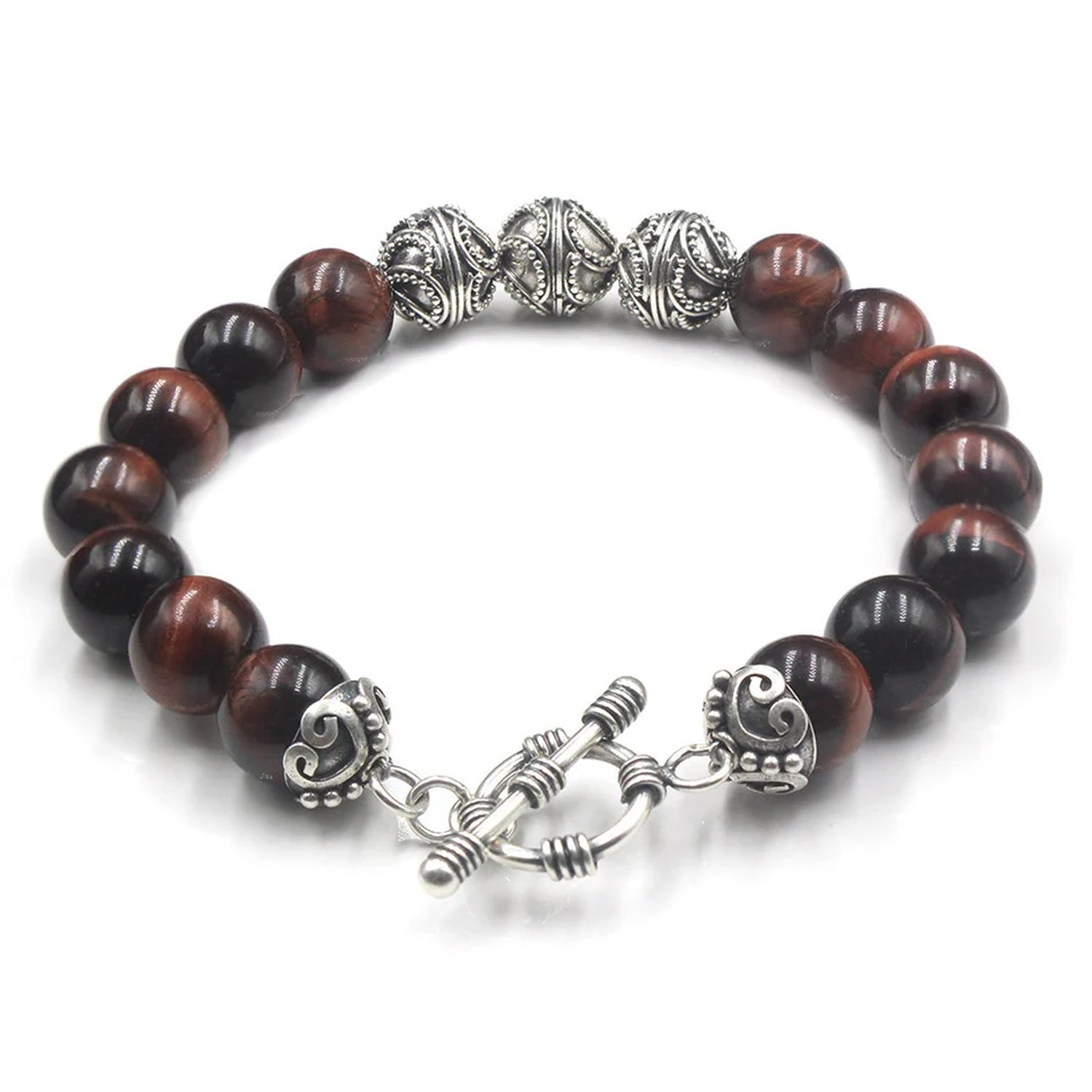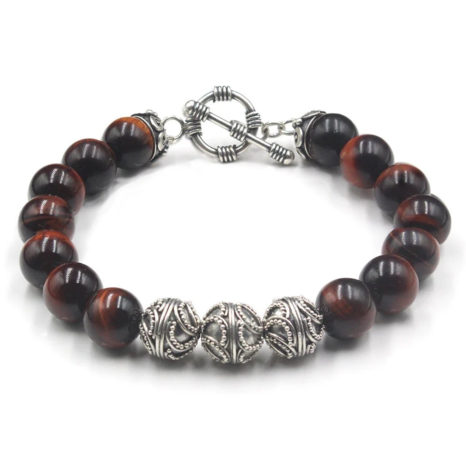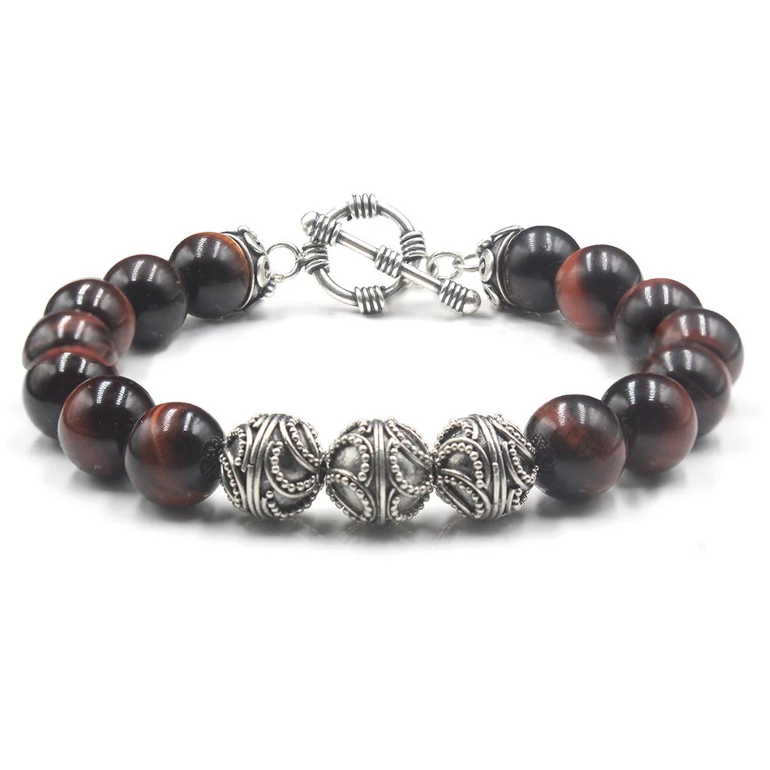 This bracelet features 10mm Grade A red tiger's eye stone beads accented with three handmade 10mm sterling silver Bali beads and two sterling silver bead caps.