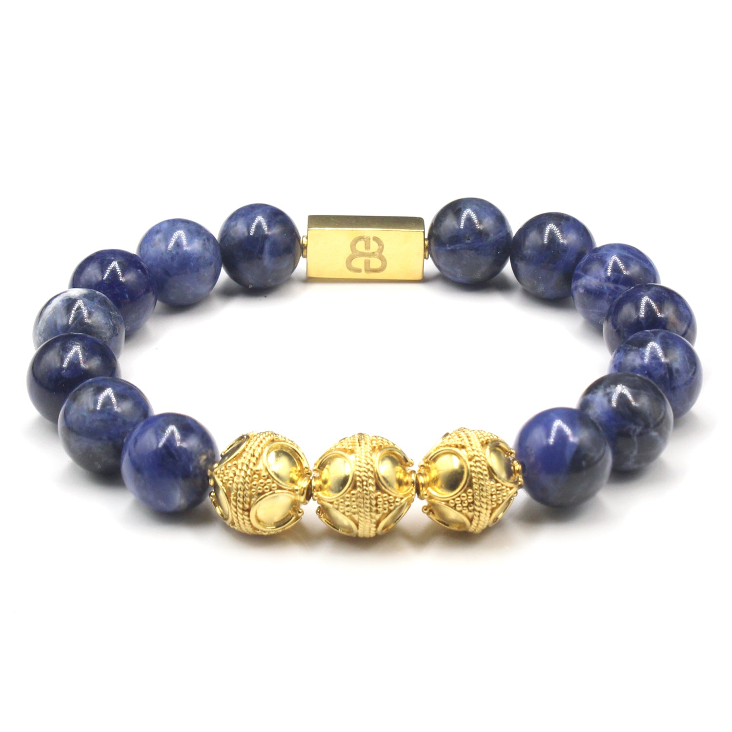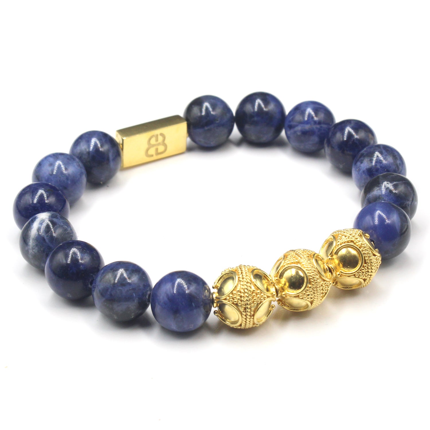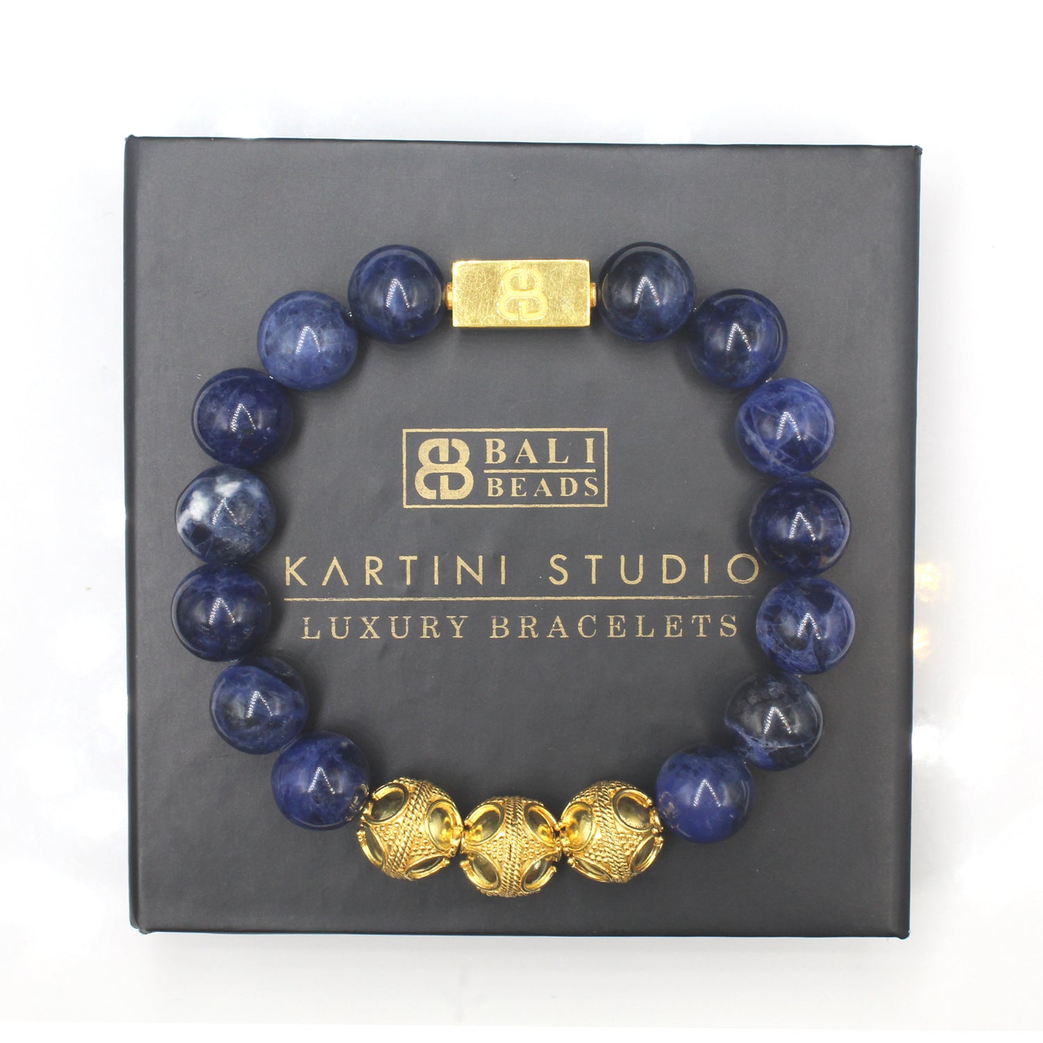 This bracelet features 12mm sodalite beads accented with three genuine 12mm 22 karat gold vermeil Bali beads and a 16mm x 8mm gold vermeil "Bali Beads" logo bead. "Vermeil" jewelry is extra thick high karat gold plated on sterling silver.