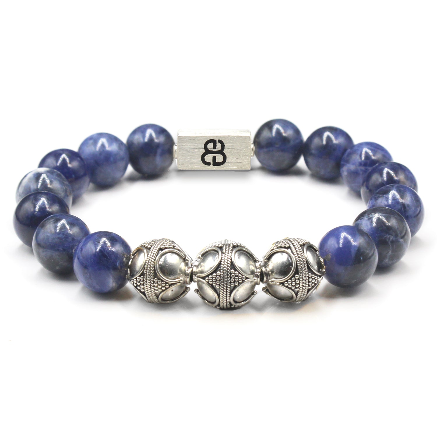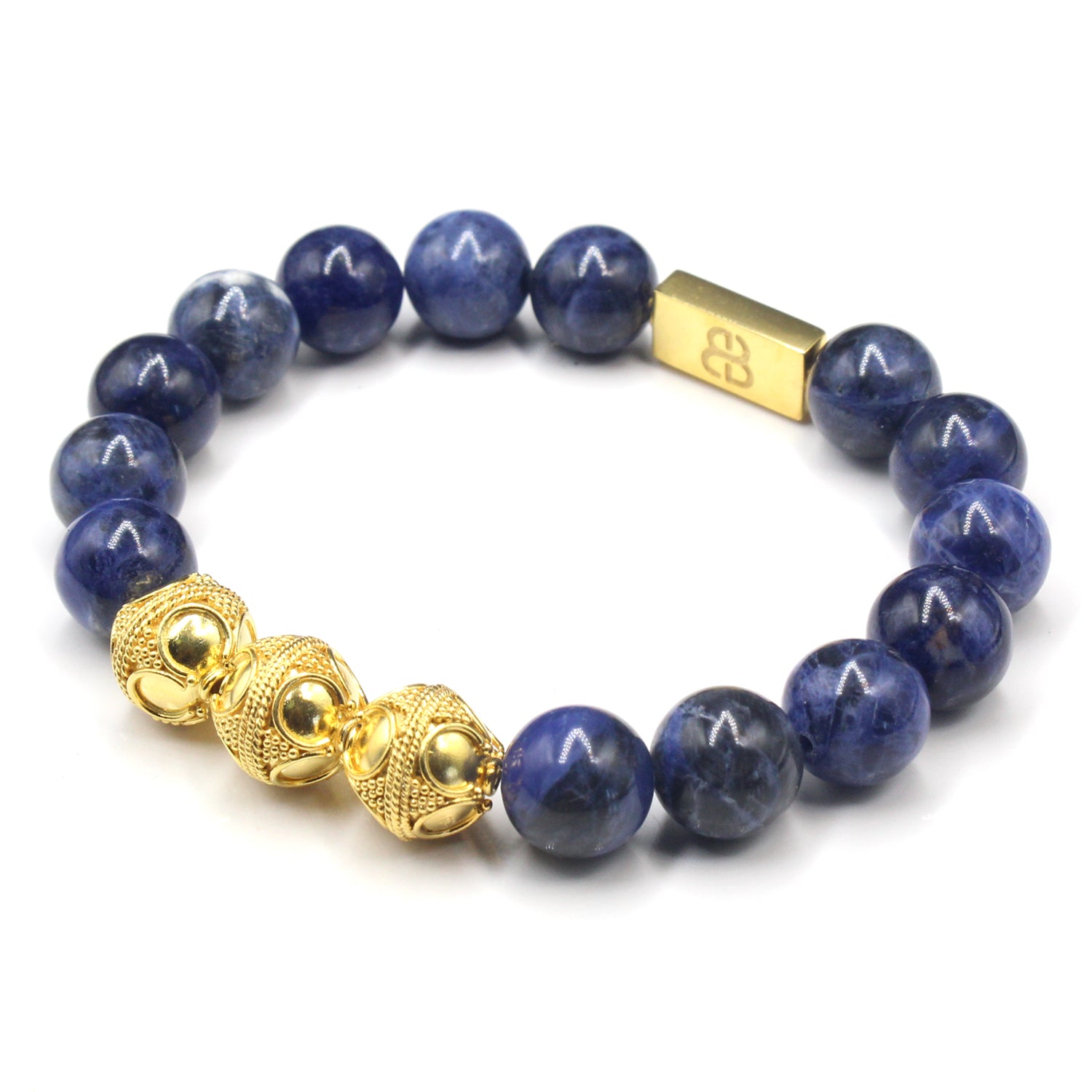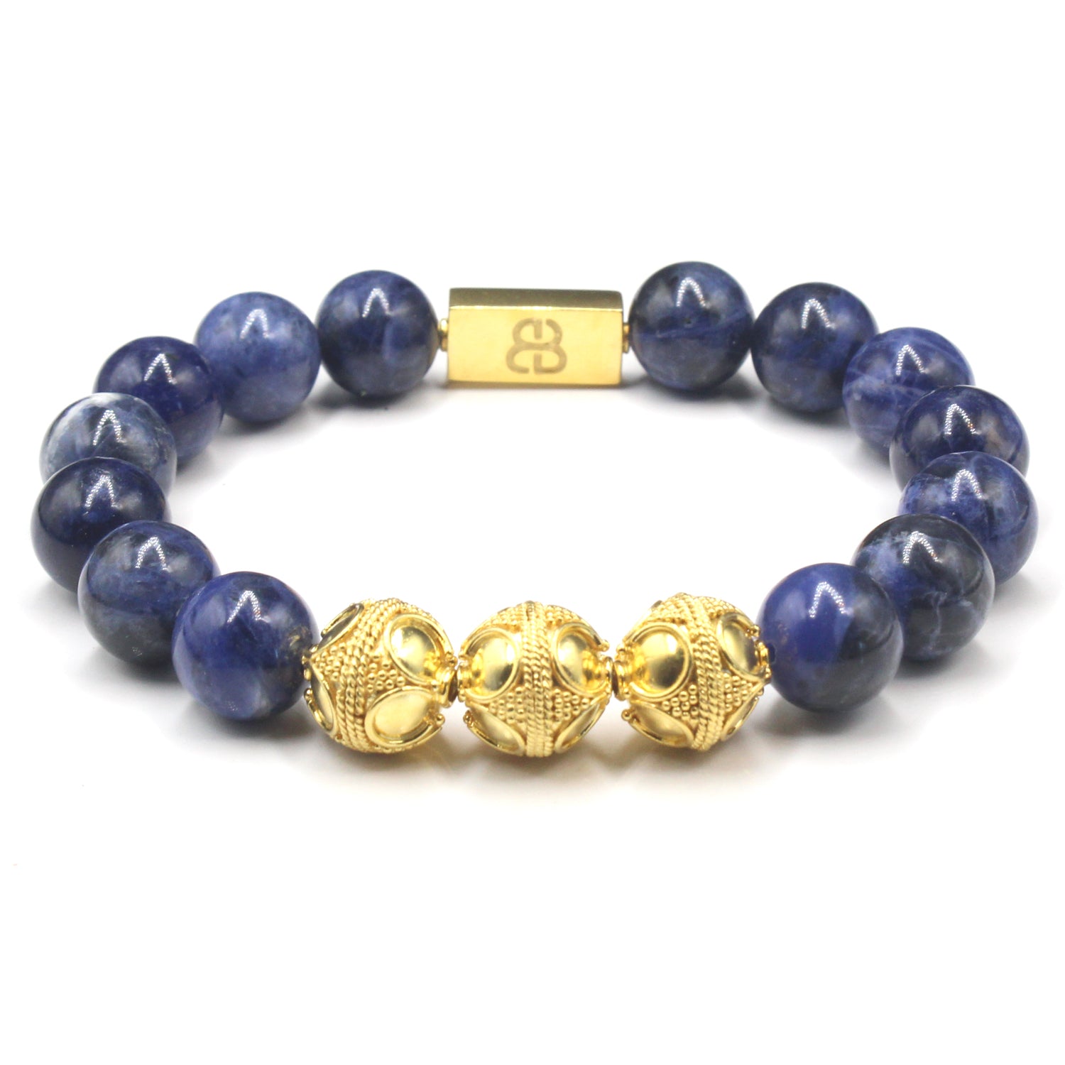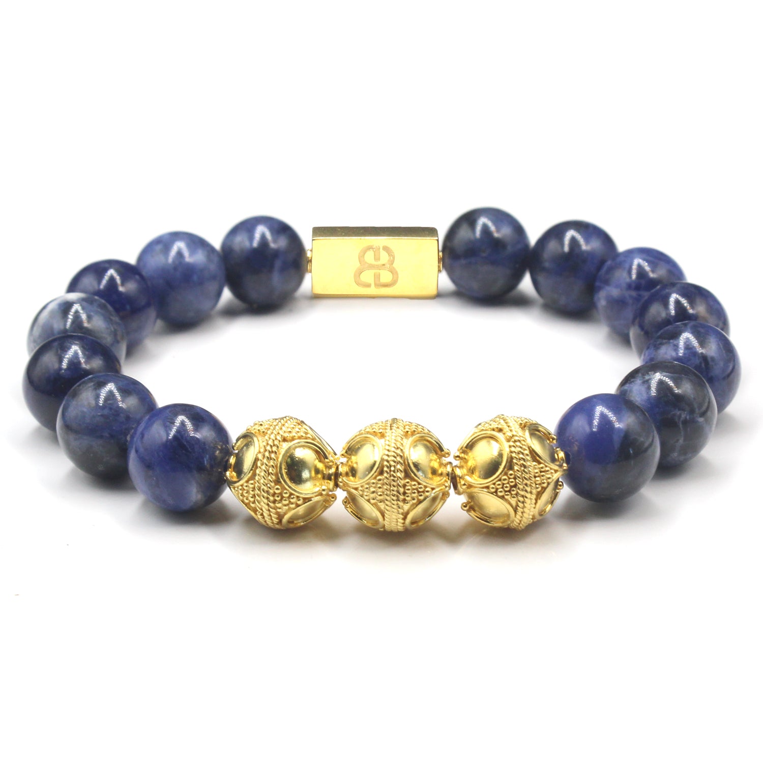 This bracelet features 12mm sodalite beads accented with three genuine 12mm 22 karat gold vermeil Bali beads and a 16mm x 8mm gold vermeil "Bali Beads" logo bead. "Vermeil" jewelry is extra thick high karat gold plated on sterling silver.