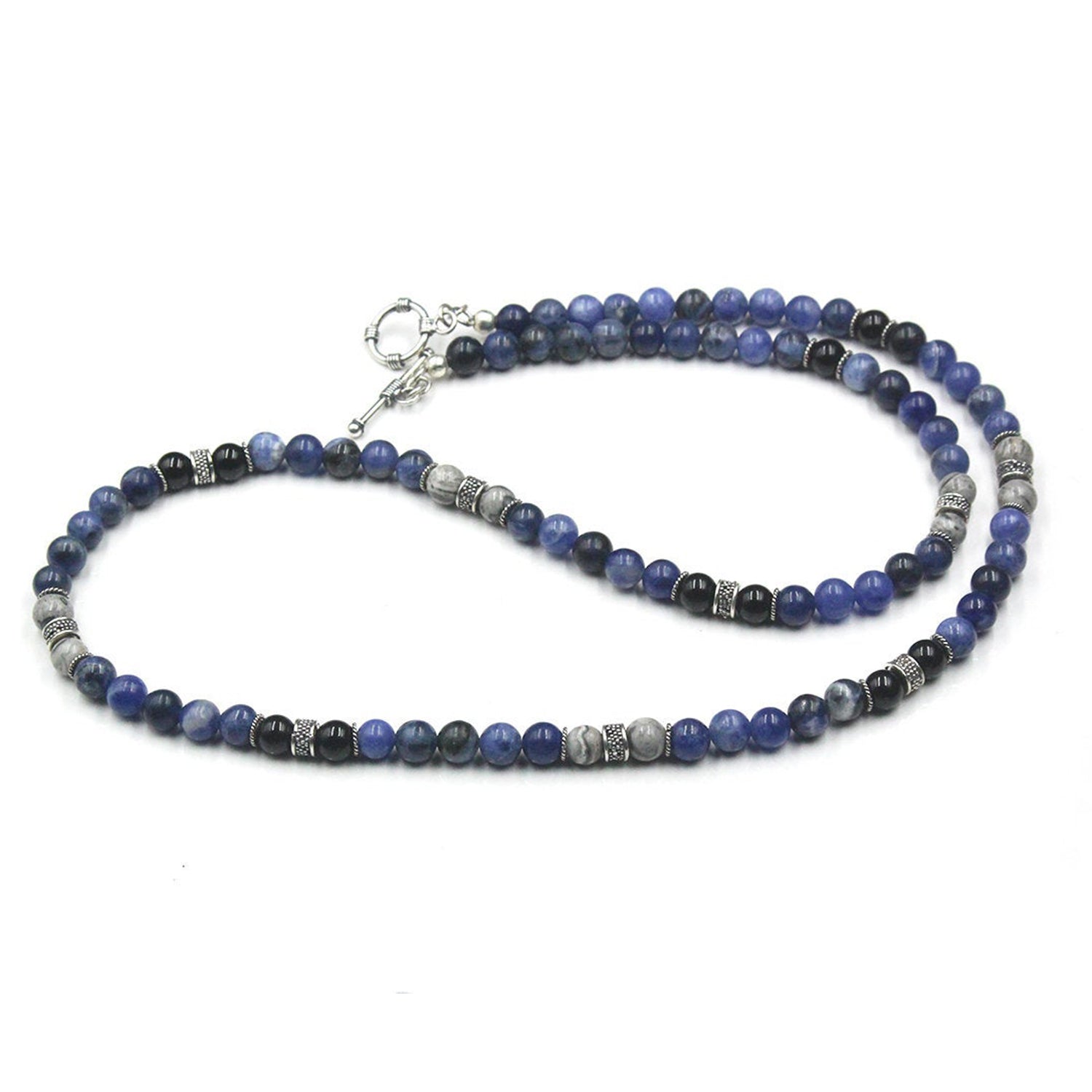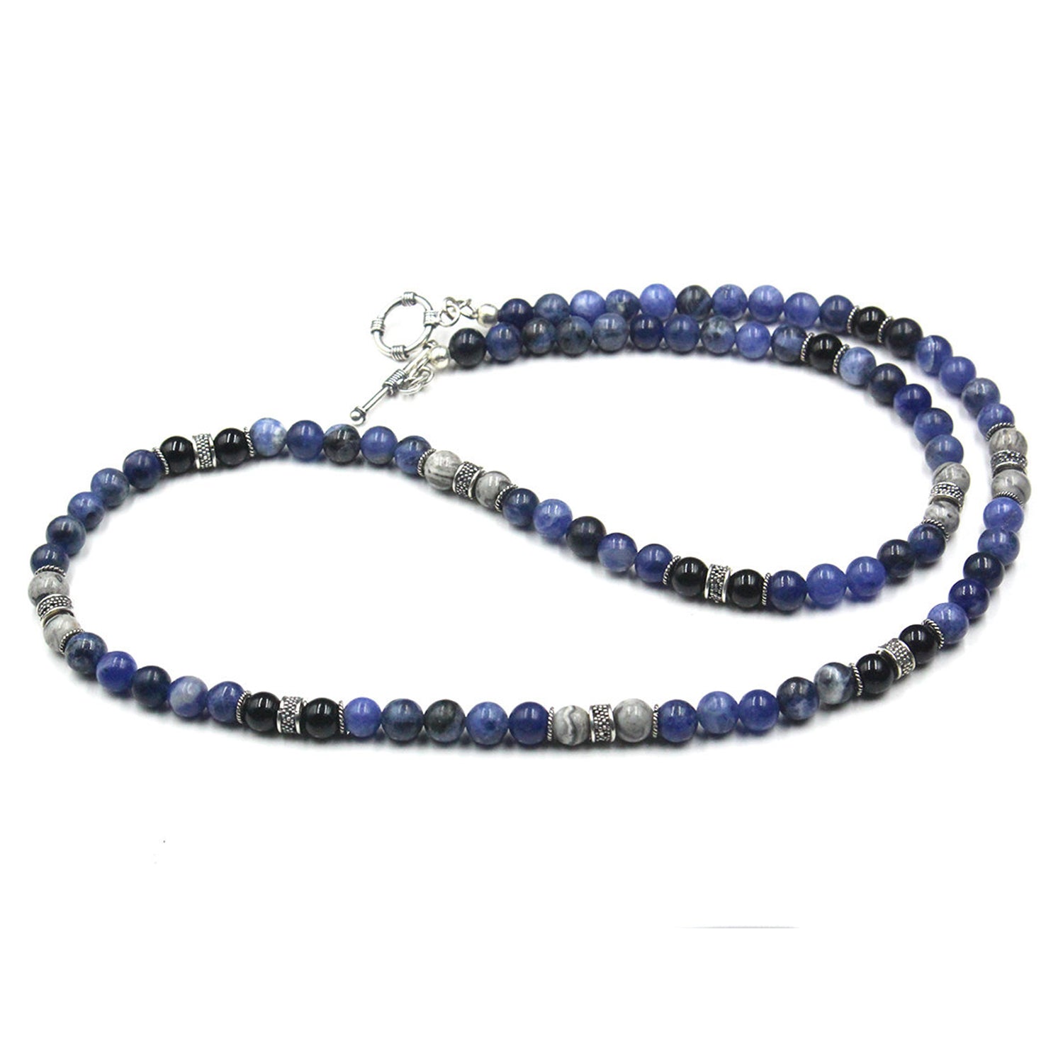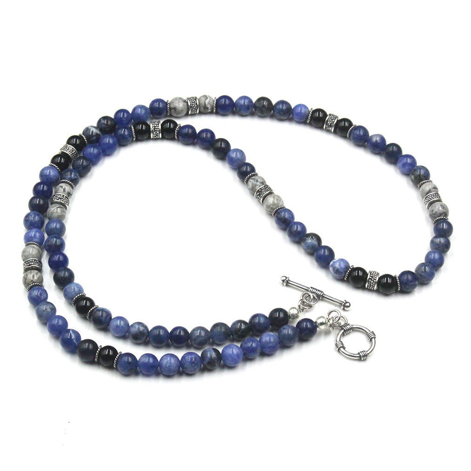 This necklace features 6mm sodalite, black onyx, and grey jasper stones beads accented with genuine 5mm sterling silver rondelle beads. The necklace fastens with a sterling silver toggle clasp. As pictured, the length is 20 inches. Choose your own size from the drop down menu. Your necklace comes in a handmade pouch.