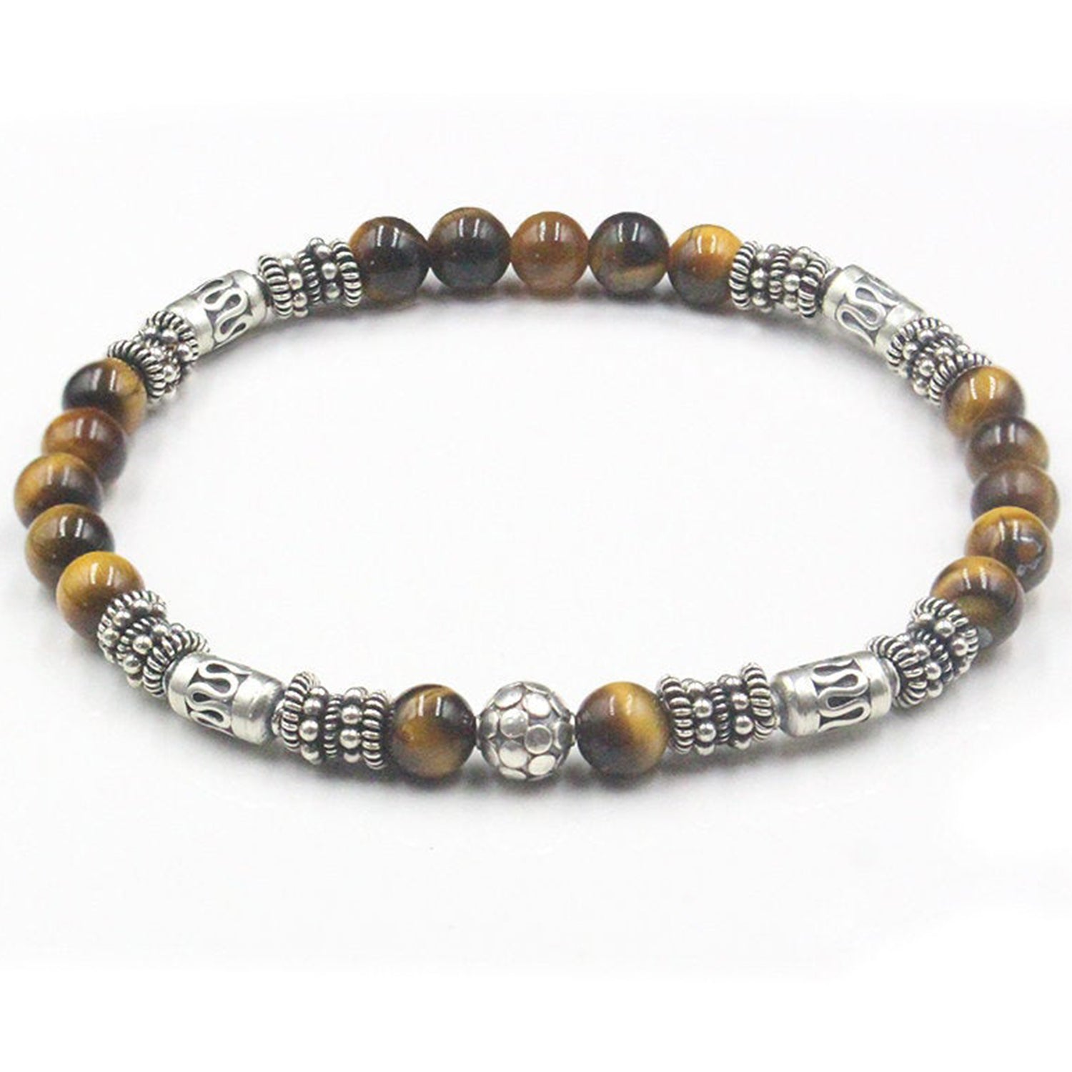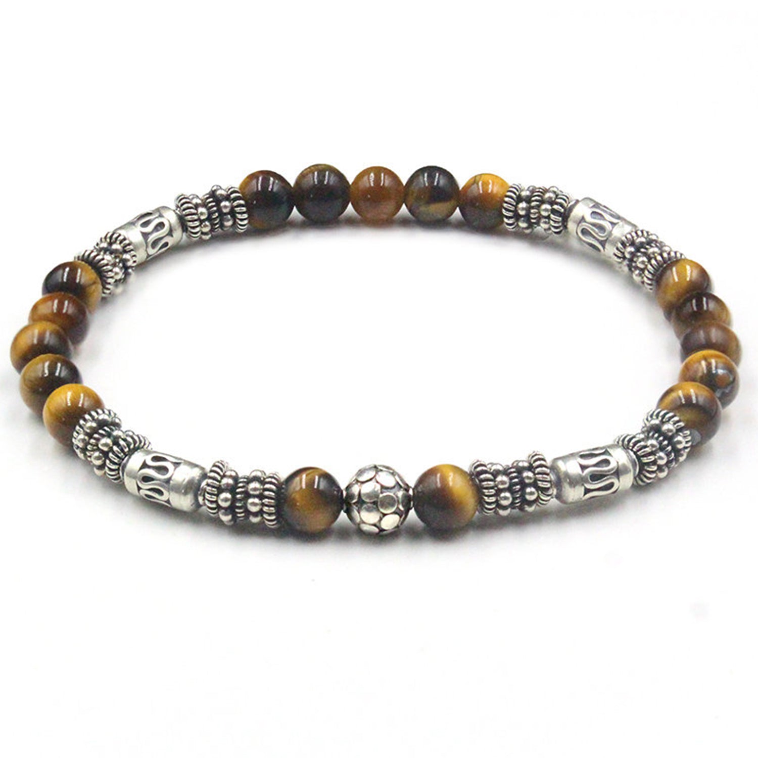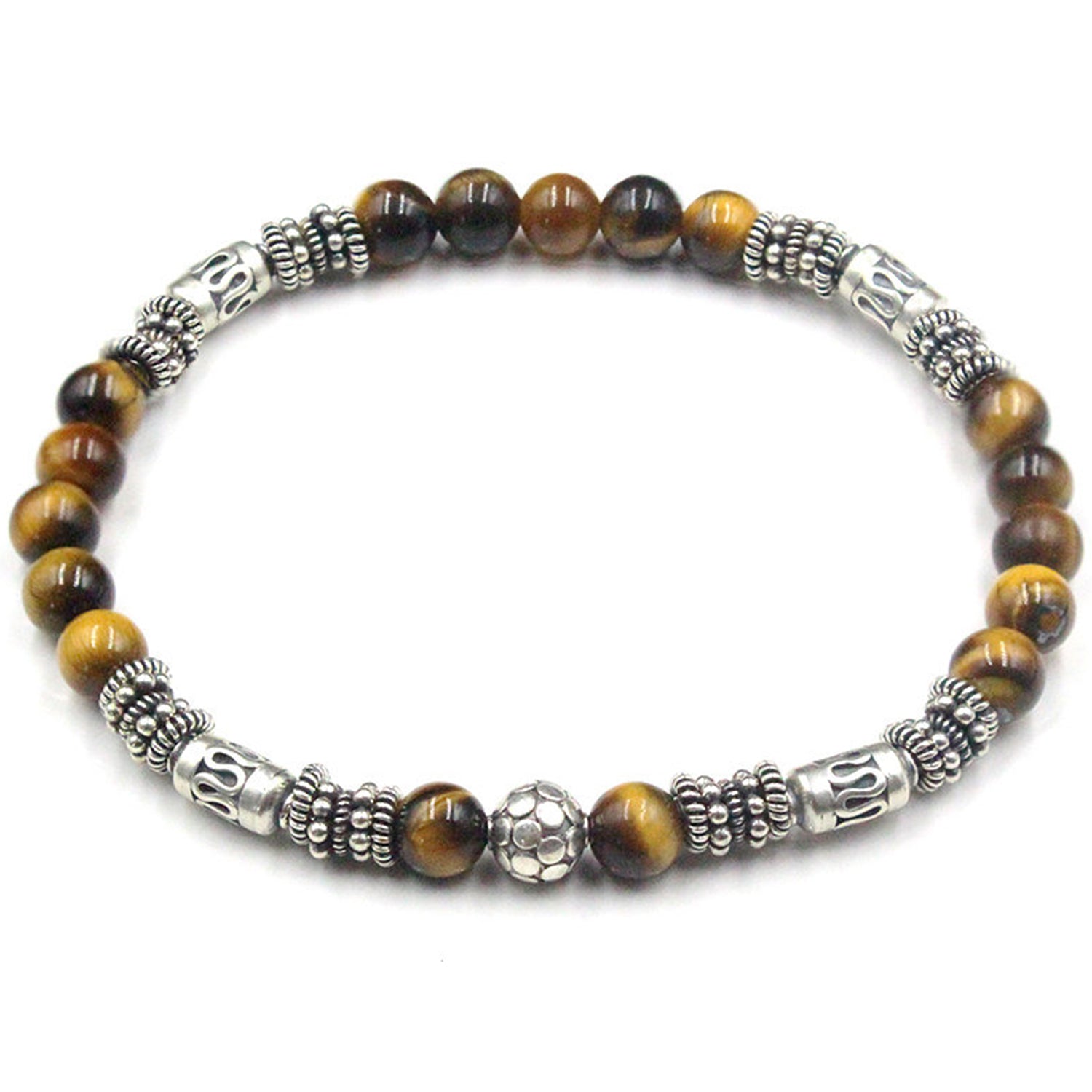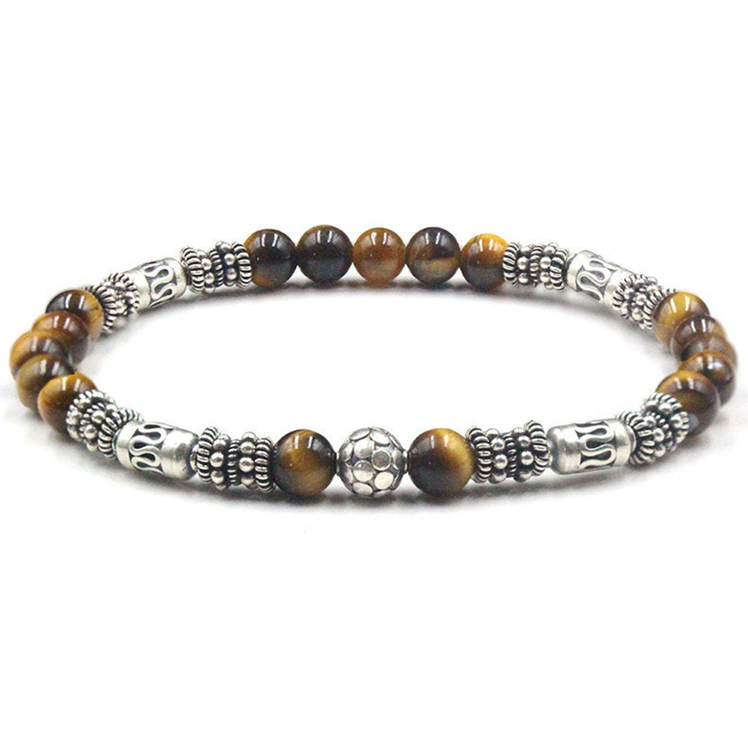 This bracelet features 6mm Grade AAA Tiger's Eye stone beads accented with a selection of handmade sterling silver beads and spacers.
