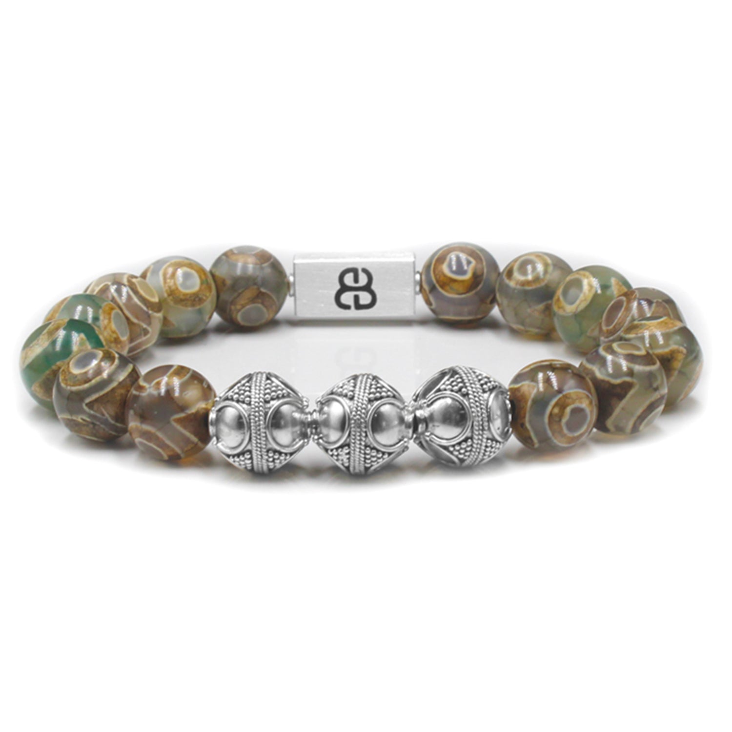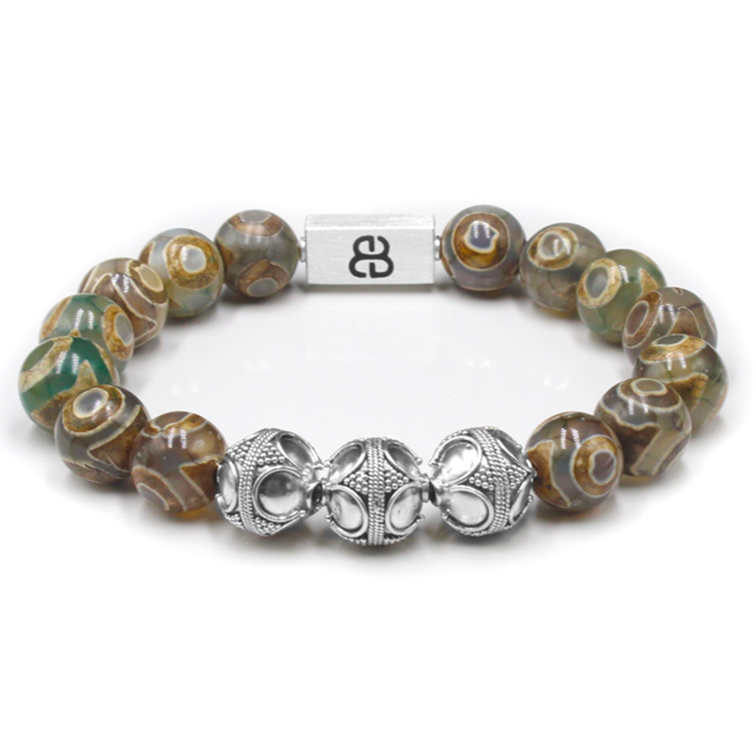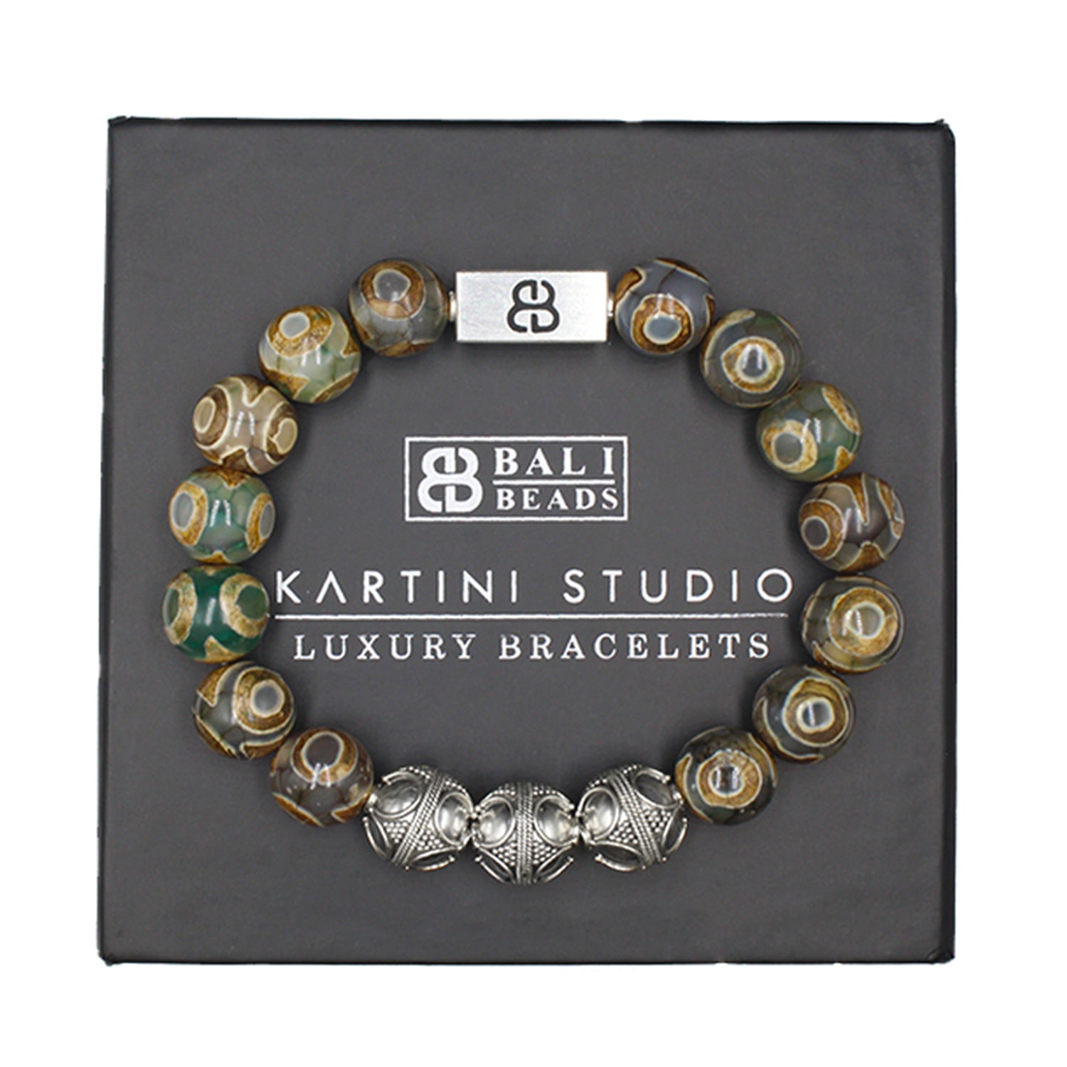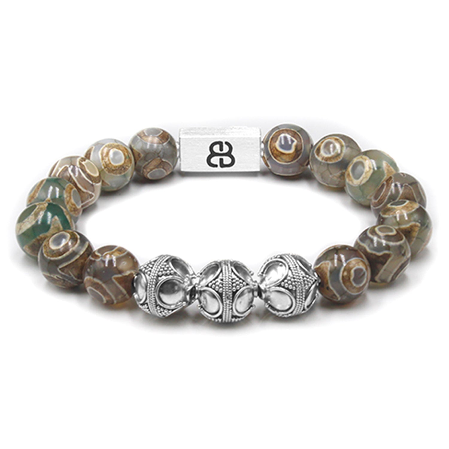 This bracelet features 12mm Tibetan agate beads accented by 12mm oxidized sterling silver Bali beads and a 16mm x 8mm sterling silver "Bali Beads" logo bead.